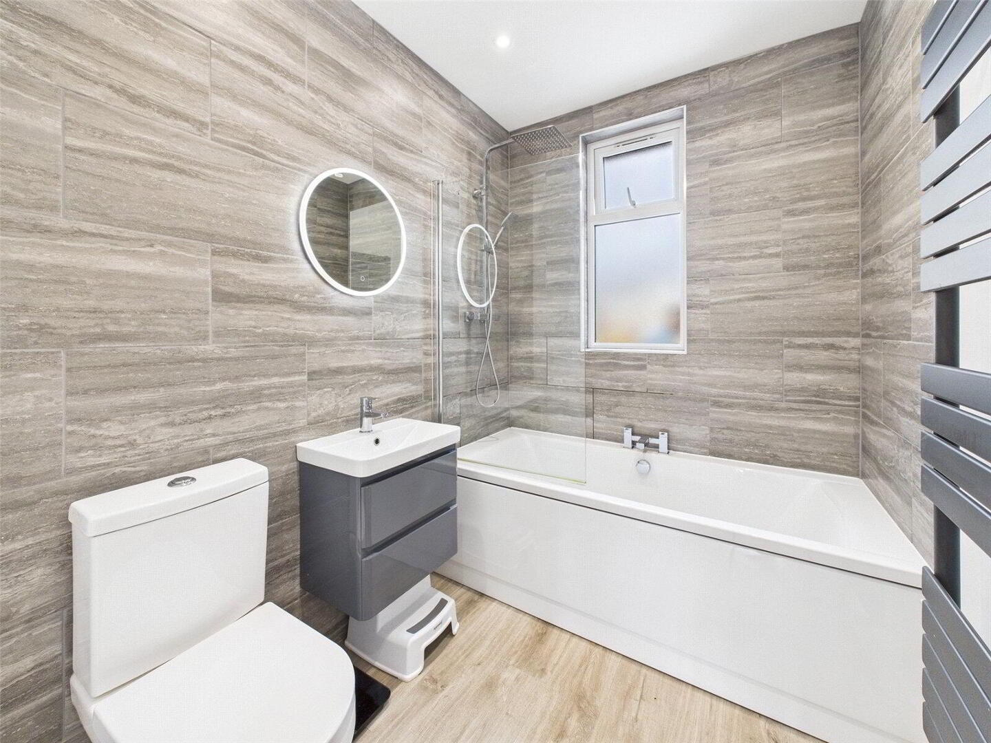 Further along the hallway is a modern bathroom suite, complete with a low-flush W.C., wall-mounted hand basin, heated towel rail, and a shower-over-bath arrangement – all finished to a high standard.