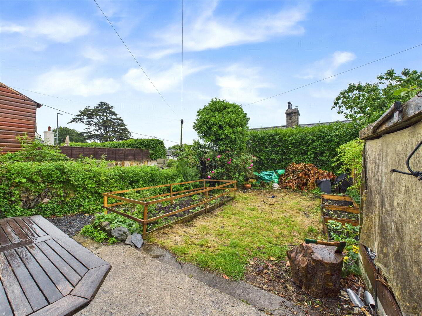 • South-facing garden with sun terrace, lawn, raised beds & patio