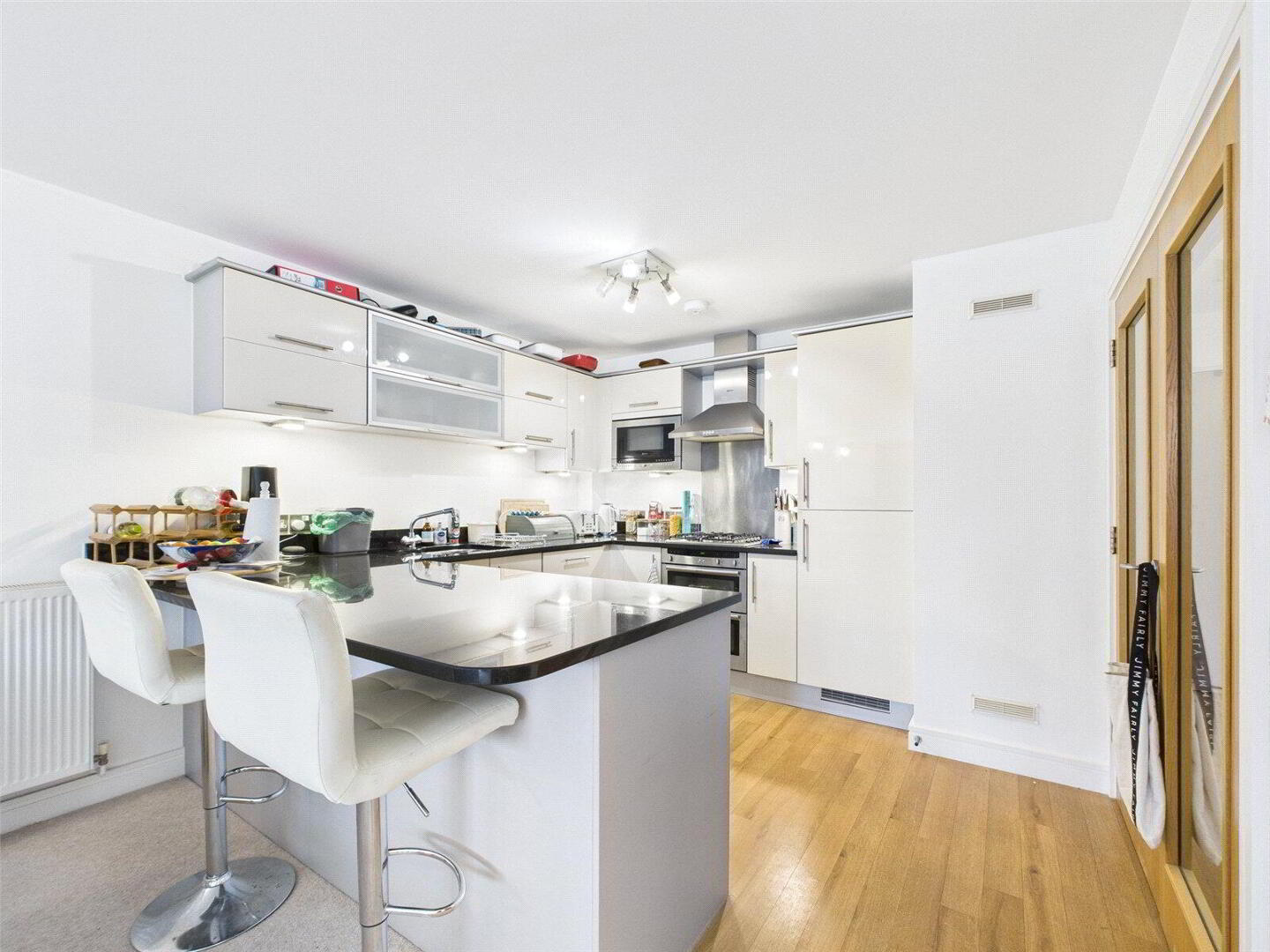 At the heart of the apartment is the spacious open-plan living, dining, and kitchen area, designed for both relaxation and entertaining. The space is filled with natural light from estuary-facing windows and includes access to the balcony, perfect for outdoor dining or simply enjoying the ever-changing view. The kitchen is well-equipped with integrated appliances, a breakfast bar, and plenty of worktop and cupboard space, making it ideal for social cooking and everyday living.