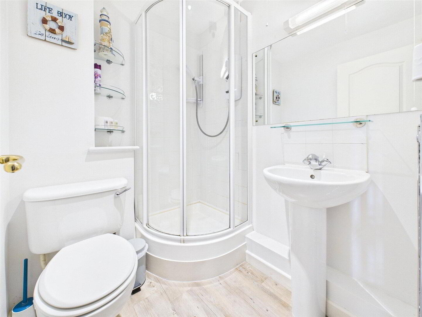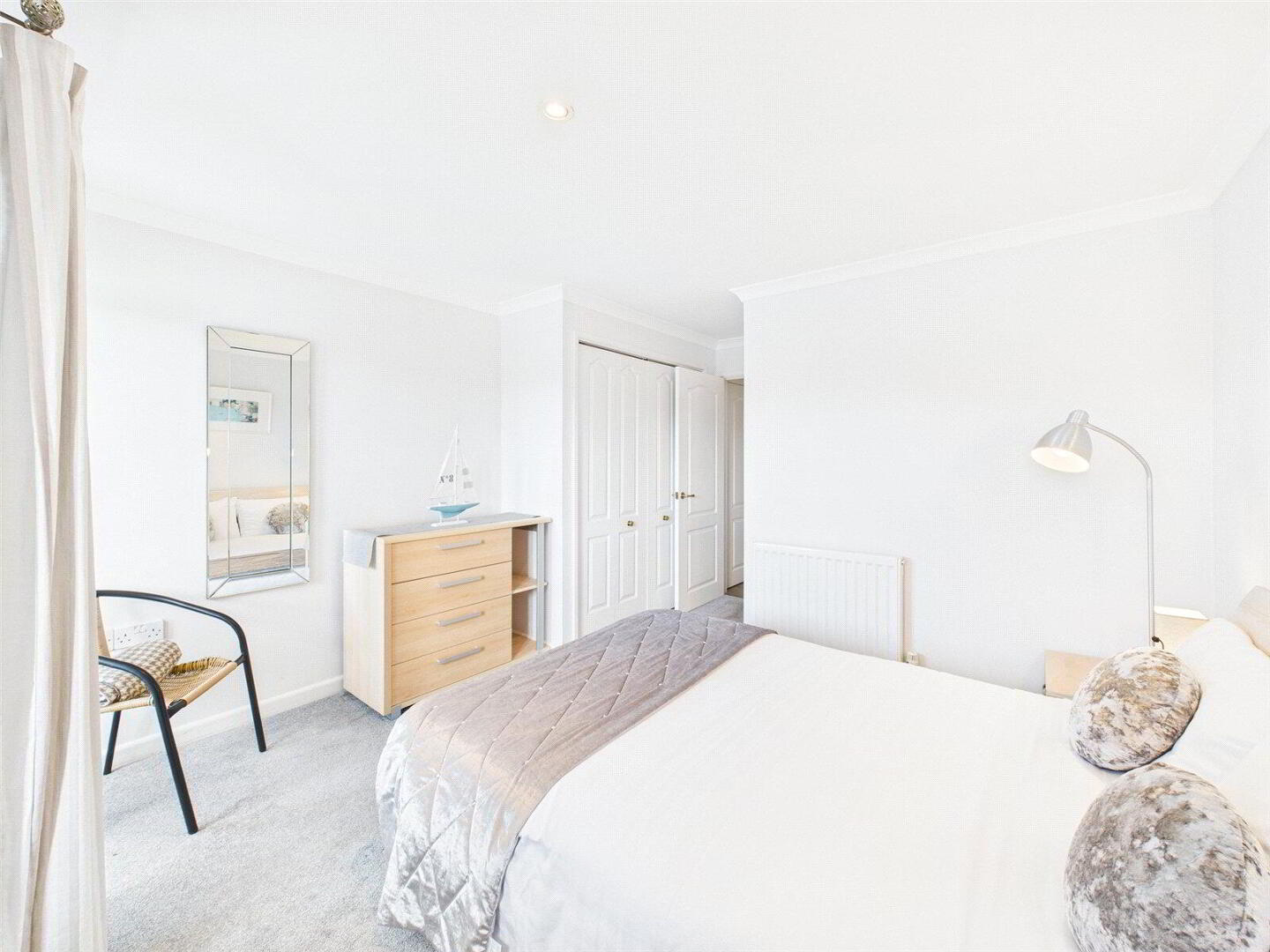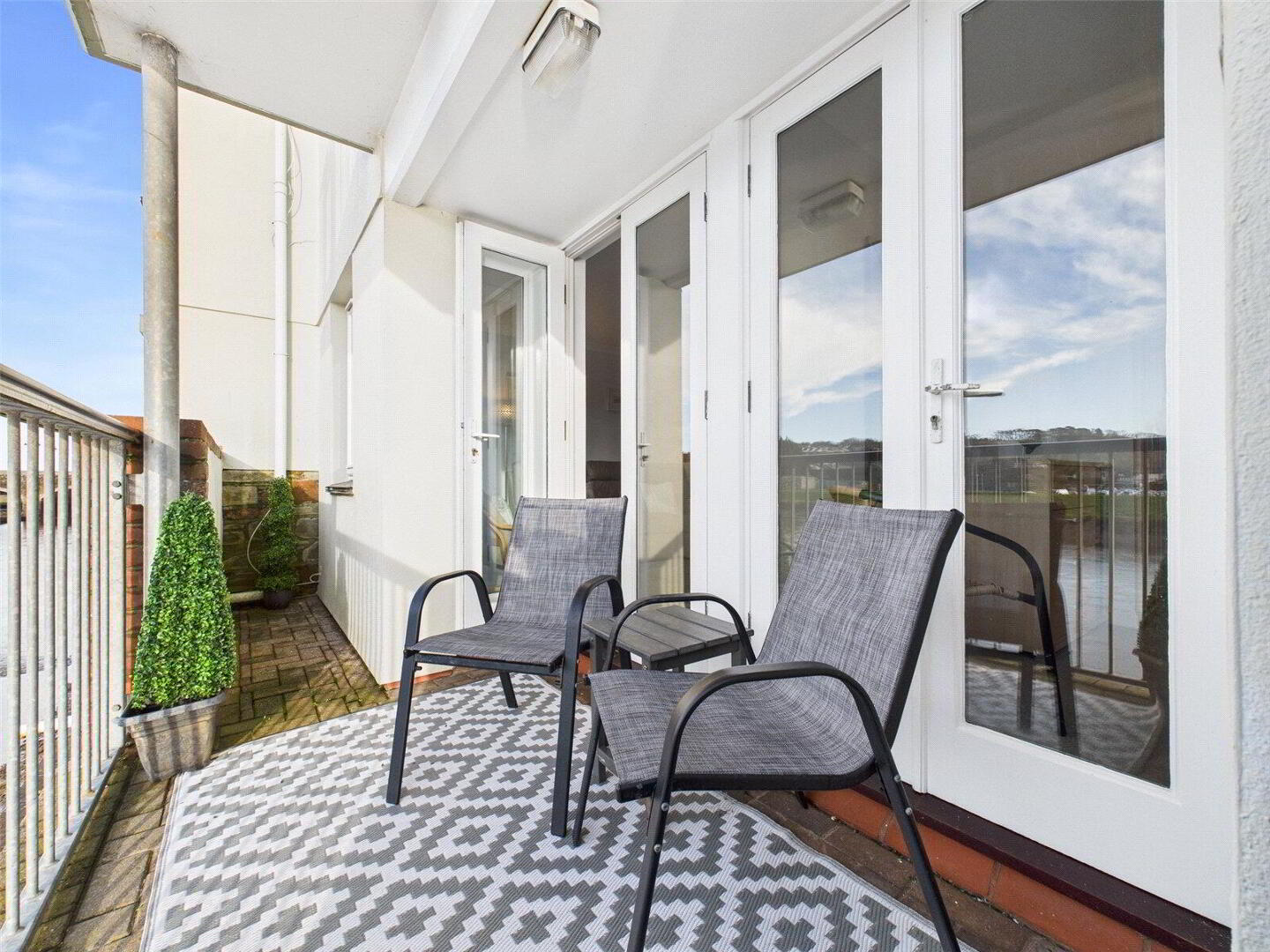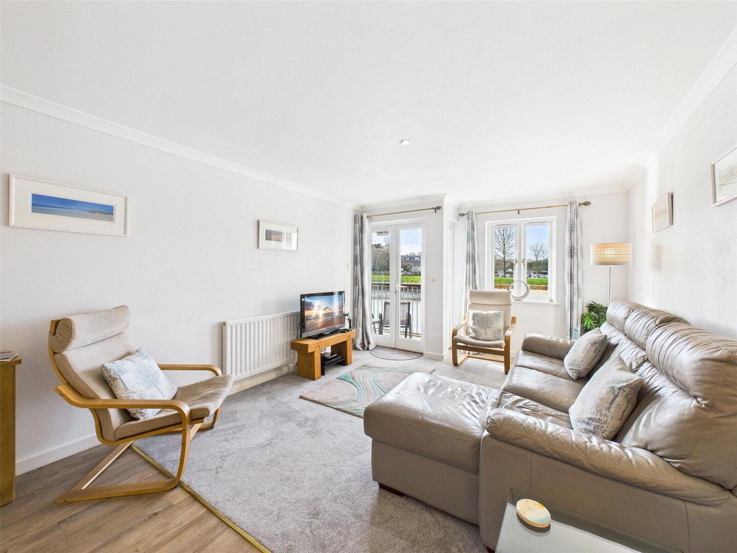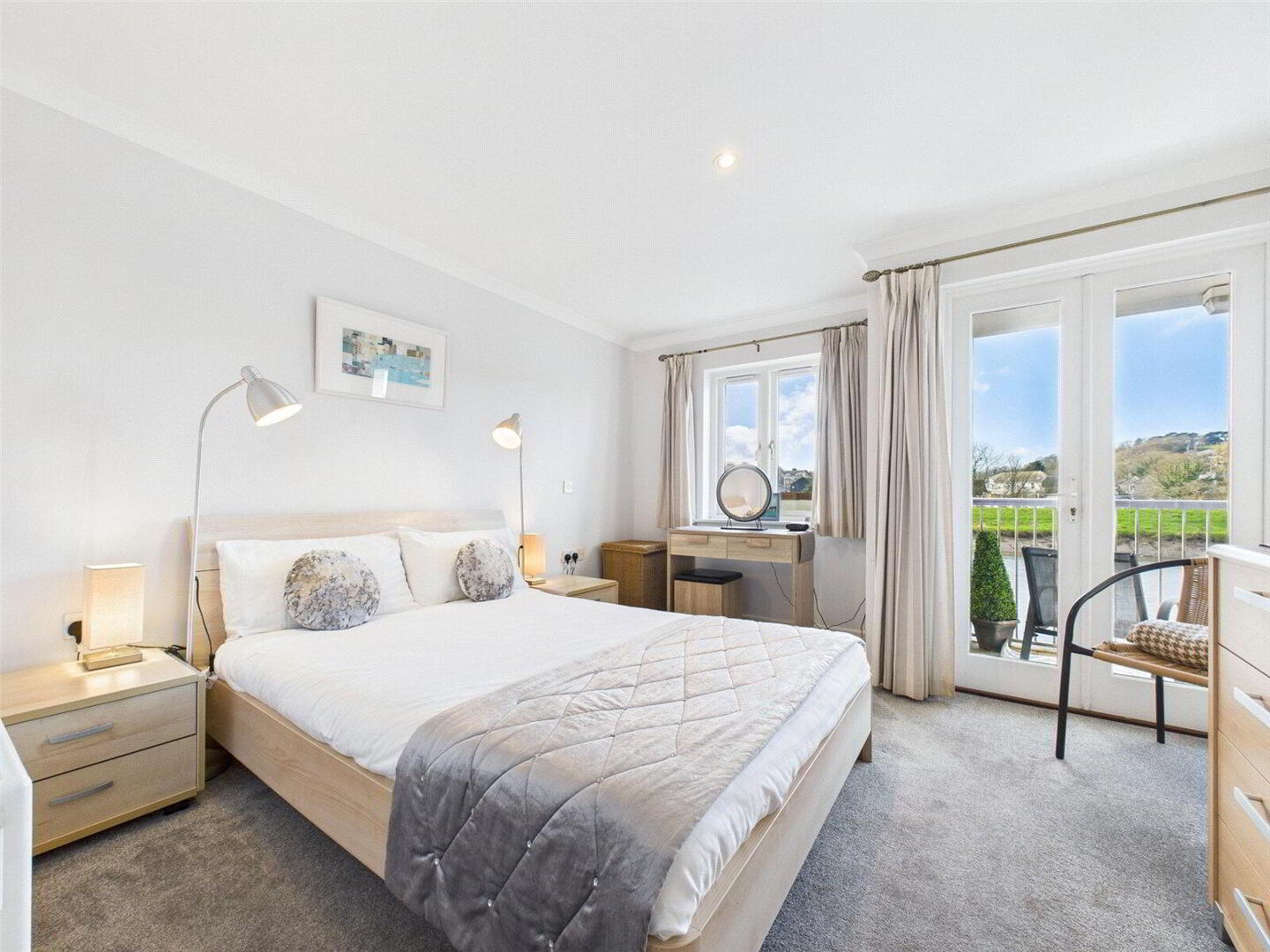 The apartment has been extremely well cared for and is presented in excellent order throughout. Both bedrooms are comfortable doubles ideal for family, guests or holiday use. The principal bedroom is a particularly light and relaxing space, benefiting from built-in storage and direct access via French doors to the balcony, the perfect spot to wake up to river views. An en suite bathroom complements the main bedroom while a separate shower room serves the second bedroom and guests, offering flexibility and convenience.