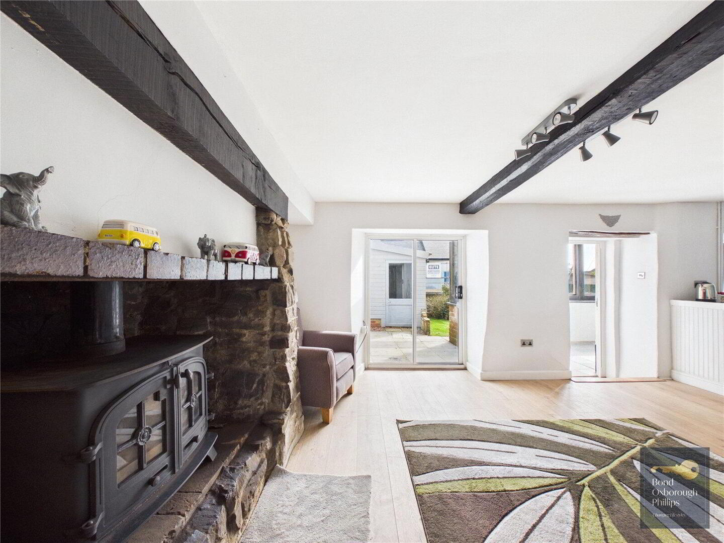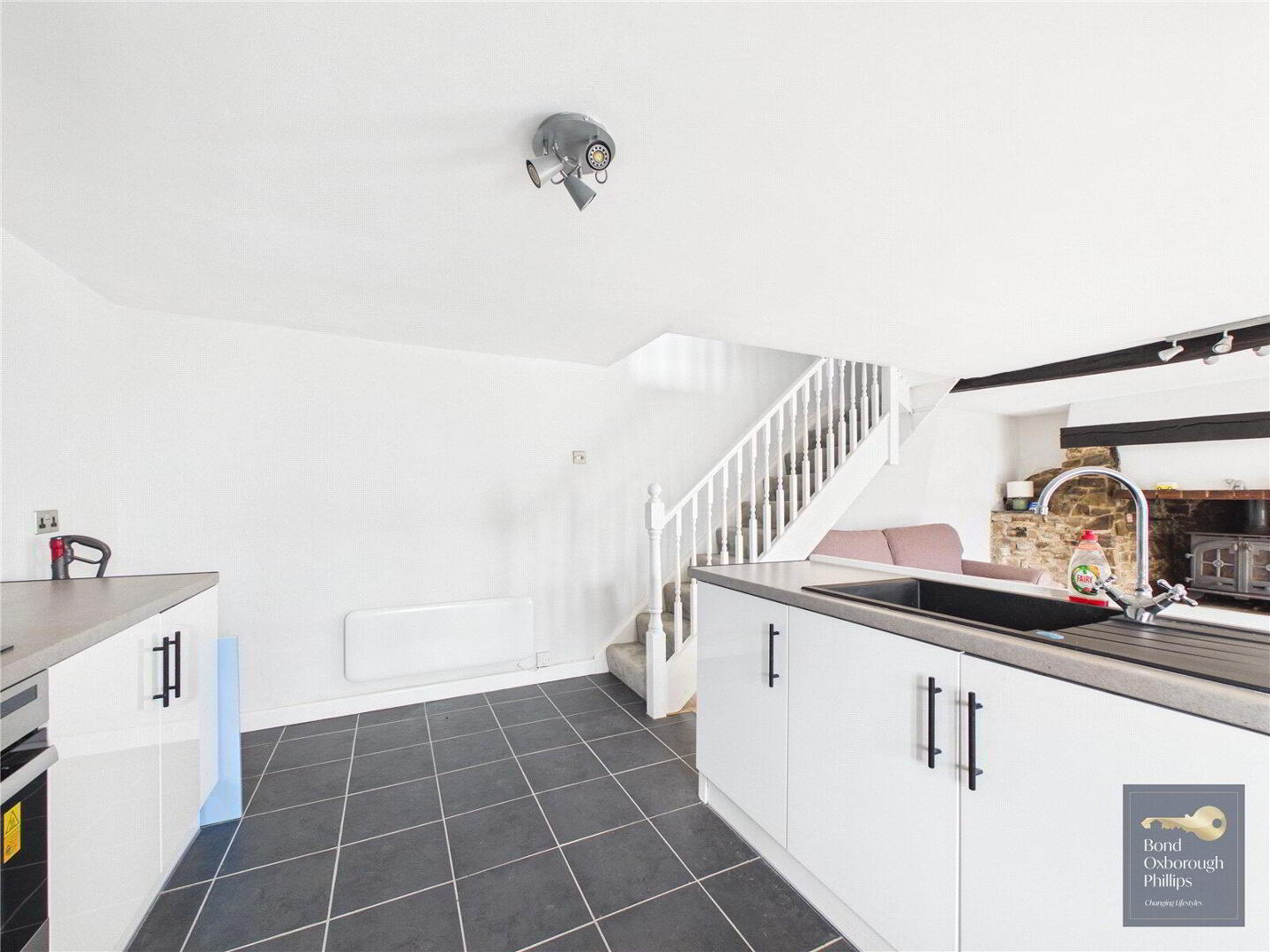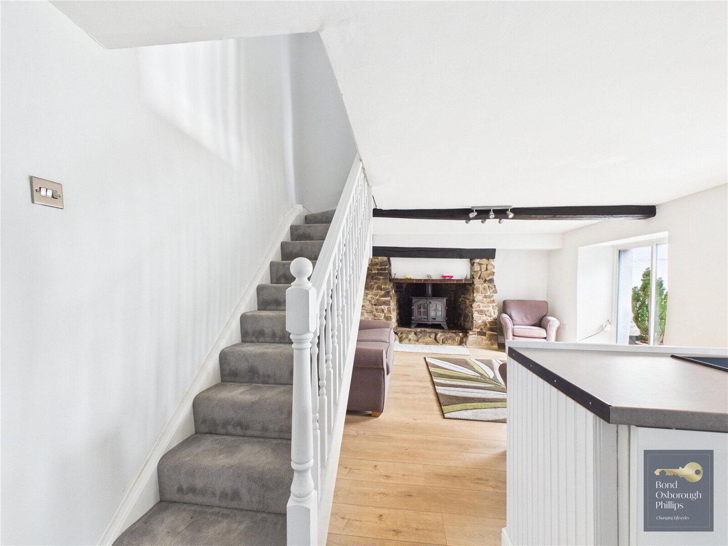 Stepping inside the cottage you enter a spacious open-plan living area which immediately feels warm and welcoming. The room centres around a charming log burning stove, creating a cosy focal point for the space. Within the open-plan layout is the kitchen area, which has recently been fitted with new units and a cooker, along with a practical breakfast bar that is perfect for informal dining.
