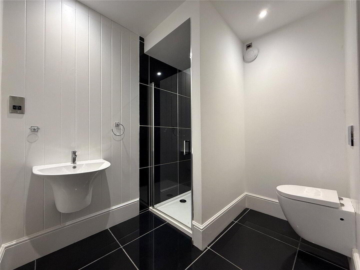 The main bathroom is finished to a high standard, comprising a freestanding bath with handheld shower attachment, single rainfall shower cubicle, wall-mounted wash hand basin, low-level flush WC, stone-effect tiled flooring, a heated towel radiator, and an extractor fan—creating a serene and contemporary space for relaxation.