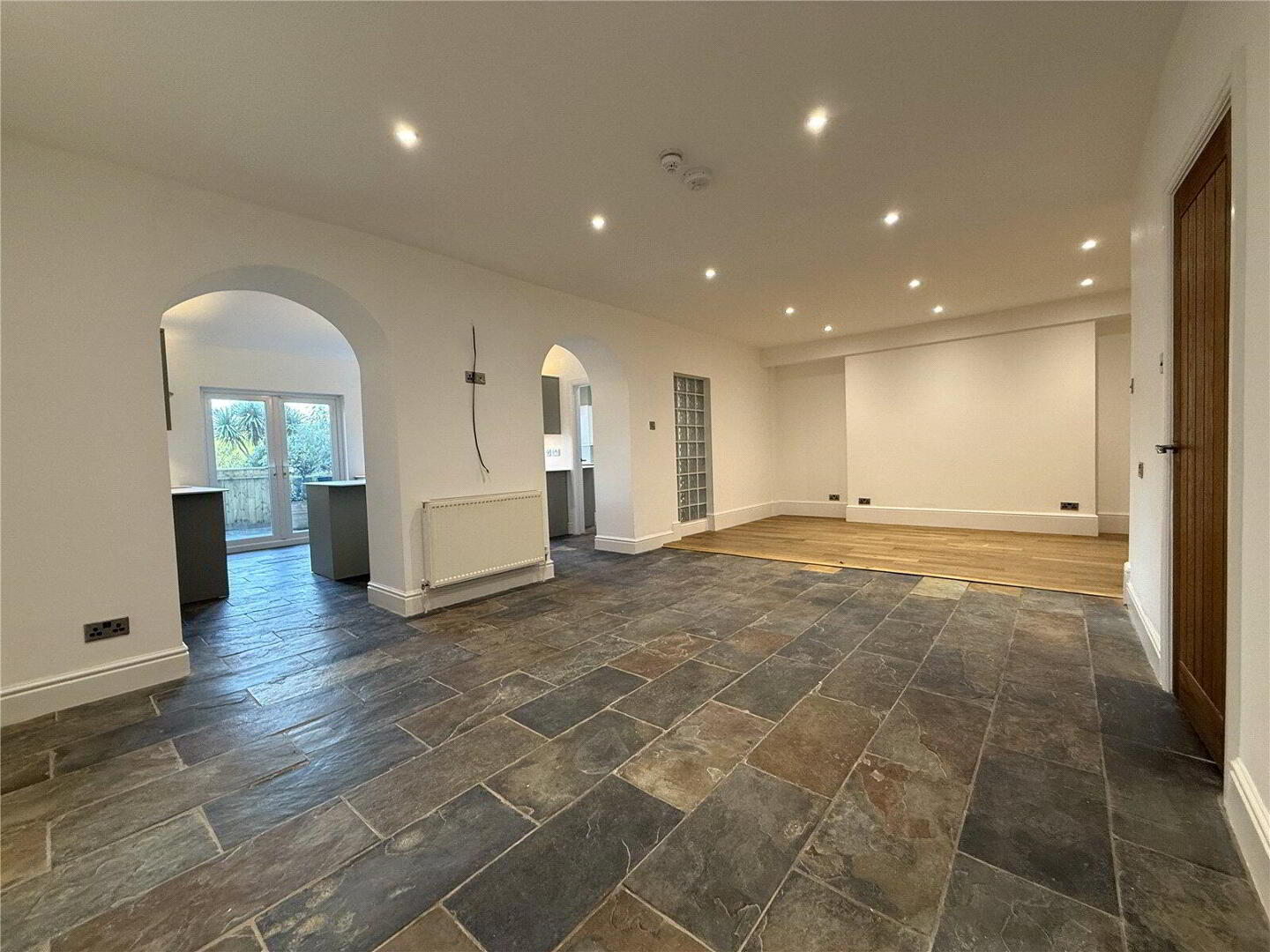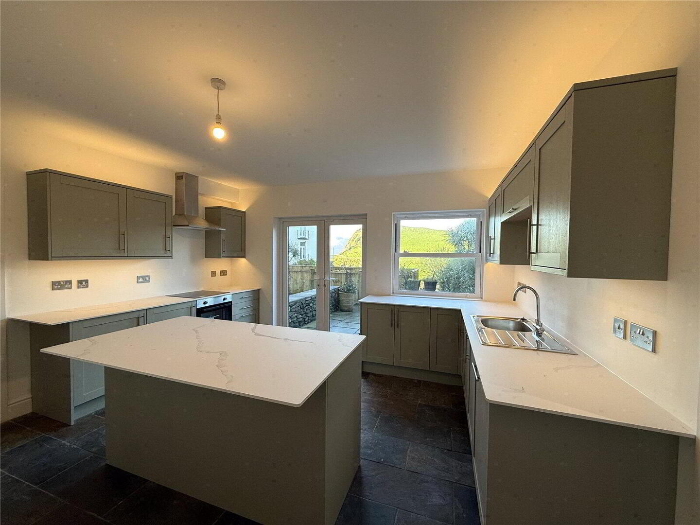 At the heart of the home is the impressive open-plan living and kitchen area, thoughtfully designed to make the most of the property’s elevated position. The kitchen features a UPVC double-glazed sash window and French doors to the front, both framing lovely sea views. A range of contemporary wall and base units are complemented by quartz-effect worktops, a stainless steel sink and drainer, and a selection of integrated Lamona appliances including a dishwasher, four-ring induction hob with extractor, and fridge. A central kitchen island provides additional workspace and seating, while stone flooring and a radiator complete this stylish, functional space. A door leads conveniently to the utility room.