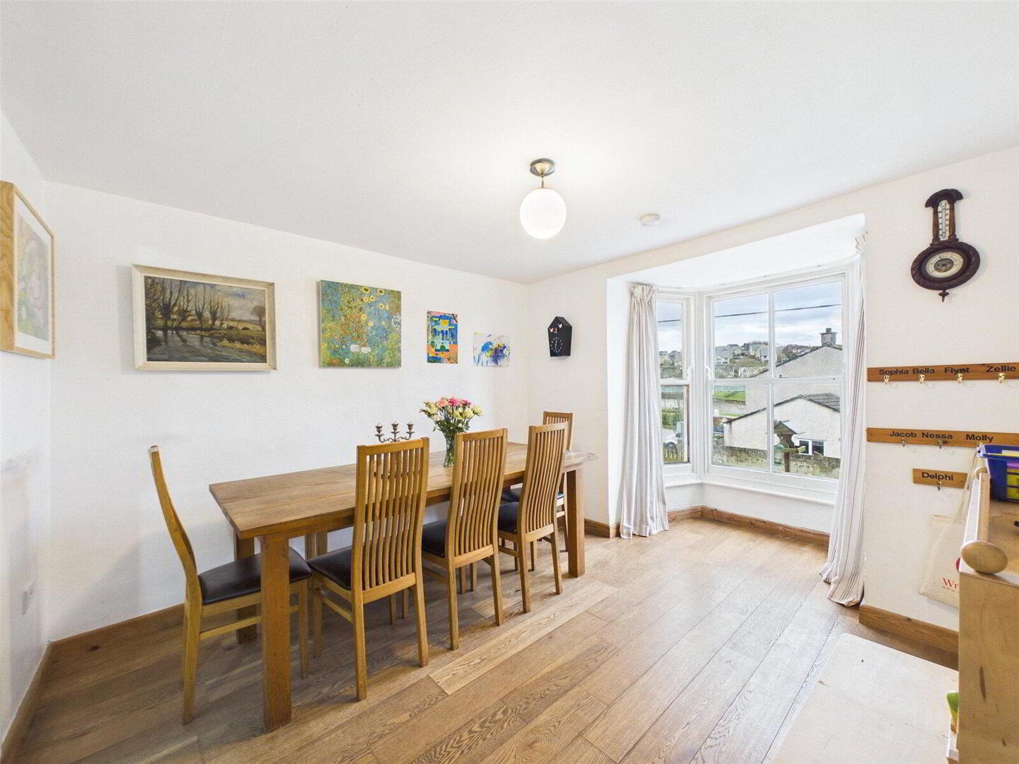 The dining room continues the home’s elegant feel, featuring another large sash bay window that frames the same picturesque outlook. This generous space flows openly into the kitchen, creating a practical and sociable layout ideal for both everyday family life and entertaining. The kitchen offers integrated appliances, ample cupboard storage and direct access to the rear garden.