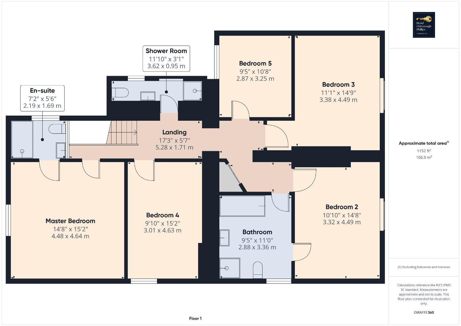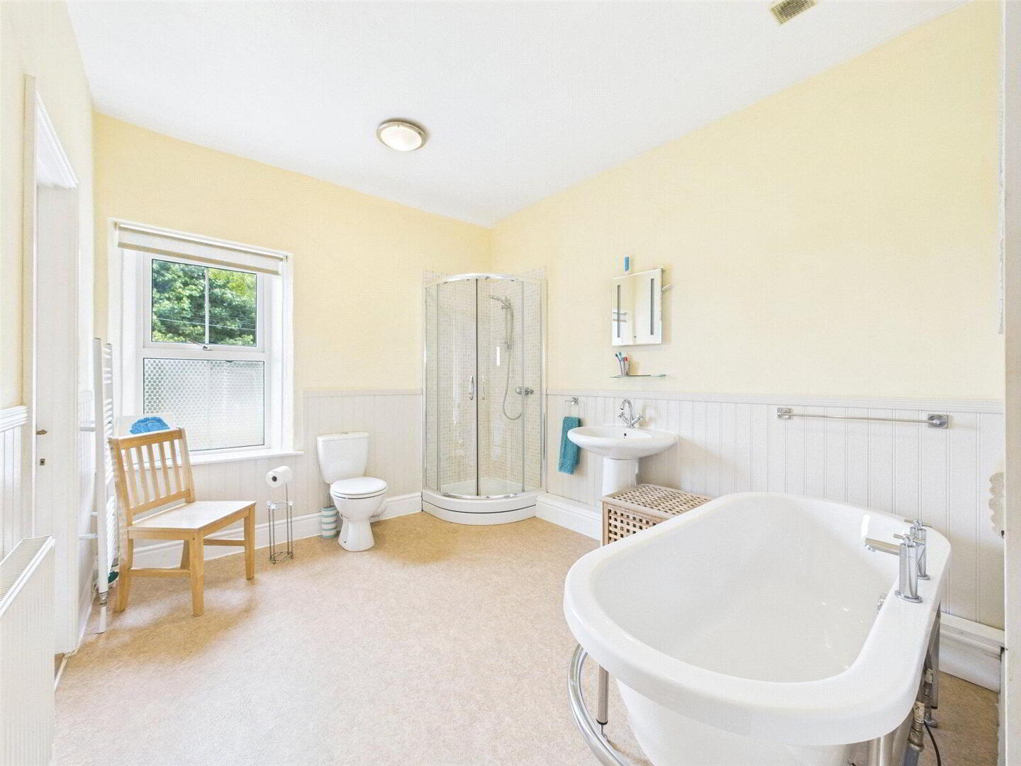 Upstairs, a spacious landing leads to five well-proportioned bedrooms. The master bedroom enjoys the privacy of an en-suite shower room, while the family bathroom is well-appointed, featuring a luxurious roll-top bath alongside a separate shower room, providing ample facilities for family and guests alike.