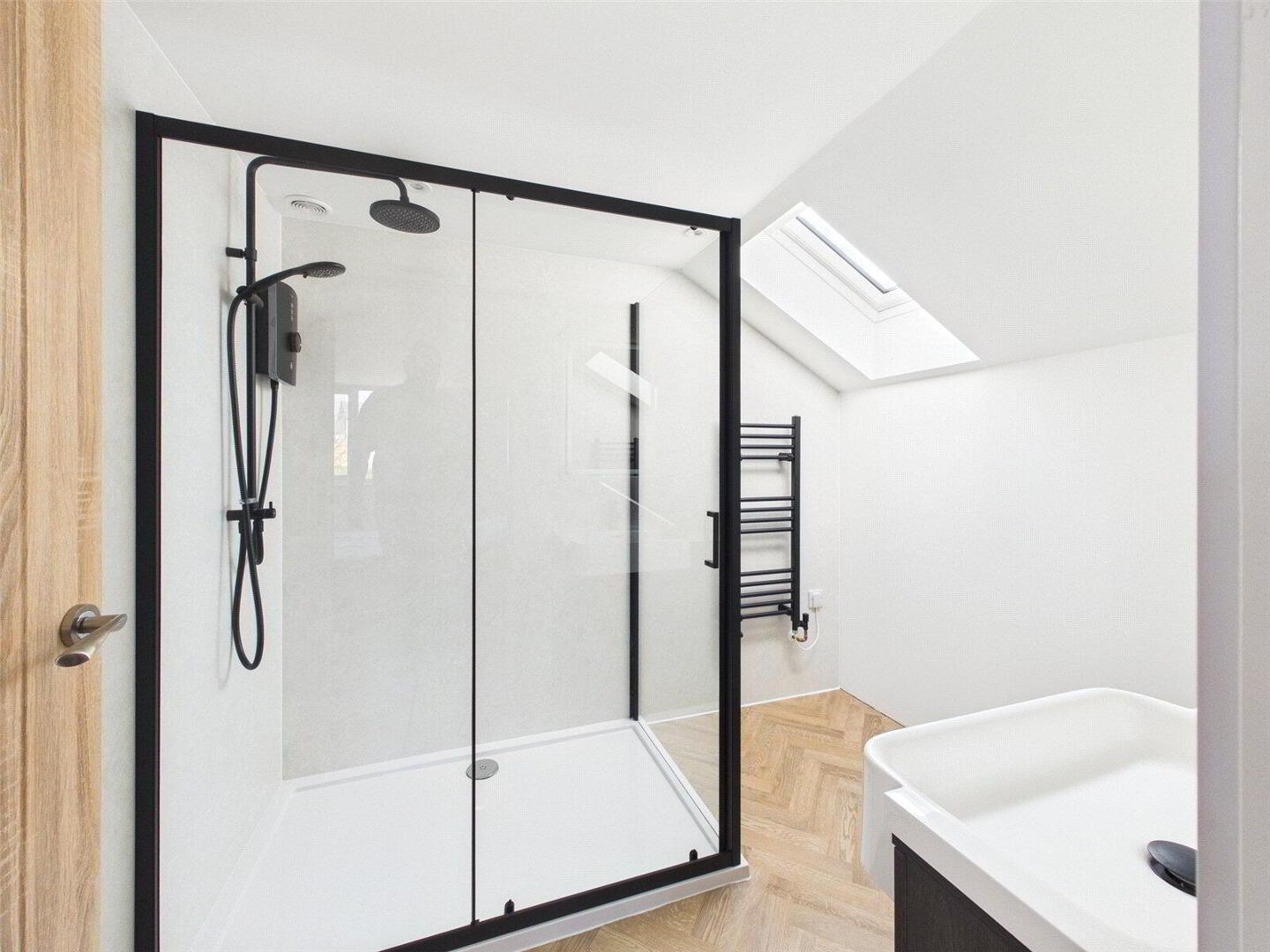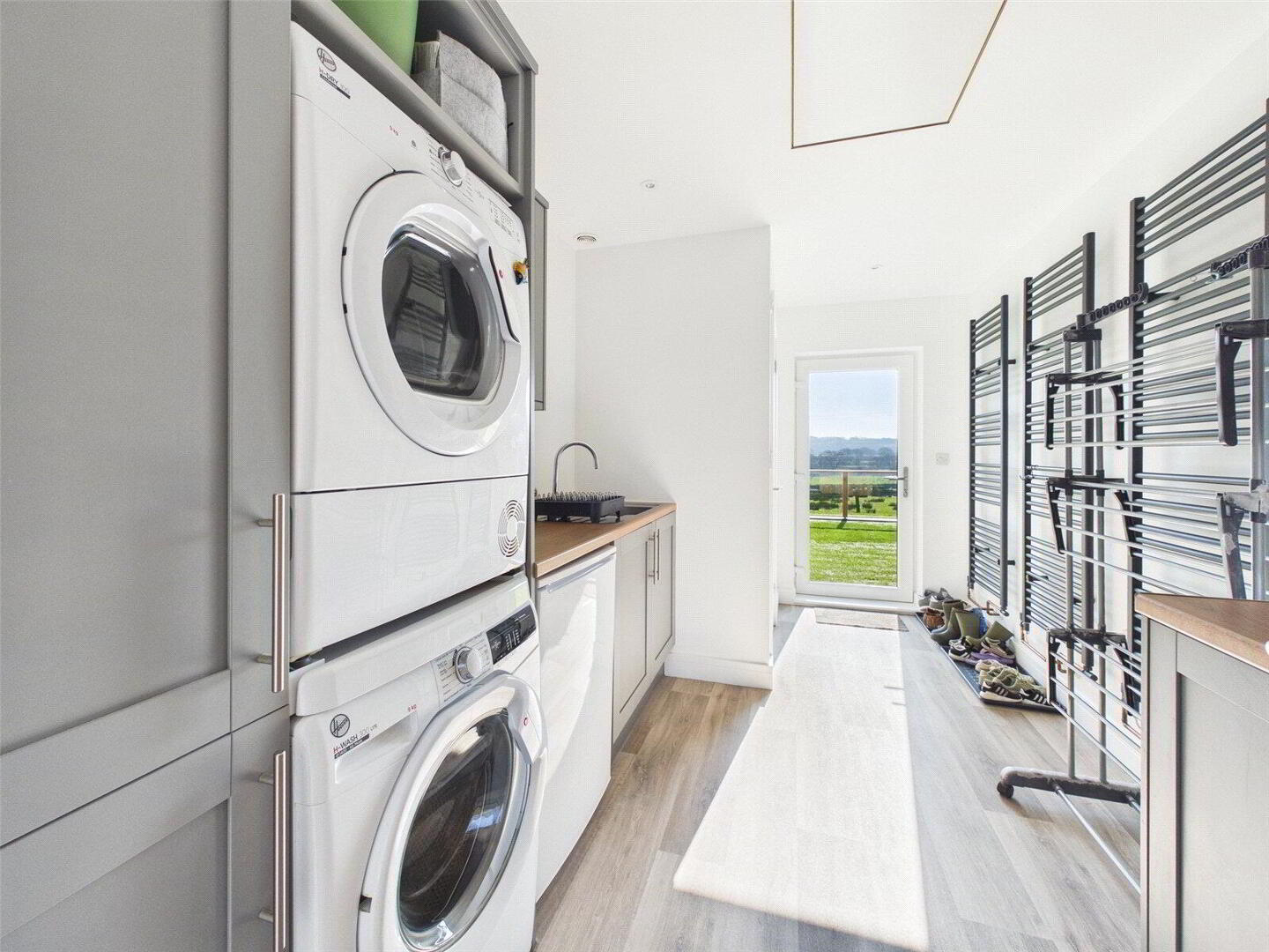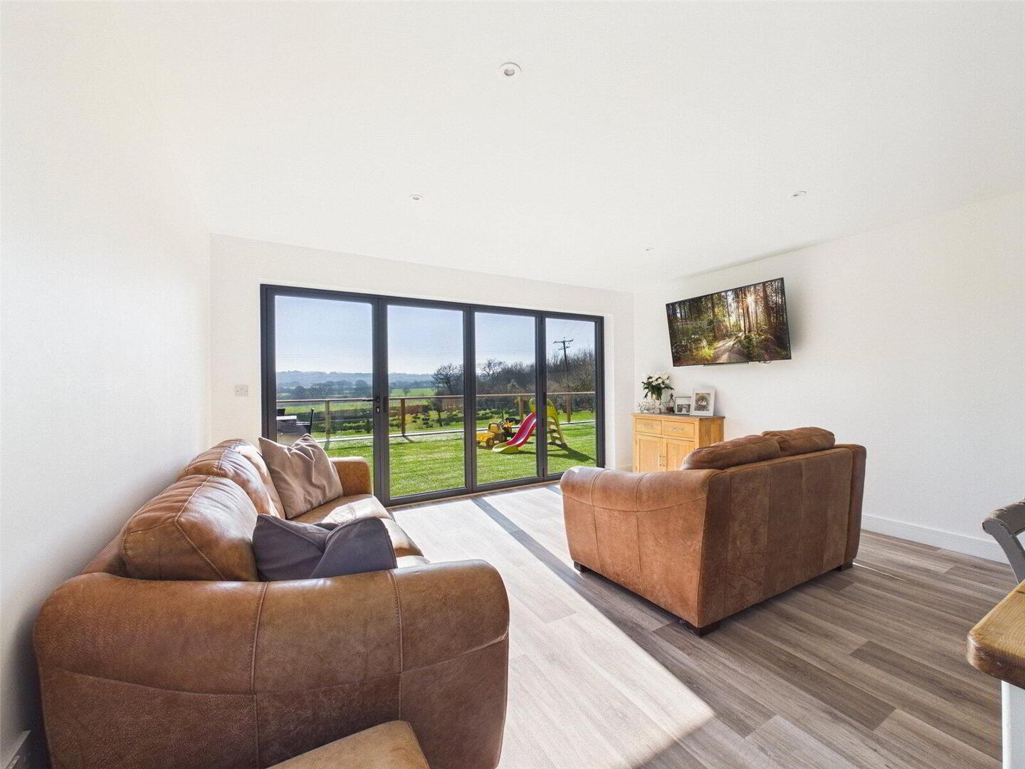At the heart of the home is a superb open-plan kitchen, dining and living area, designed to create a light-filled and sociable living space. The contemporary kitchen features acrylic stone worktops, high-quality cabinetry and a range of integrated appliances. The room offers ample space for both dining and seating areas, with bi-fold doors opening onto the terrace and enjoying delightful views across the surrounding countryside. A separate reception room provides a more intimate and cosy sitting area, with French doors leading out to the rear garden.