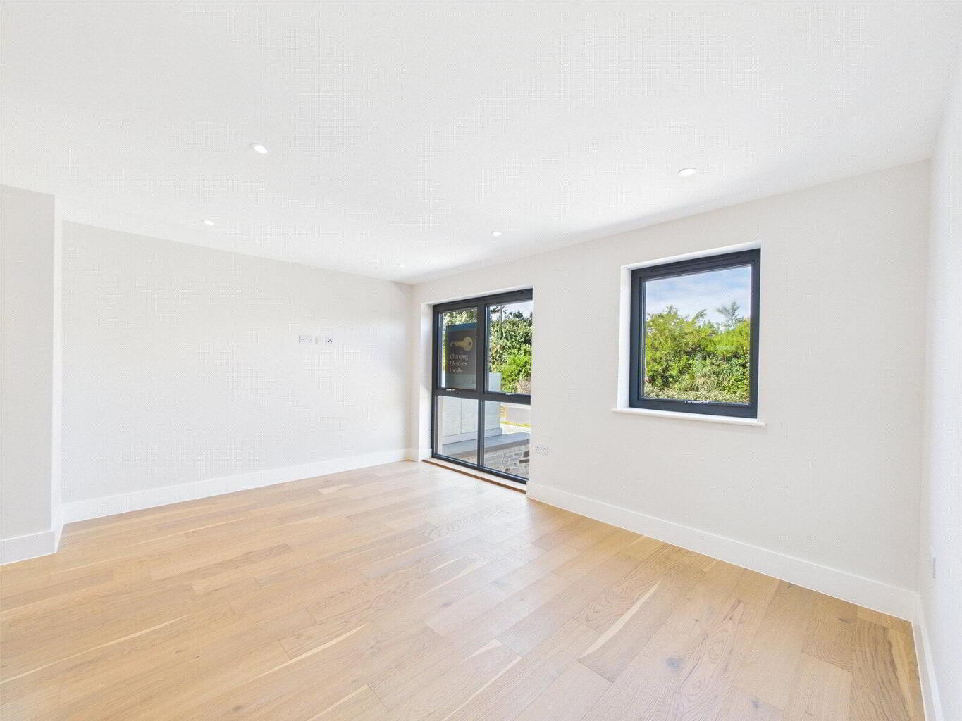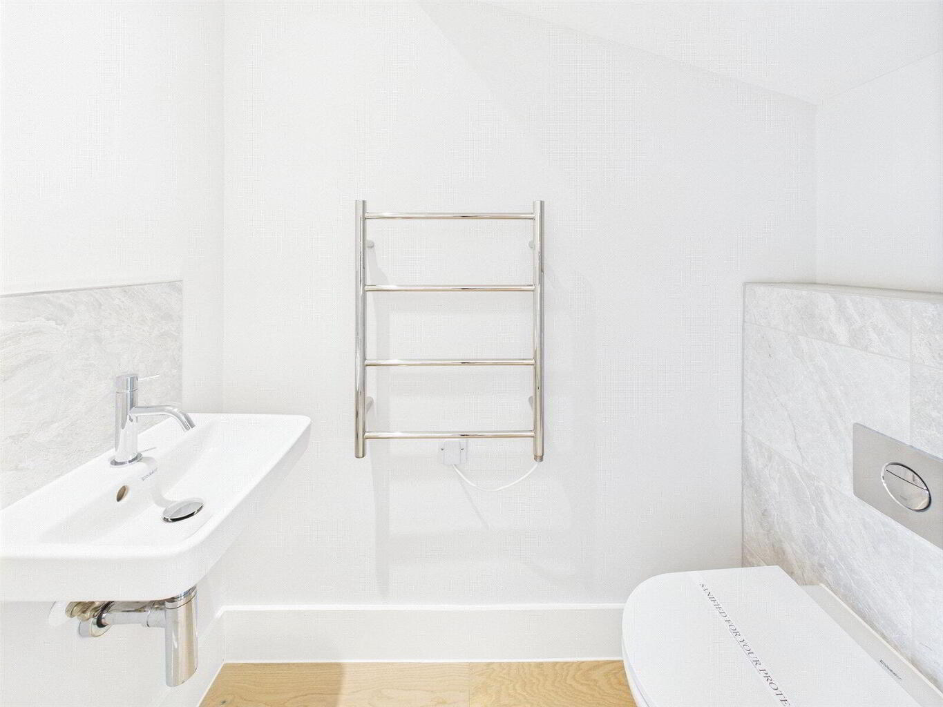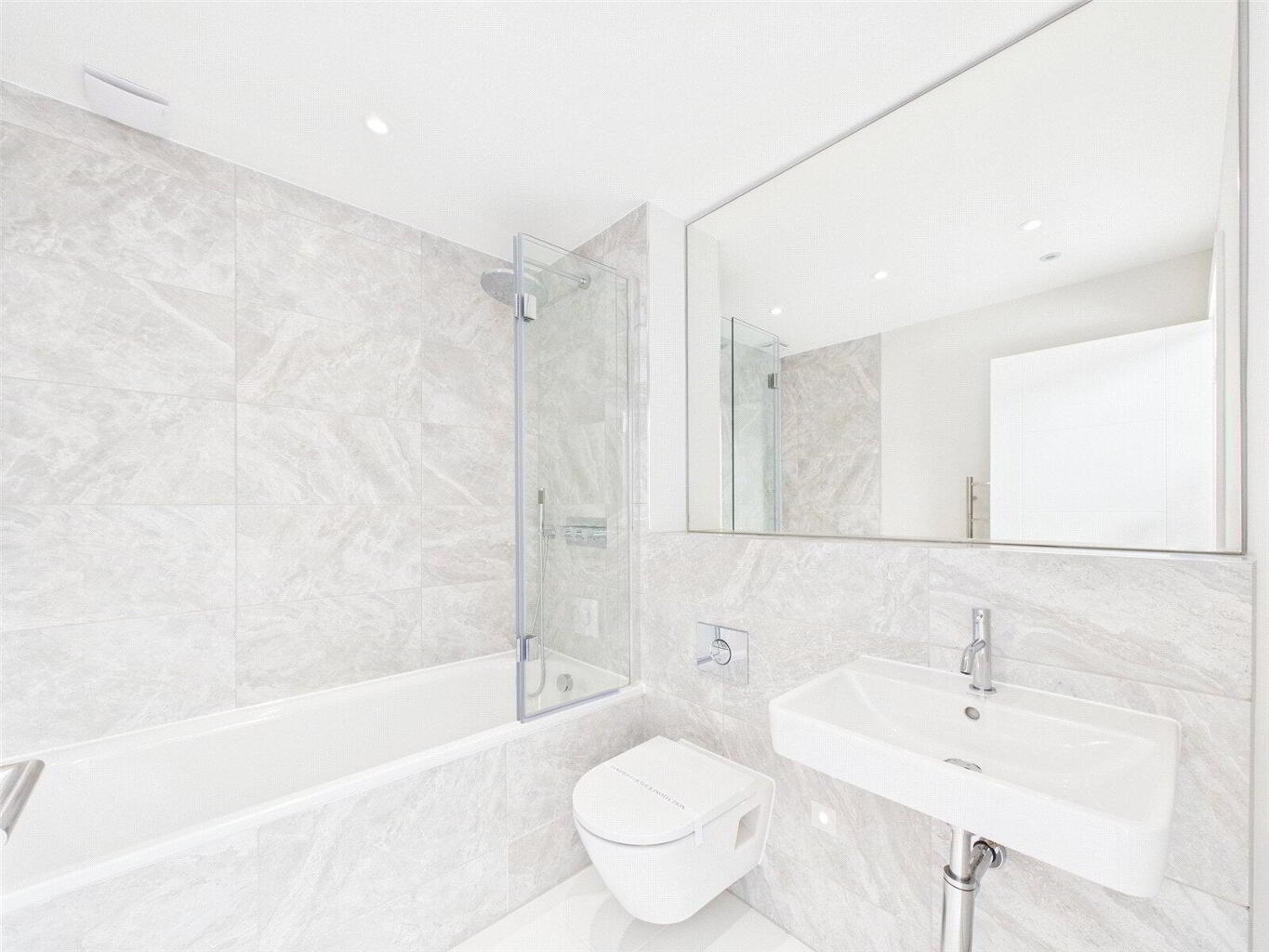 Upstairs, the apartment offers two generous double bedrooms, including a principal suite with a stylish en-suite shower room. A contemporary family bathroom serves the second bedroom, complete with a bath and overhead shower, LED-lit mirror, basin, and W/C—finished to a high standard throughout.