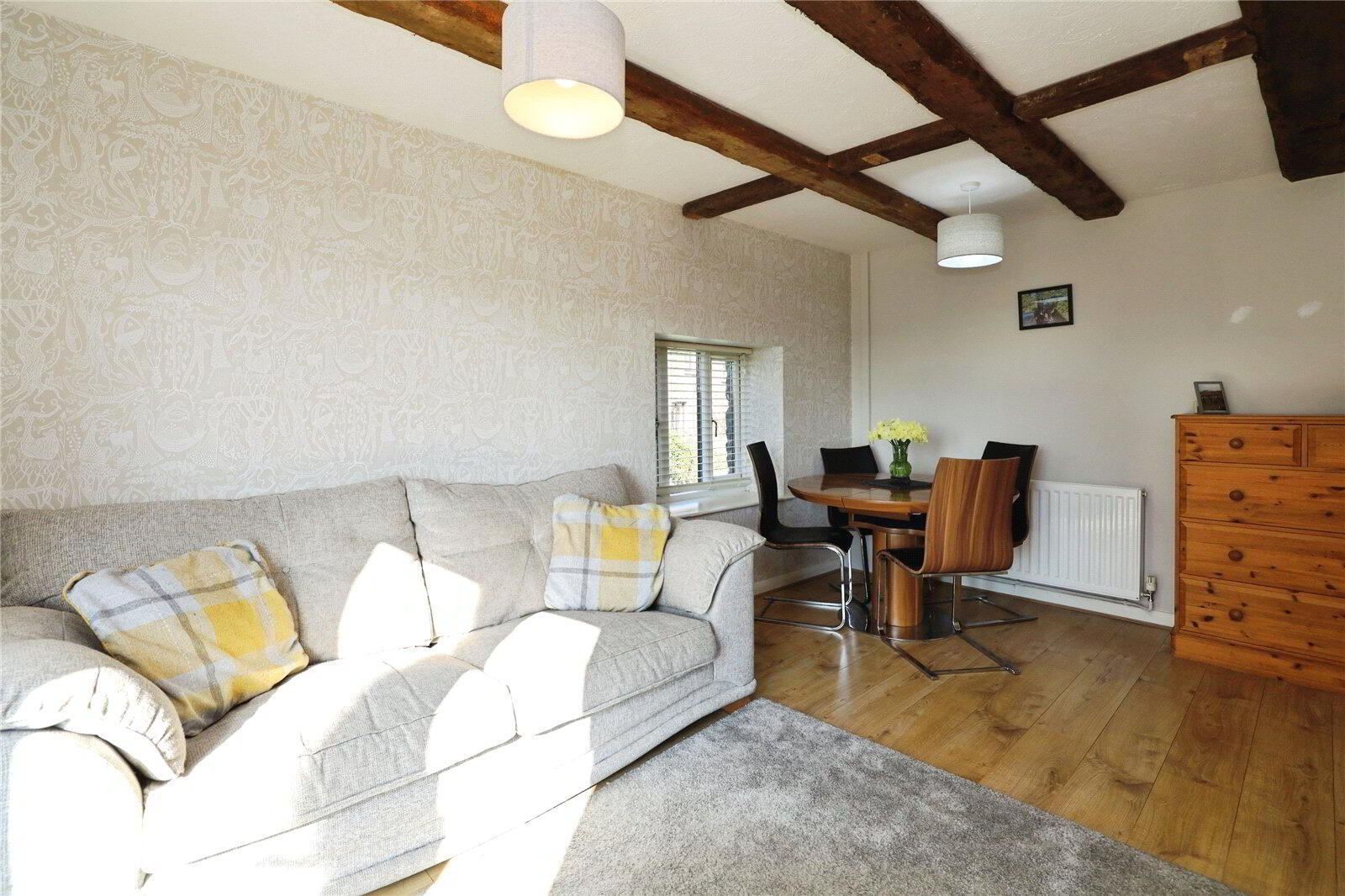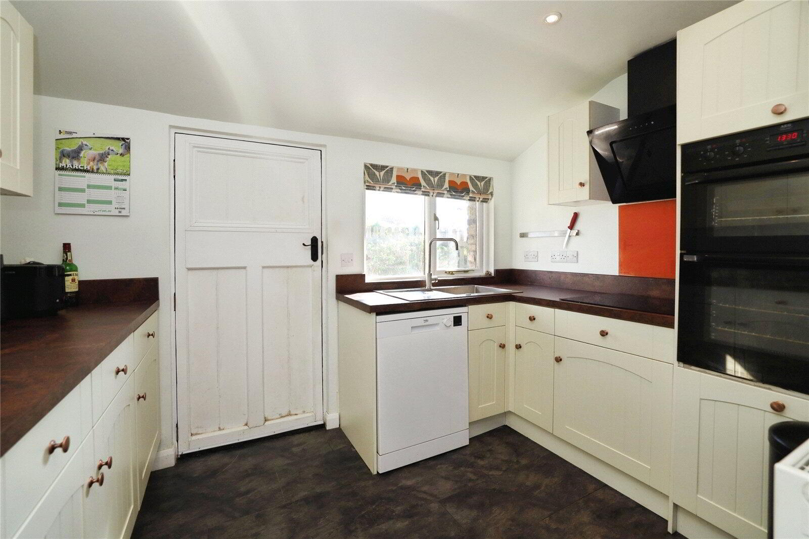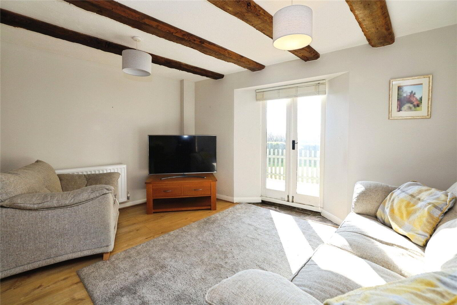 Stepping inside, the front door opens directly into a well-presented Kitchen, fitted with cream shaker-style units that perfectly complement the character of the property. Integrated appliances include a double oven and induction hob with extractor over, with further space for a fridge and dishwasher. This leads through to a superbly proportioned Living / Dining Room, full of character with exposed wooden ceiling beams and French doors opening out to the decking, creating a seamless link between indoor and outdoor living.