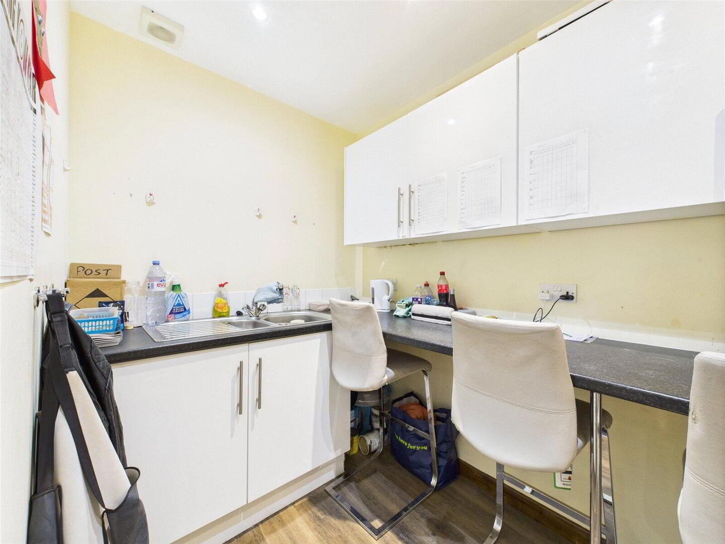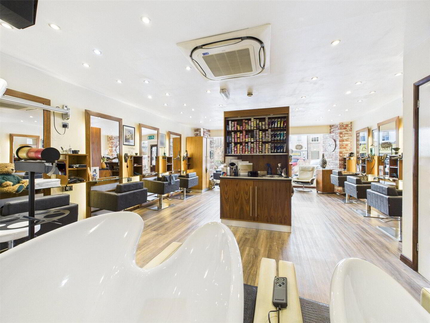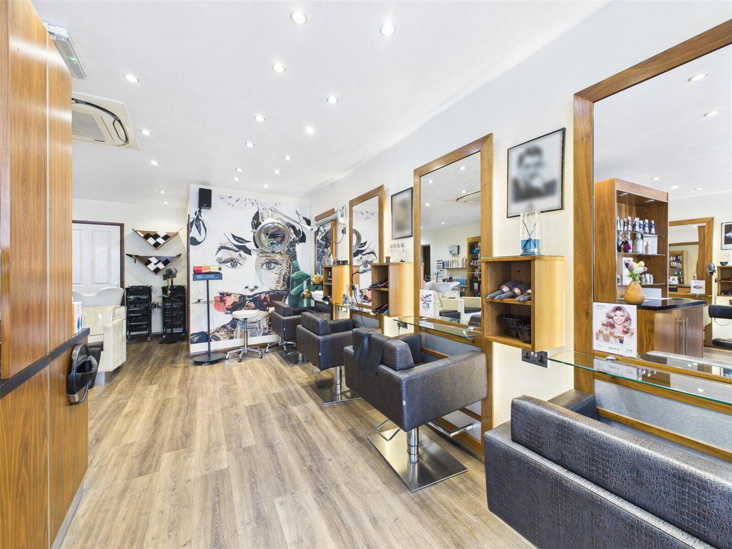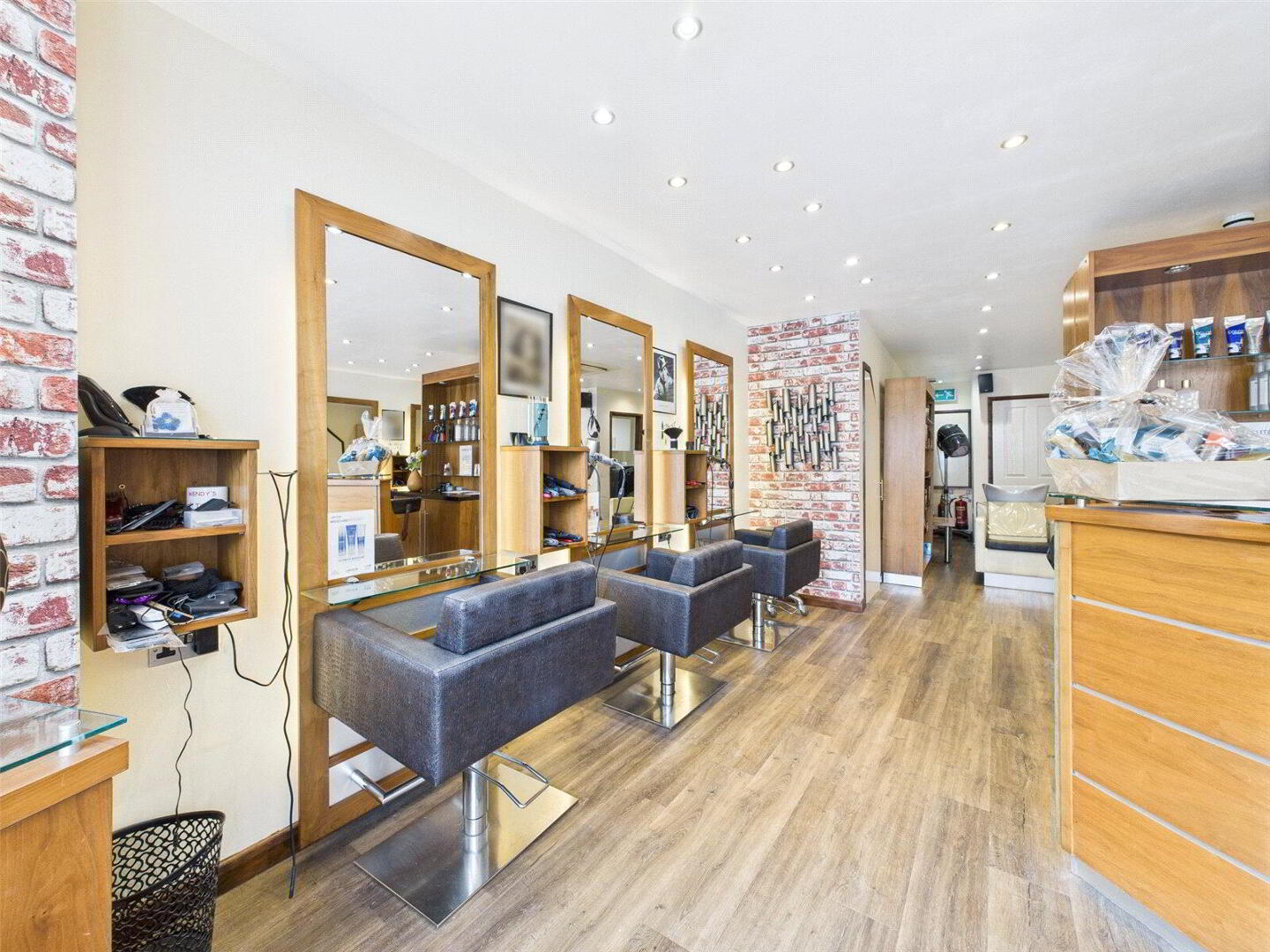 The ground floor retail space offers a welcoming entrance and a well-lit, open area currently configured with multiple workstations for the salon, but easily adaptable to suit a variety of business uses. At the rear, you'll find a cloakroom with a low flush WC and hand basin, plus a break/staff room with a range of matching floor and wall mounted units and a 1.5 stainless steel sink/drainer unit.