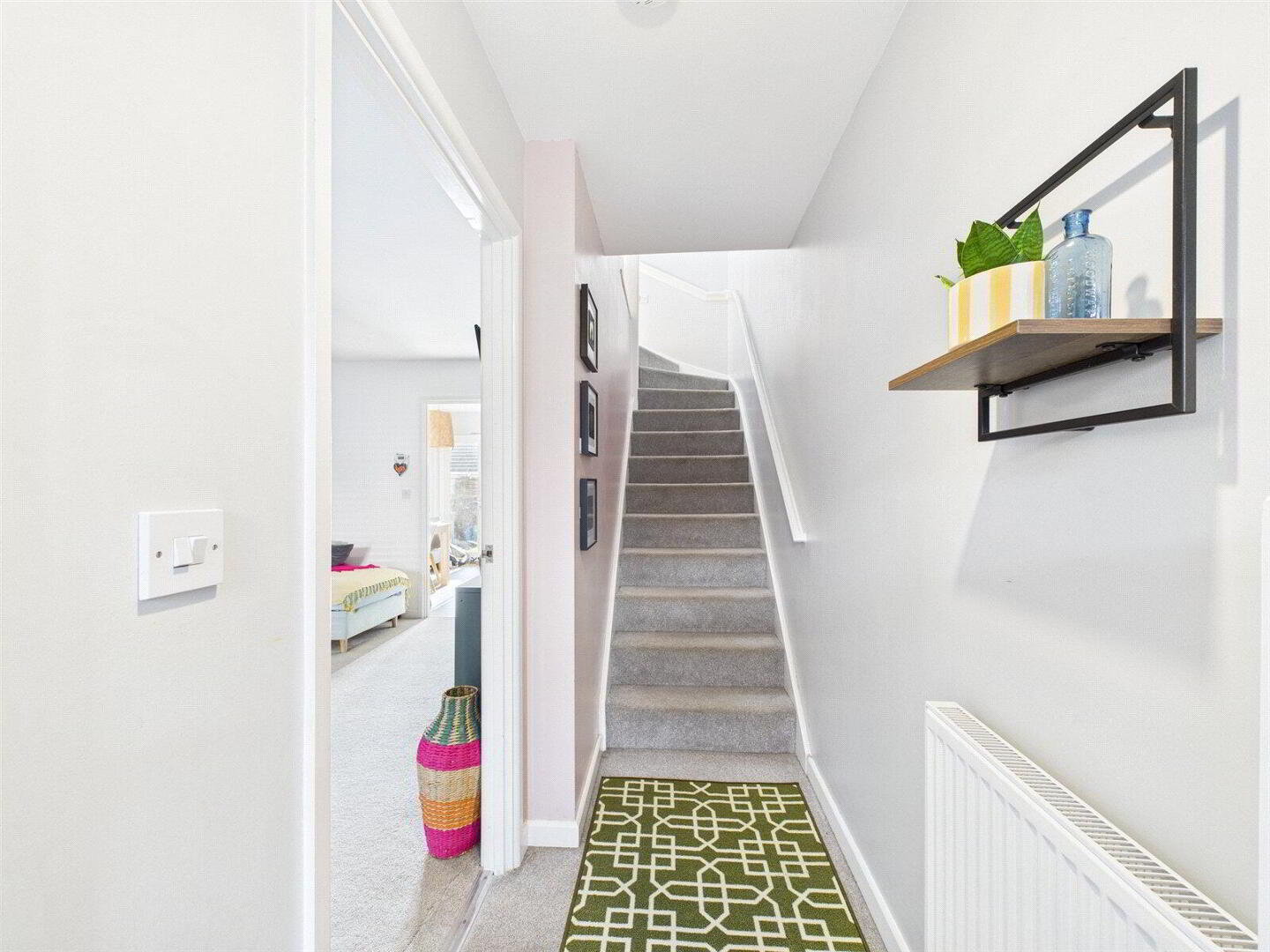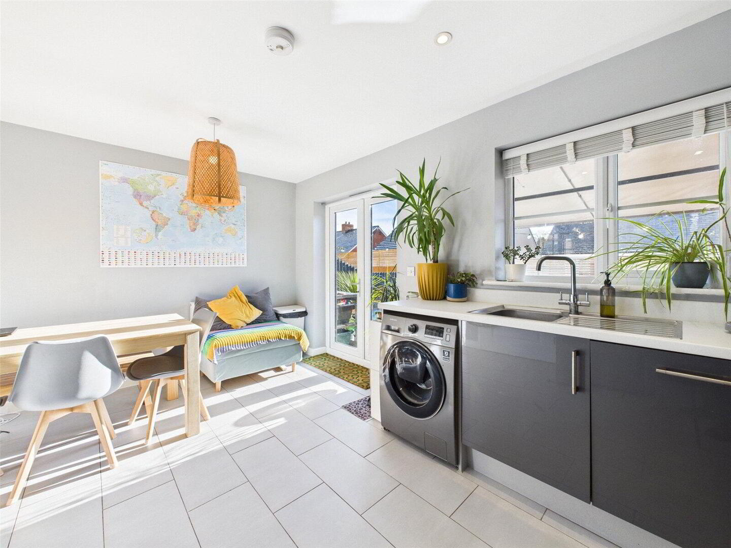Upon entering, you are welcomed by an inner hallway with access to the first floor, the downstairs W.C., and the living room. The living room is bright and airy, benefitting from generous natural light through the front-elevation window. Completing the ground floor is a modern kitchen/dining room. A range of integrated appliances complement the space, including an inset oven with gas hob and extractor fan. There is under-counter space for white goods, as well as ample room for a freestanding fridge-freezer. Double-glazed French doors open onto the rear garden, offering easy indoor-outdoor living—ideal for those perfect summer evenings.