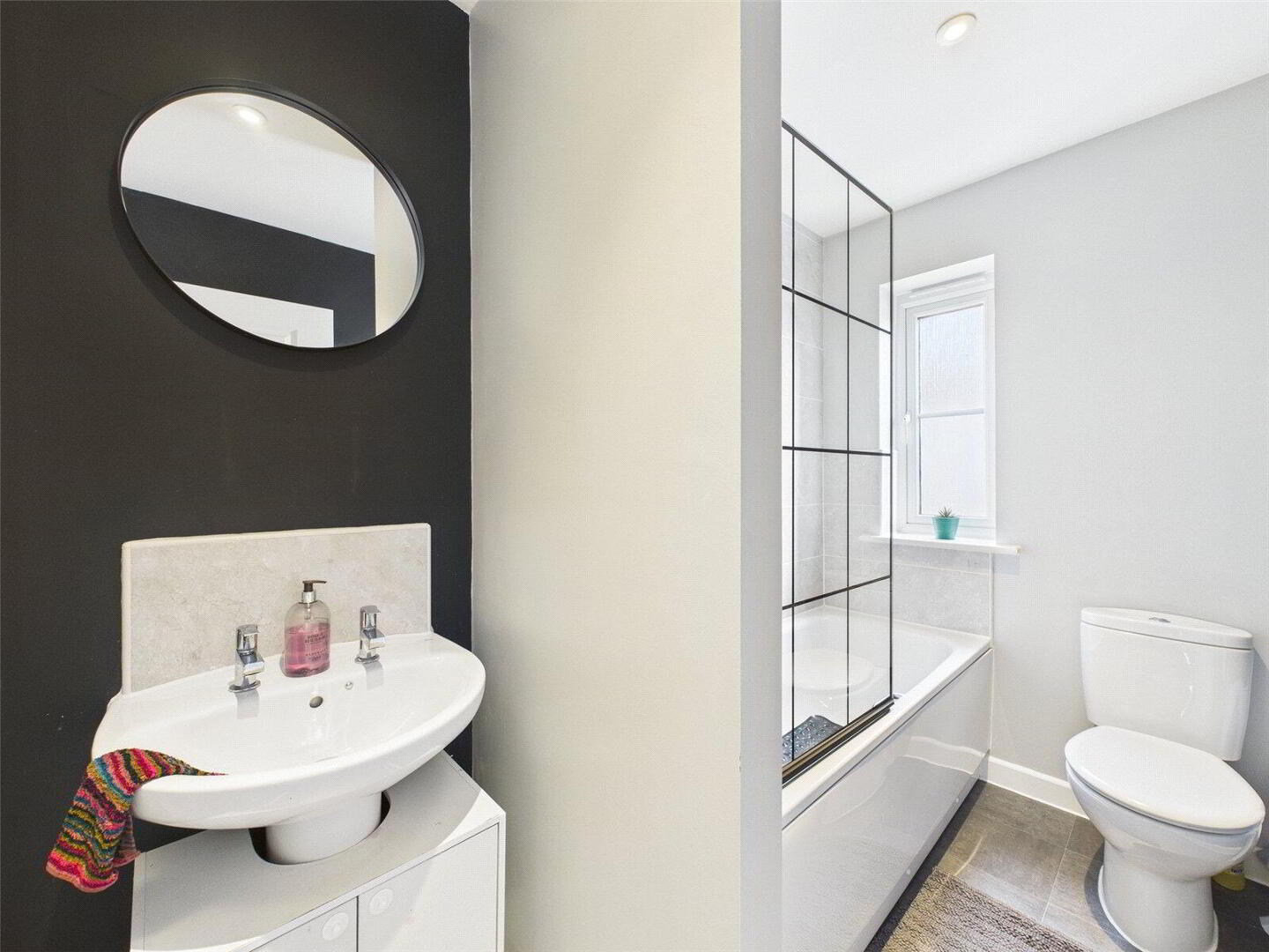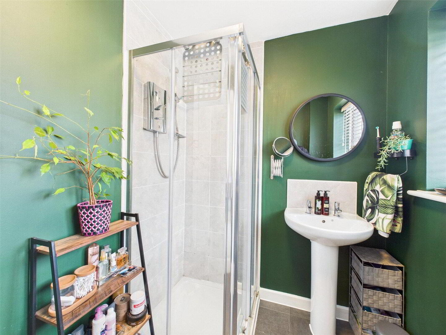 Upstairs, the property boasts three bedrooms (two doubles), one of which enjoys its own en-suite shower room. The master bedroom provides plenty of space for a double bed, along with a built-in wardrobe offering generous storage. The contemporary en-suite features an electric shower, low-flush W.C., and pedestal hand basin. A family bathroom completes the first floor, comprising a shower over bath, low-flush W.C., and hand basin.