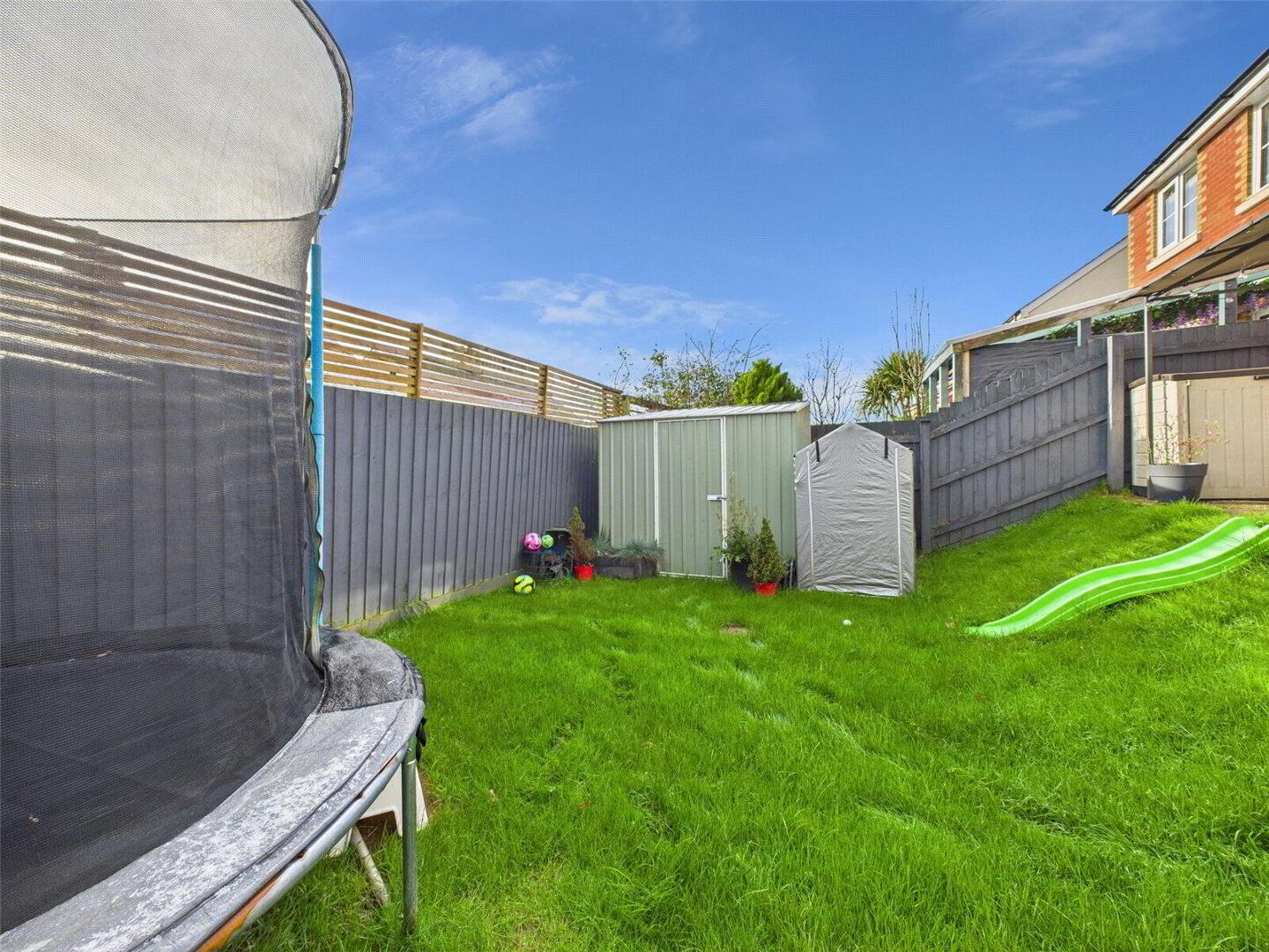Externally, the property benefits from two off-road parking spaces, with gated side access leading to the rear garden. Directly off the kitchen’s French doors is a patio area, perfect for alfresco dining. A storage shed sits toward the rear boundary, with the remaining garden offering ample space suitable for a variety of uses.