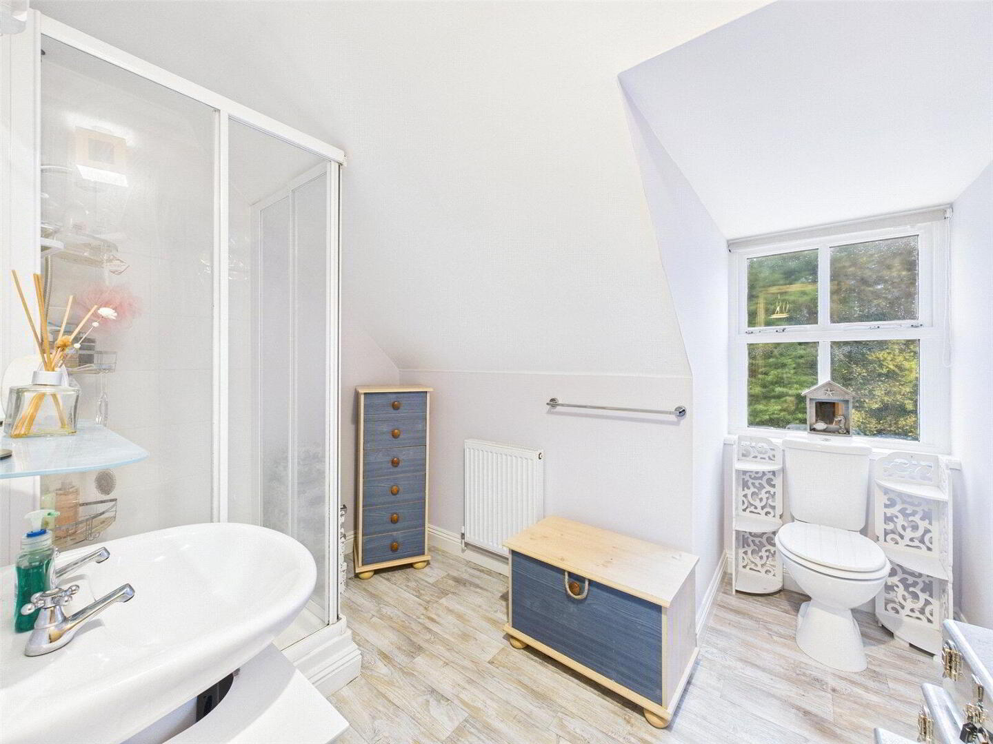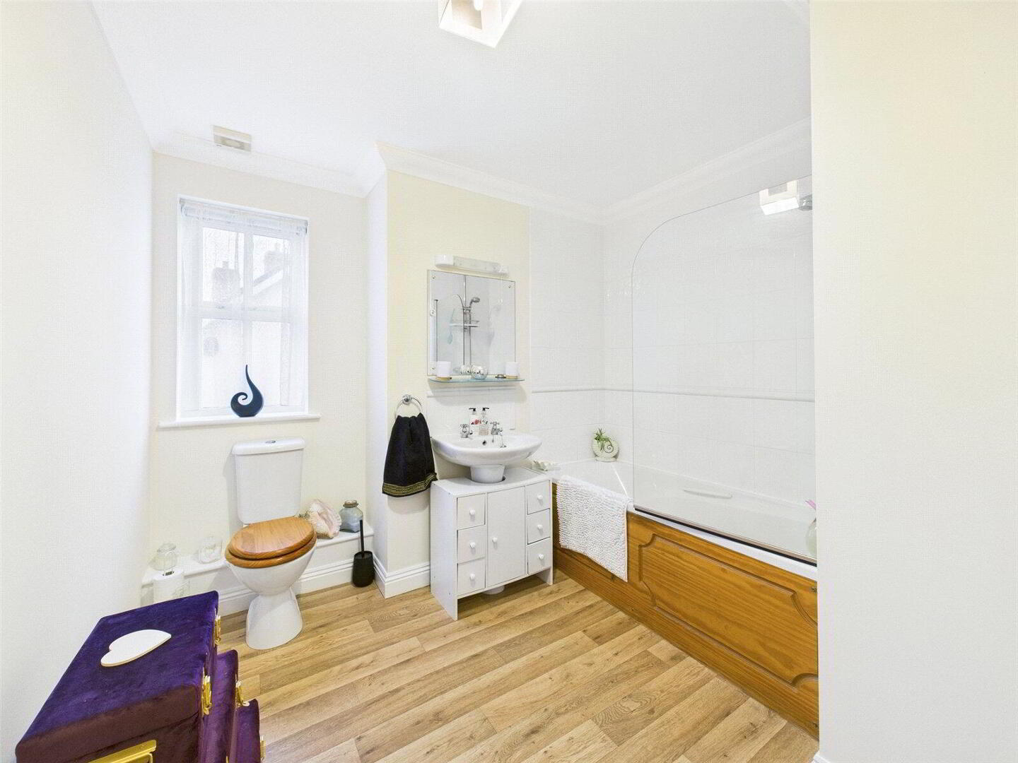 The first floor hosts two spacious double bedrooms, each benefiting from built-in storage. A further storage/airing cupboard is located on the landing, while the family bathroom includes a low-flush W.C., pedestal hand wash basin and a shower over the bath.