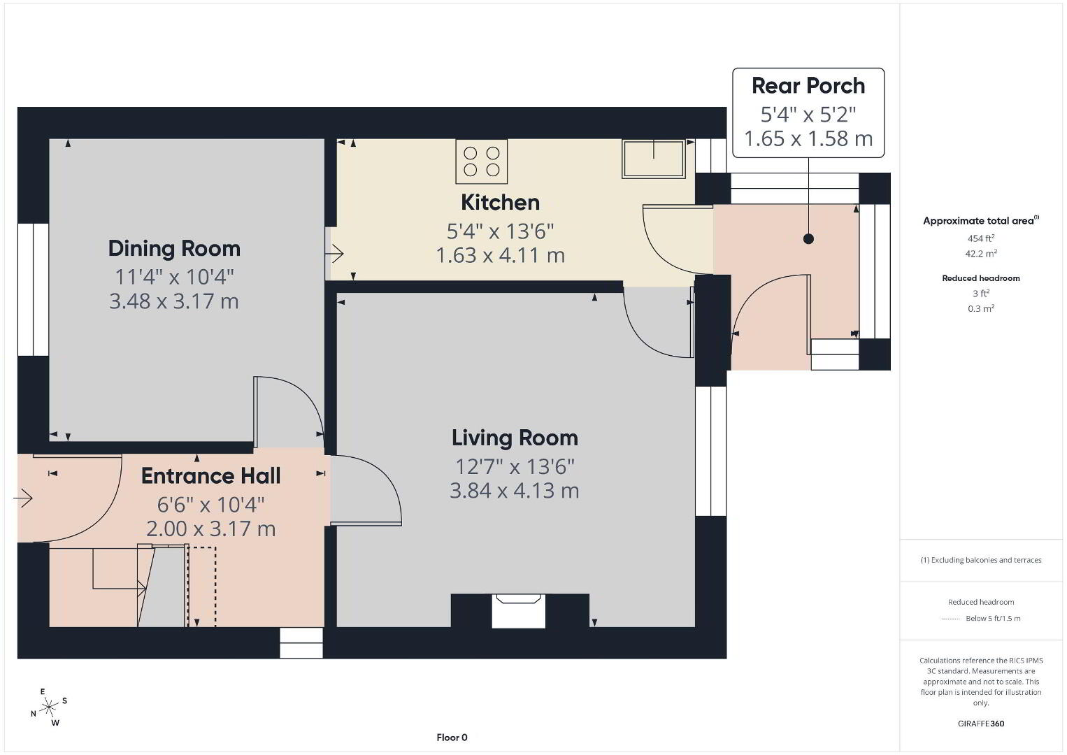 The ground floor comprises an entrance hall, generous living room, separate dining room, kitchen, and rear porch. On the first floor are two good-sized bedrooms and a family shower room.