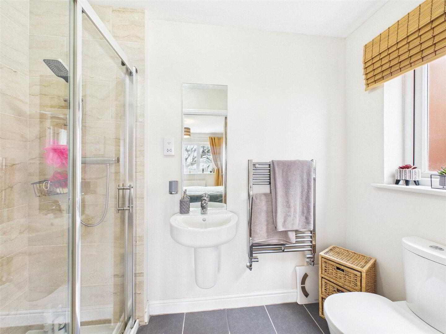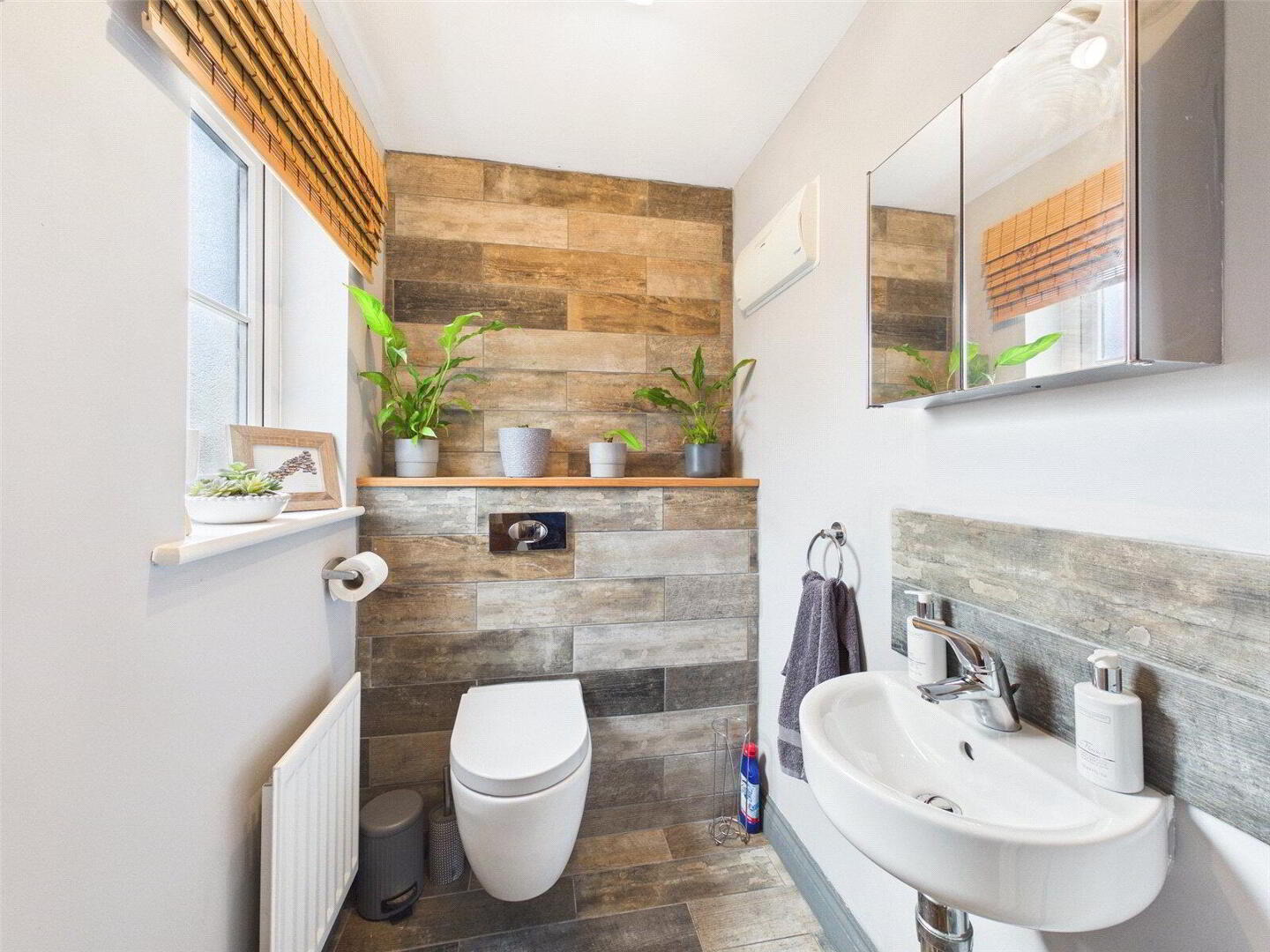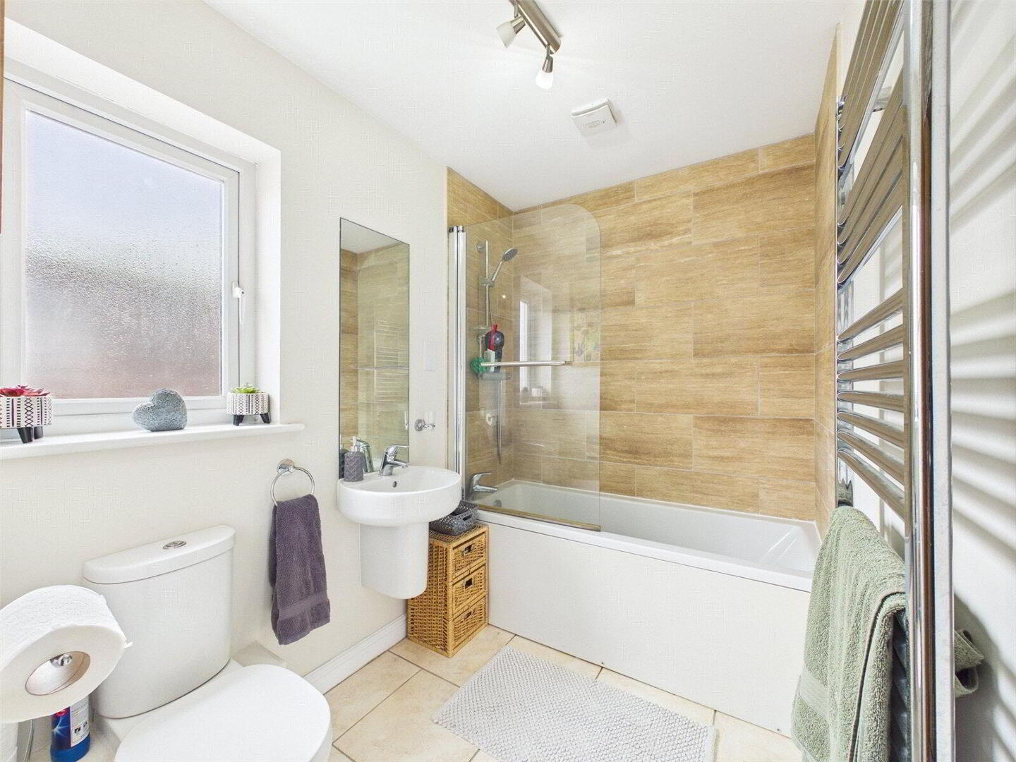 Upstairs, the property continues to impress with well-proportioned and stylishly presented accommodation. The principal bedroom benefits from a generous built-in storage unit and a contemporary en-suite shower room, comprising a walk-in shower, low-level W.C., and wall-mounted wash basin. The modern family bathroom is equally well-equipped, featuring a bath with shower over, wall-mounted basin, heated towel rail, and W.C. Two further spacious double bedrooms, along with a versatile single bedroom or home office, complete the first floor. An additional storage cupboard provides practical space for linens and towels.