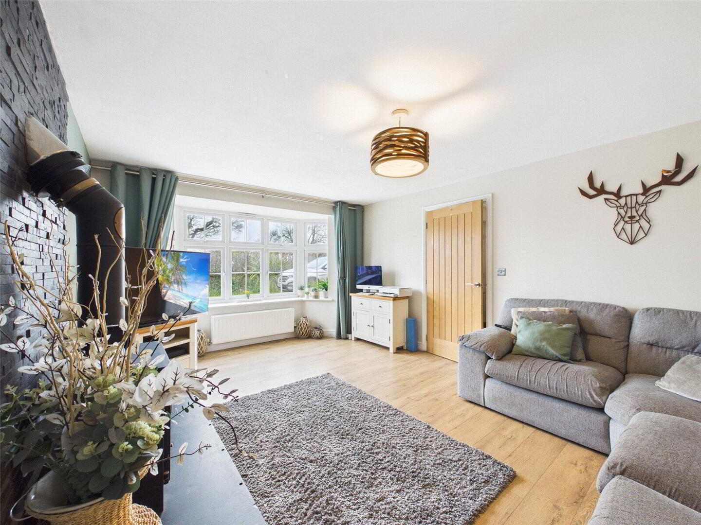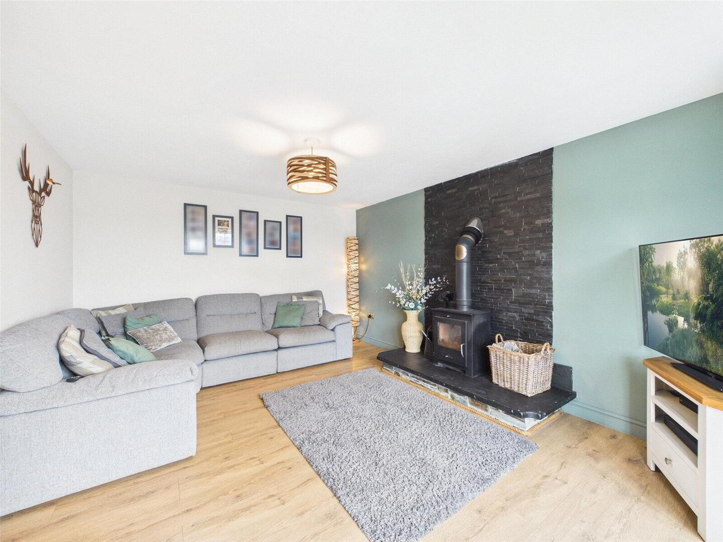 Upon entering, you are greeted by a spacious and welcoming entrance hallway, offering access to a well-appointed ground floor cloakroom complete with a low-level W.C. and a wall-mounted wash hand basin. The elegant living room, located at the front of the property, is bathed in natural light from a striking bay window, while a recently installed log burner creates a warm and inviting atmosphere—perfect for relaxing evenings.