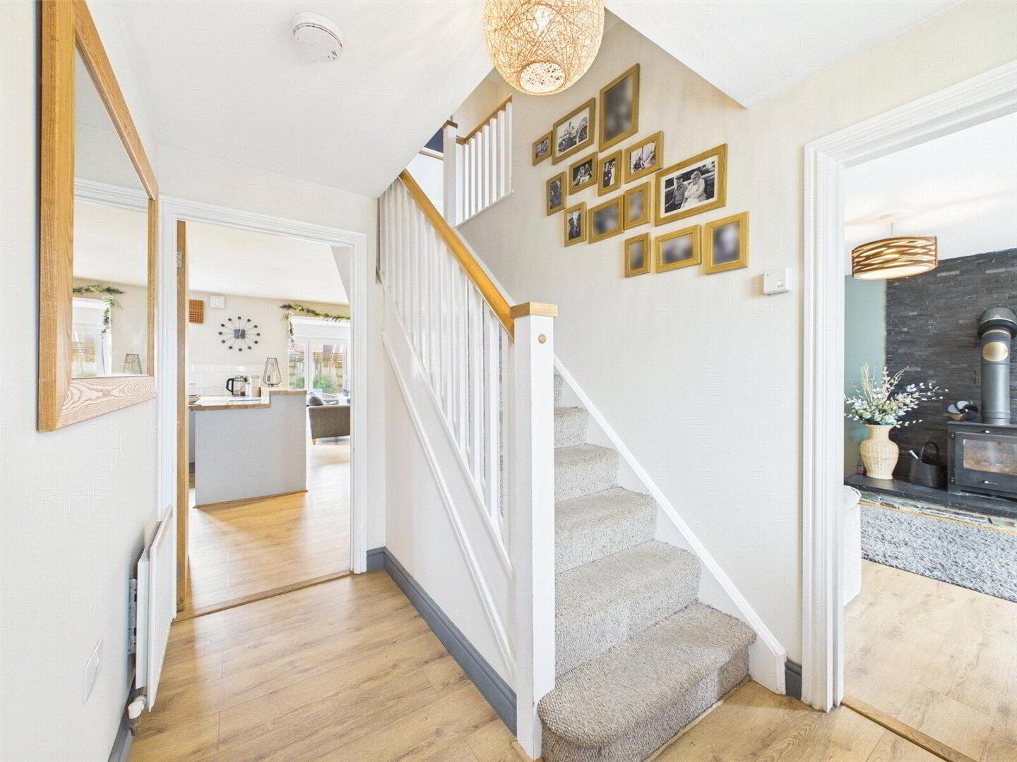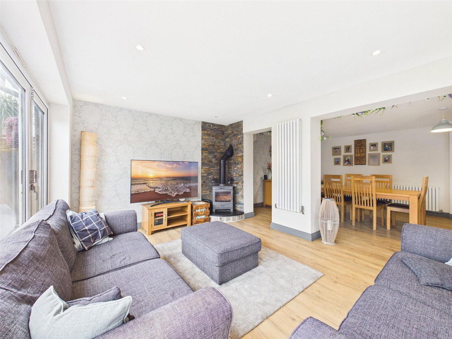 Undoubtedly the heart of the home is the stunning open-plan kitchen, dining, and living space. Thoughtfully extended, this impressive area provides a superb environment for both everyday family life and entertaining. Featuring bi-fold doors that seamlessly connect the indoors with the rear garden, along with a second log burner, this versatile space can be enjoyed all year round. A separate utility room, conveniently located off the kitchen, offers additional storage and side access.