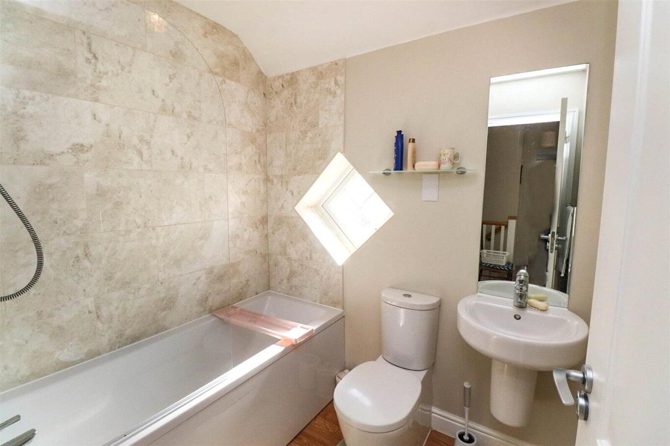 A fitted suite comprising panel bath with shower over, wall hung wash hand basin and low flush WC. Heated towel rail. Window to front elevation. - Outside