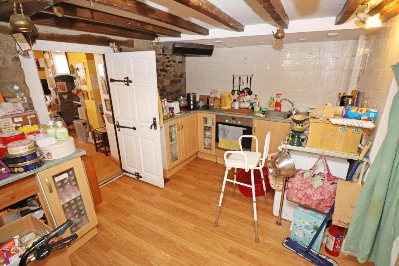 Wall and base units with roll-edge worksurfaces. Tiled splashbacking. Inset stainless steel sink. Built-in electric cooker and hob with extractor hood over. Space and plumbing for washing machine. Exposed ceiling beams. Exposed stone work to one wall. Laminate wood flooring.