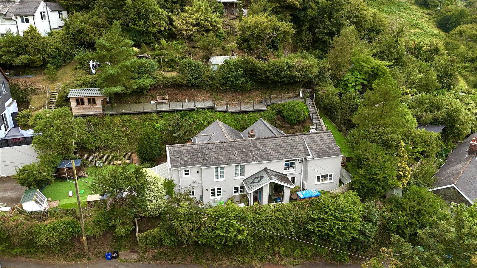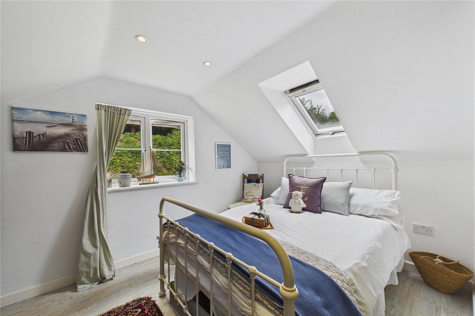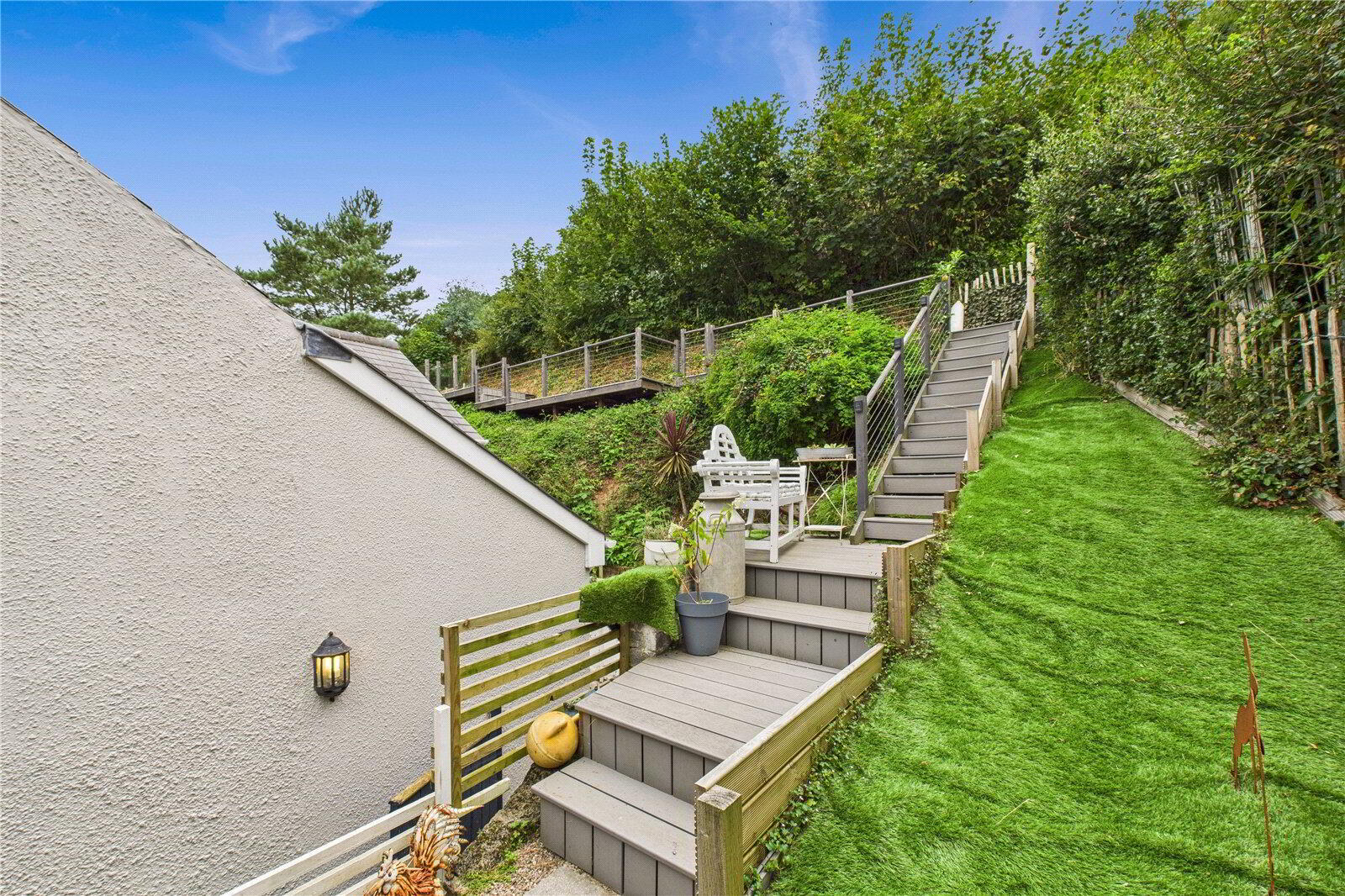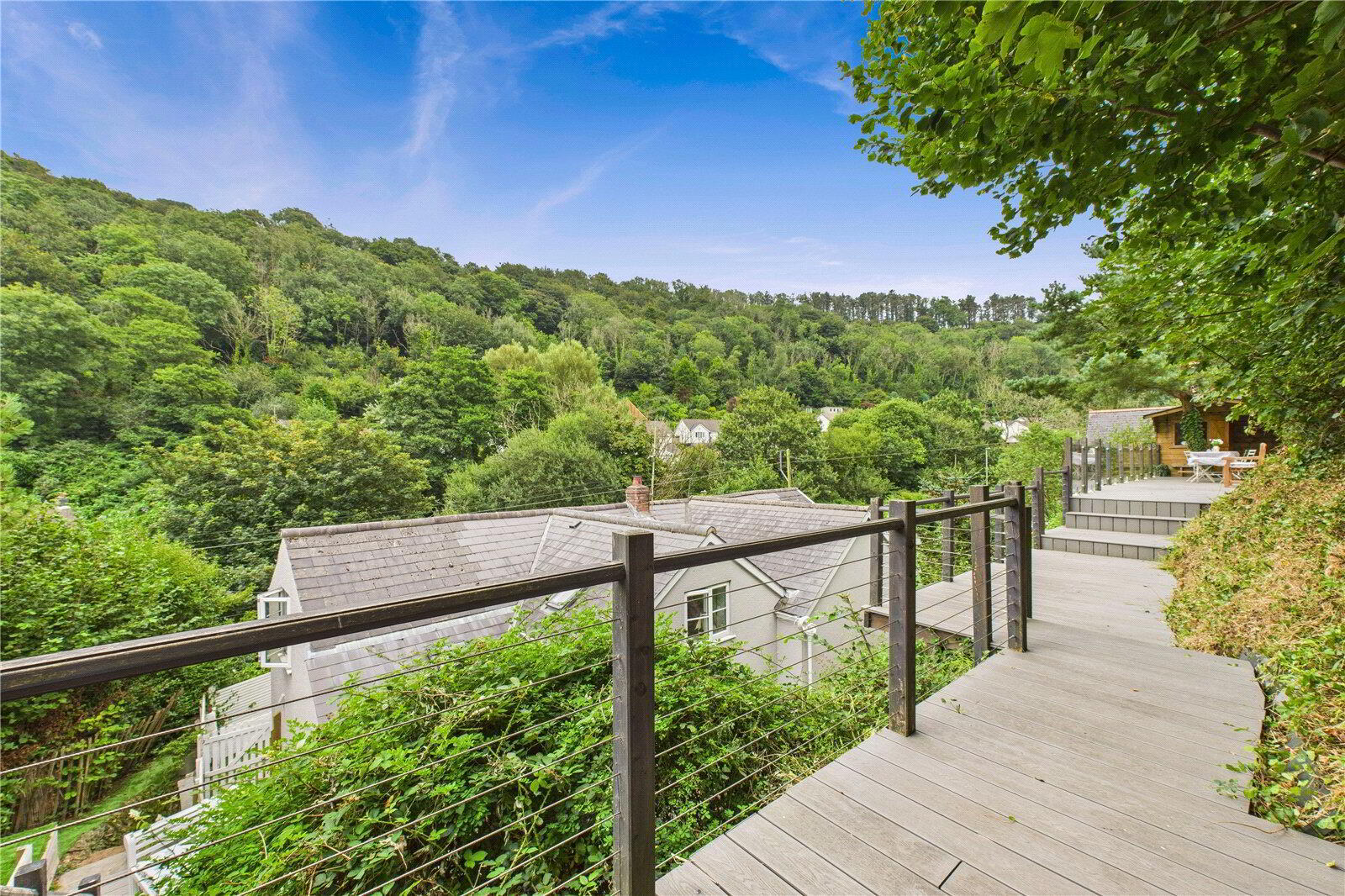 The landscaped, tiered garden is a sanctuary in itself with a level lawn, timber greenhouse, and an elevated deck with glimpses of the sea. At its highest point, a stylish summer house provides panoramic countryside and coastal vistas, the perfect setting for evening drinks as the sun sets.