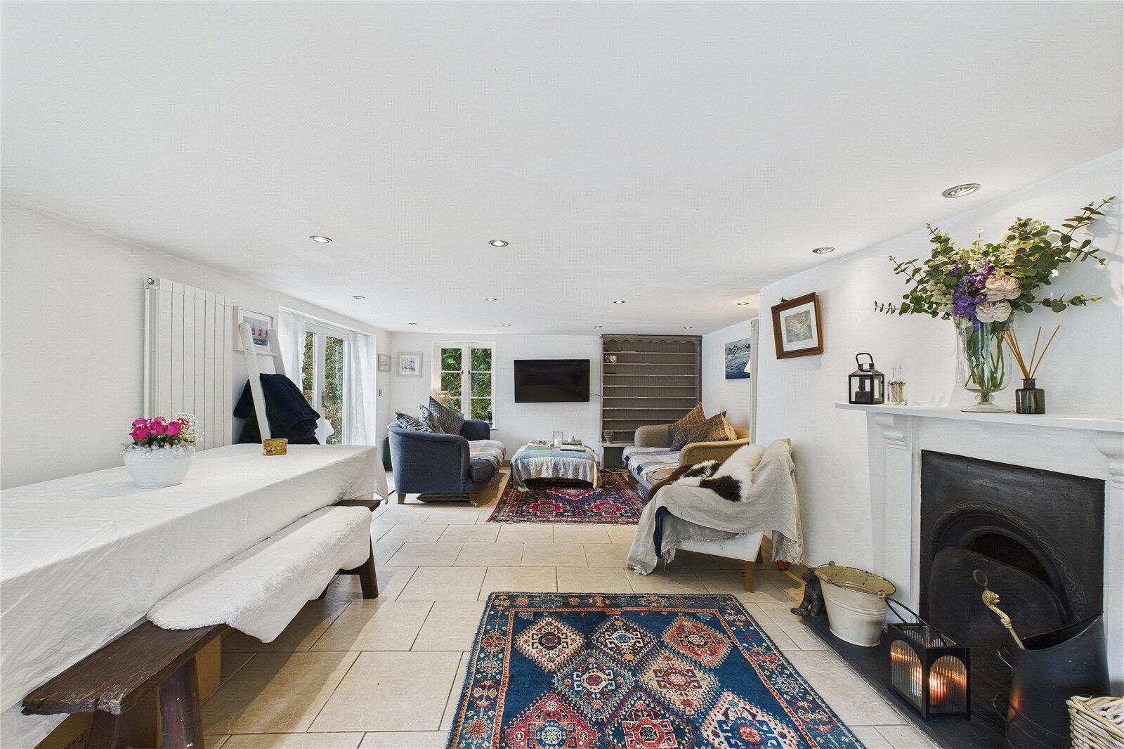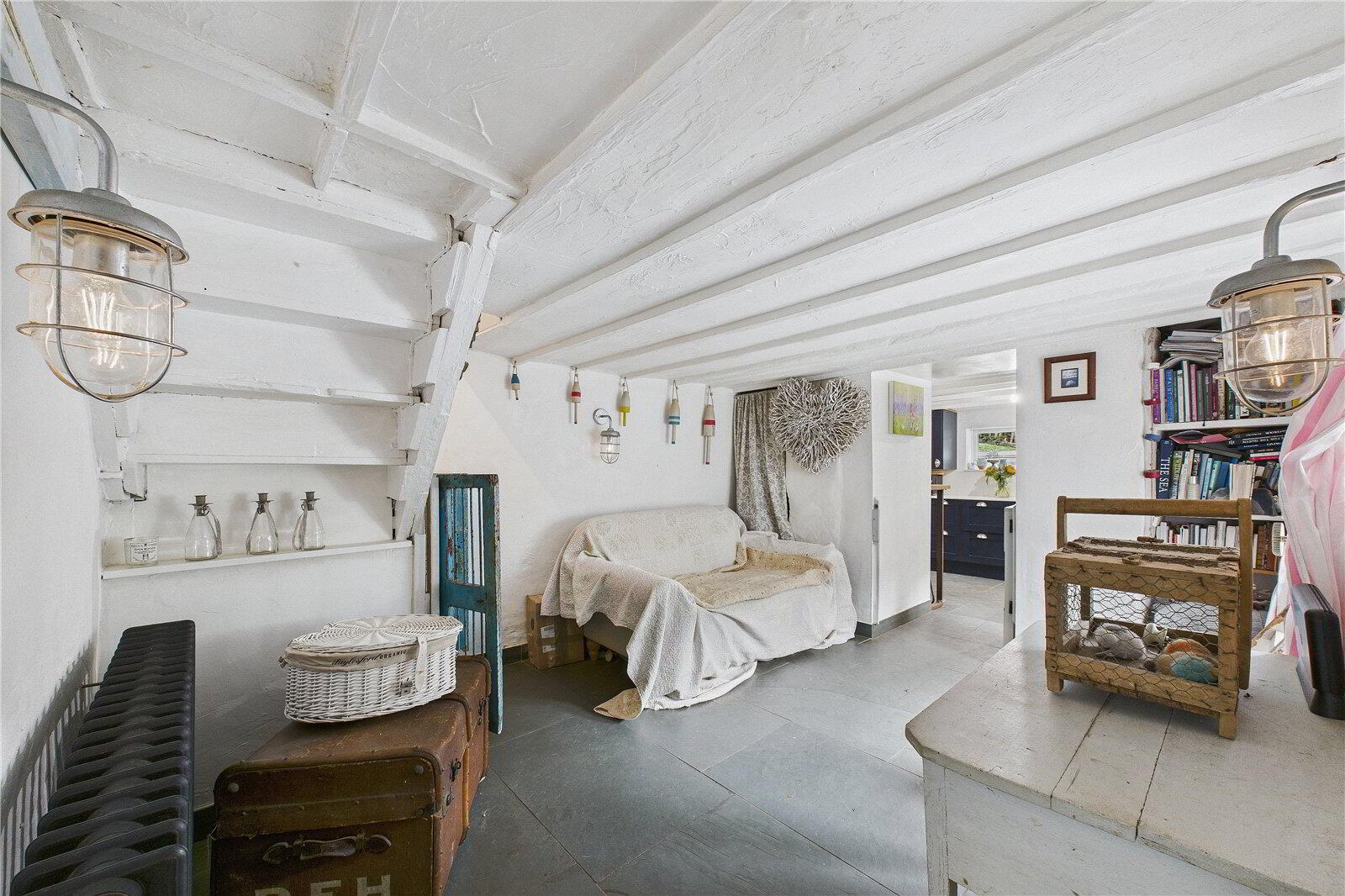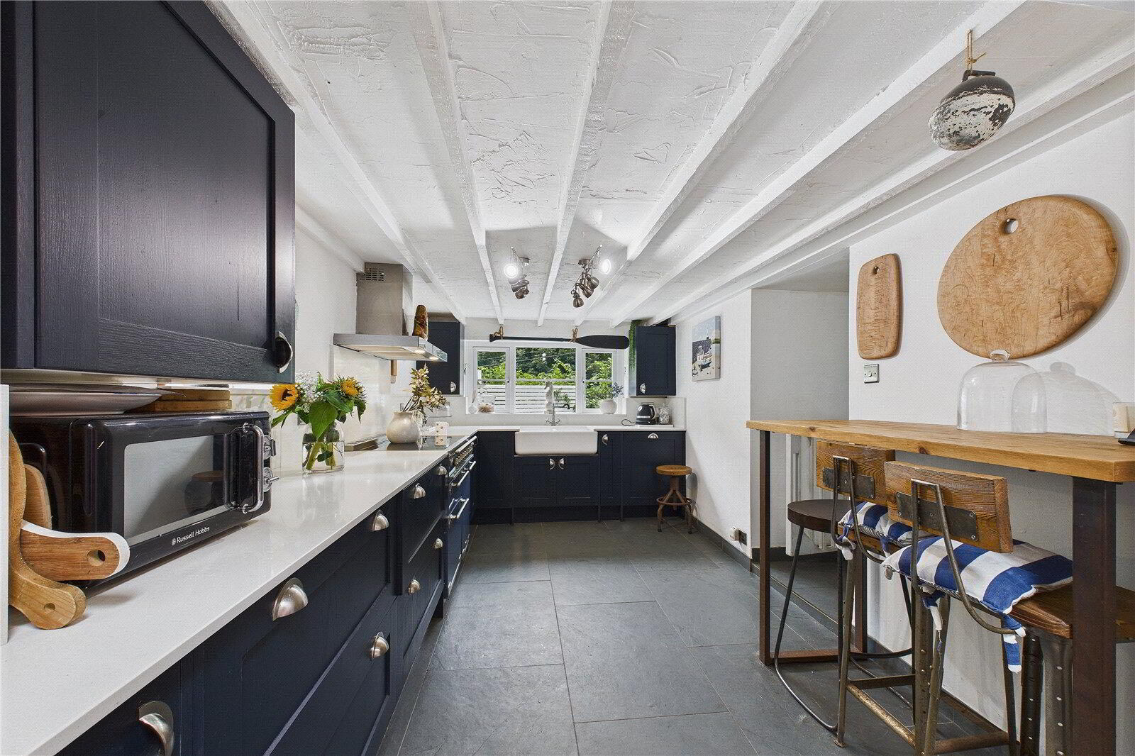 A light-filled porch opens into a versatile dining or snug area, ideal for relaxed evenings or intimate gatherings. The impressive sitting room enjoys dual-aspect views, an open fireplace, and French doors leading seamlessly to the garden. The bespoke country kitchen is a focal point of the home, featuring royal blue cabinetry, Apollo quartz worktops, a double Belfast sink, and natural slate flooring, complemented by a sunlit breakfast area and practical utility room.