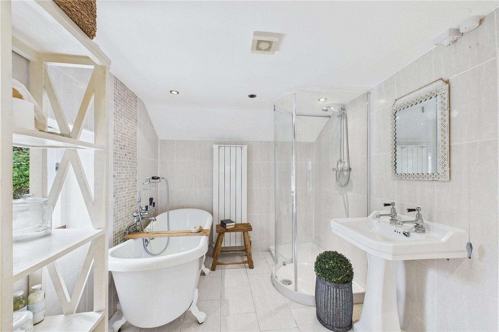 The ground floor offers a flexible bedroom with private shower room, perfect for guests, a home office, or boutique holiday let. Upstairs, the indulgent master suite boasts a walk-in wardrobe and a spa-style en-suite with claw-foot bath, rainfall shower, and Burlington fittings. Two additional double bedrooms and a sleek family shower room complete this level.