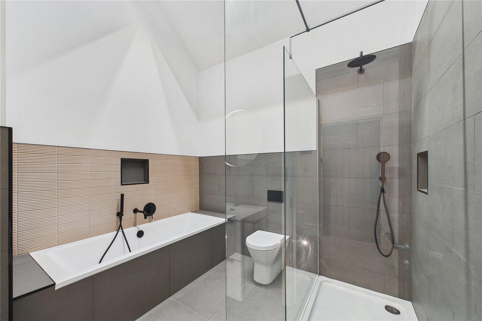 The high-specification kitchen is fitted with a full range of integrated appliances and leads through to a separate utility room, providing additional workspace and storage. Both bedrooms are generous doubles, with the principal suite enjoying a sleek en suite shower room, while the main bathroom offers both a bath and separate shower, finished with stylish tiling and contemporary fittings.