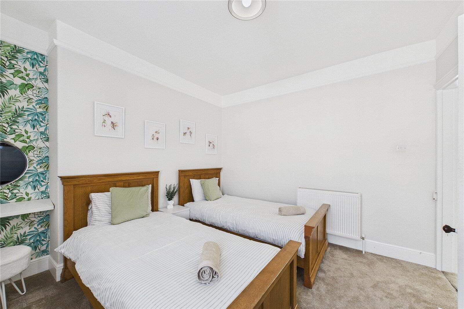 Upstairs, five comfortable bedrooms offer a variety of uses, from family accommodation to guest rooms or home offices. Each room has been tastefully decorated to maintain a sense of light and space. Two sleek, modern bathrooms serve the home, finished in a refined, neutral palette with high-quality fittings that add a touch of everyday luxury.