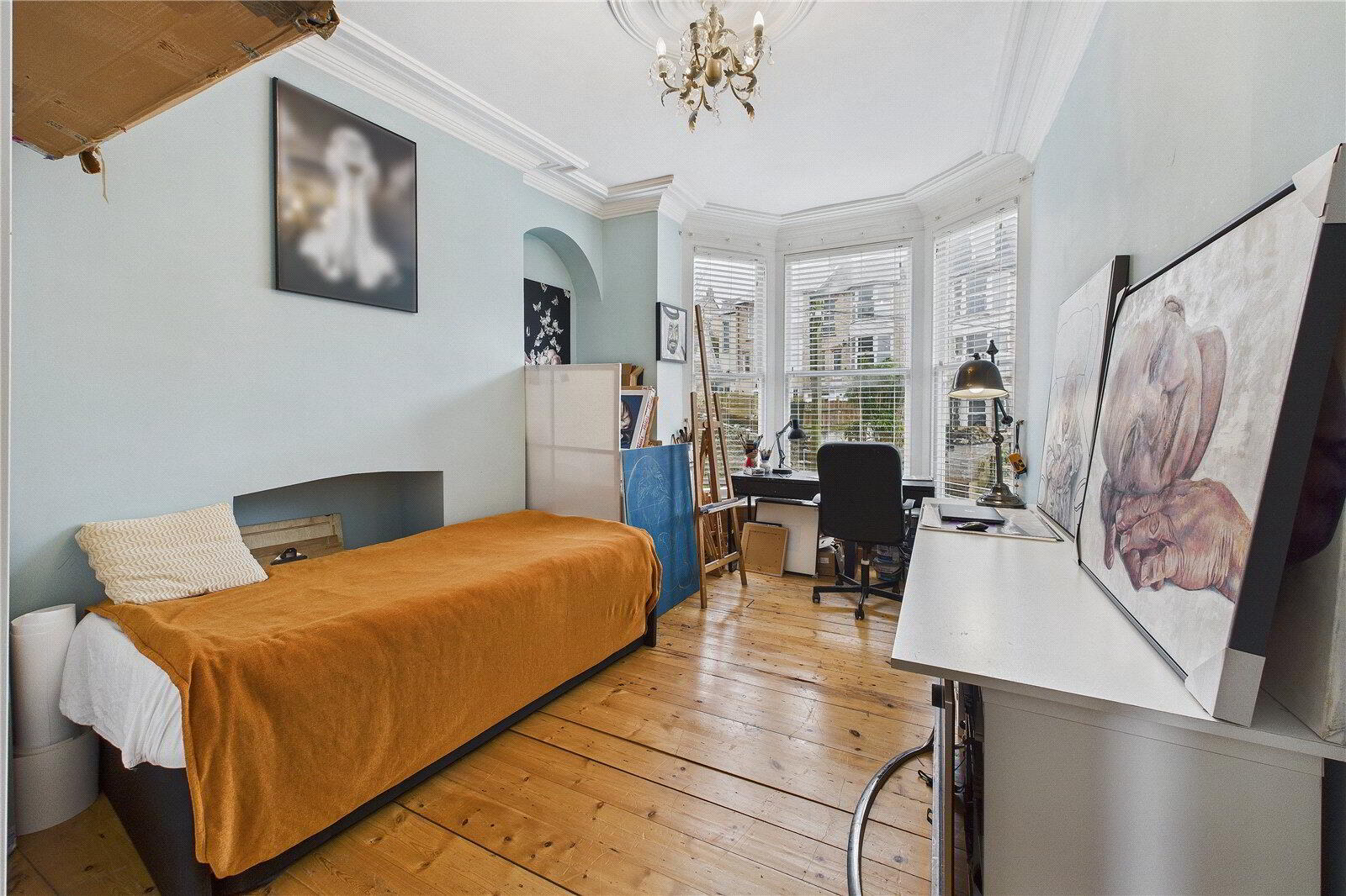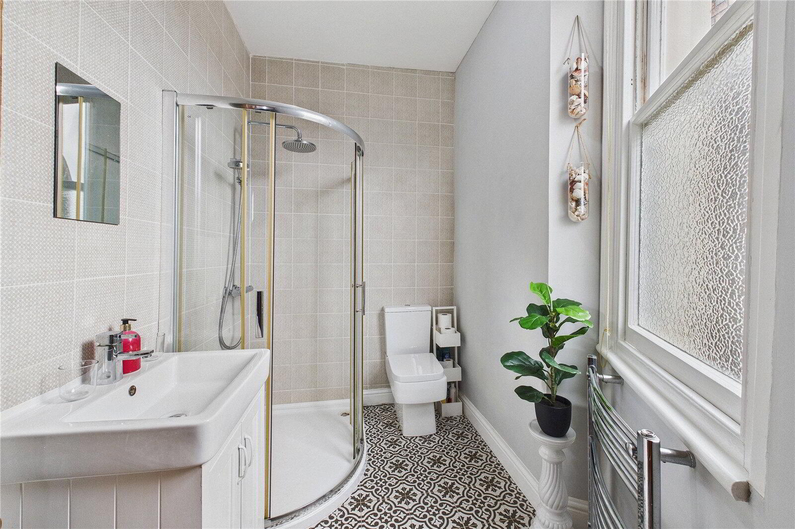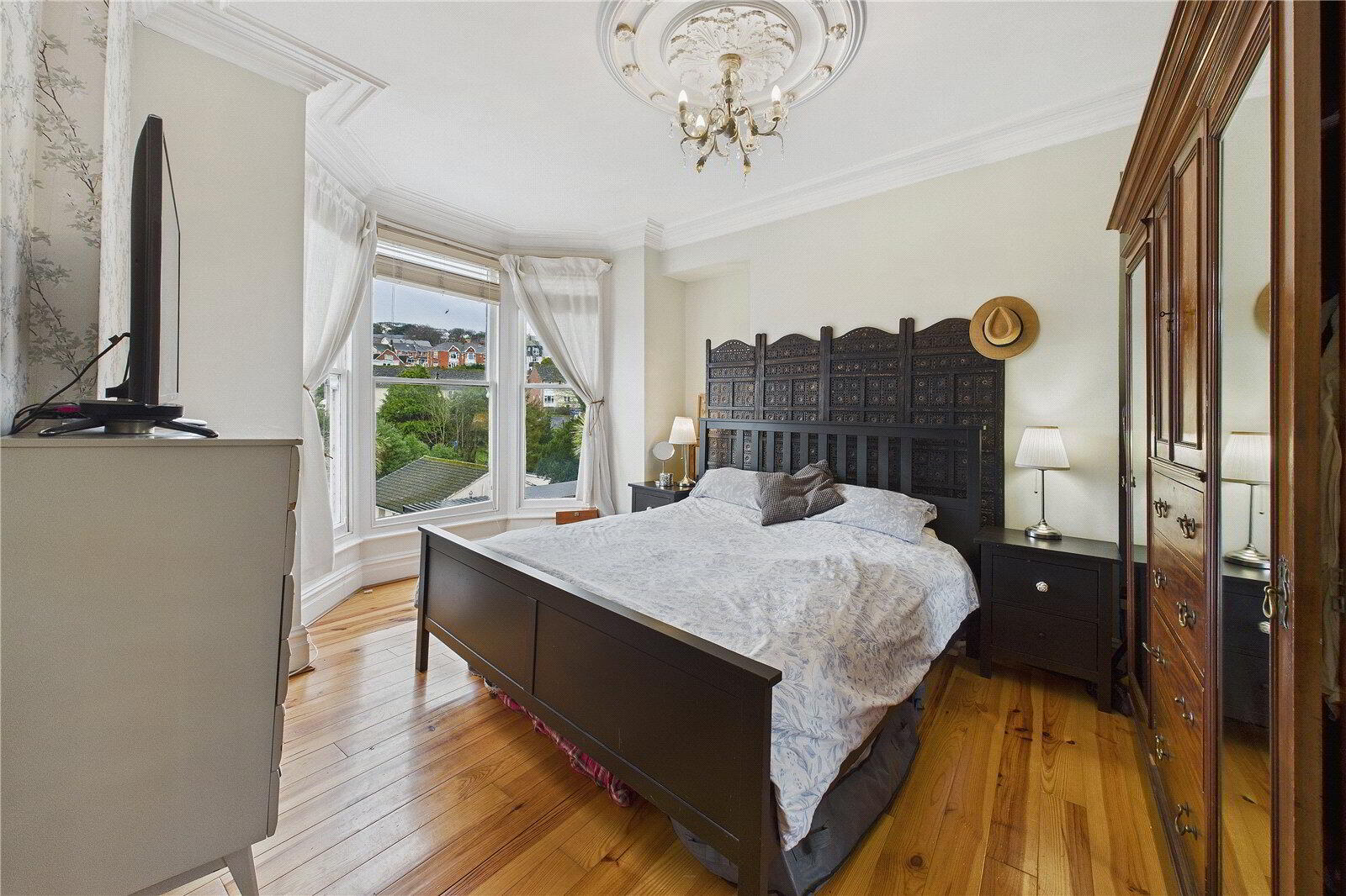 The first floor hosts the principal bedroom and a further double bedroom, both benefitting from bay windows, ceiling roses and coving, alongside a well-appointed family bathroom. The second floor provides two additional double bedrooms and a second bathroom, which enjoys attractive sea views.