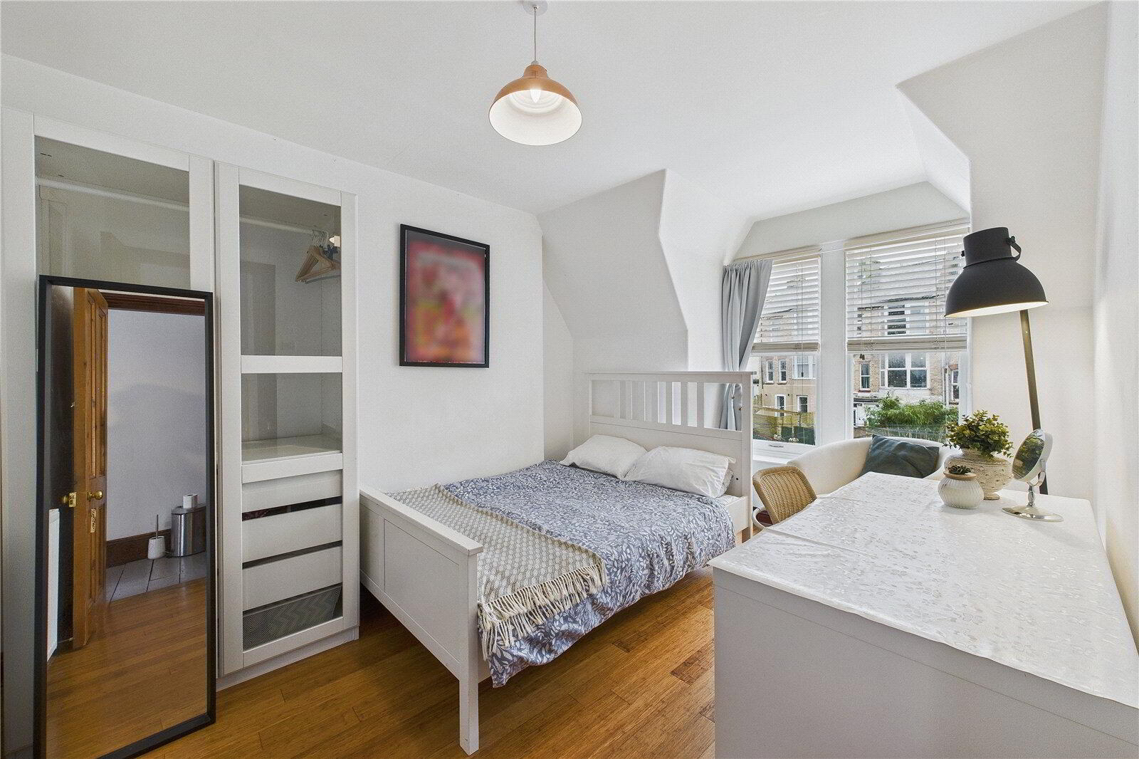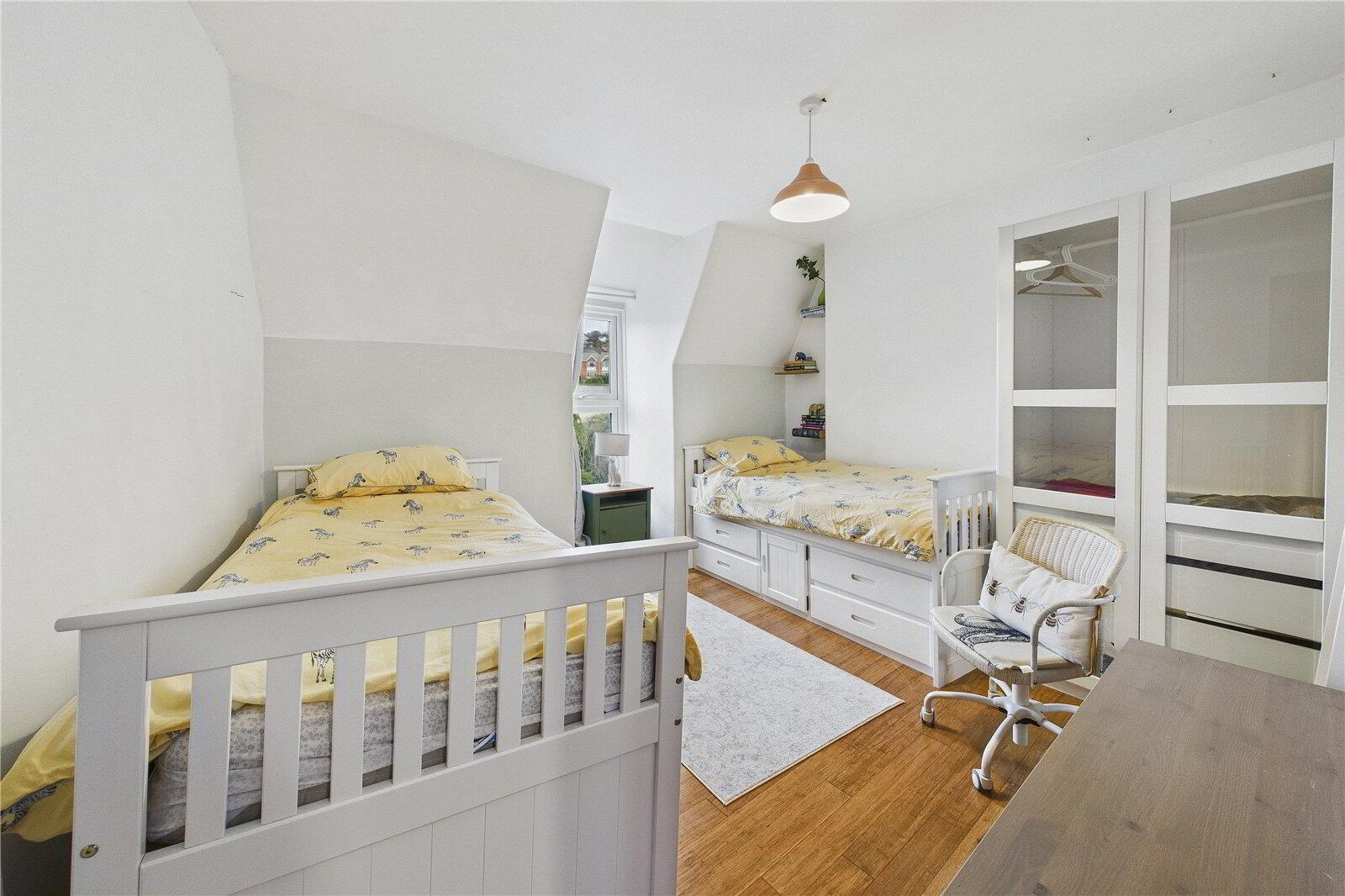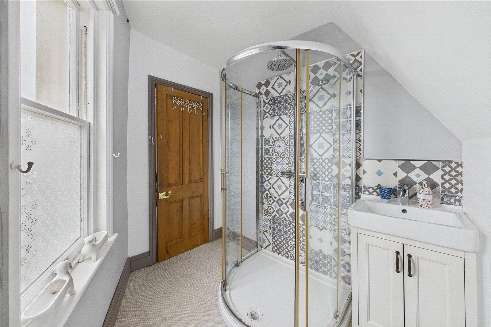 The first floor hosts the principal bedroom and a further double bedroom, both benefitting from bay windows, ceiling roses and coving, alongside a well-appointed family bathroom. The second floor provides two additional double bedrooms and a second bathroom, which enjoys attractive sea views.