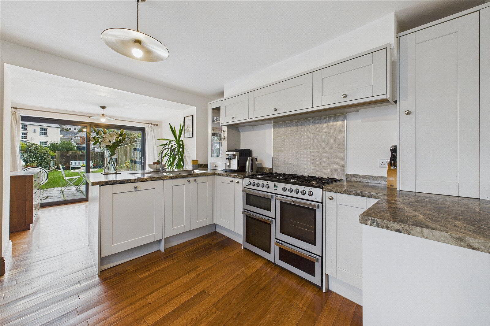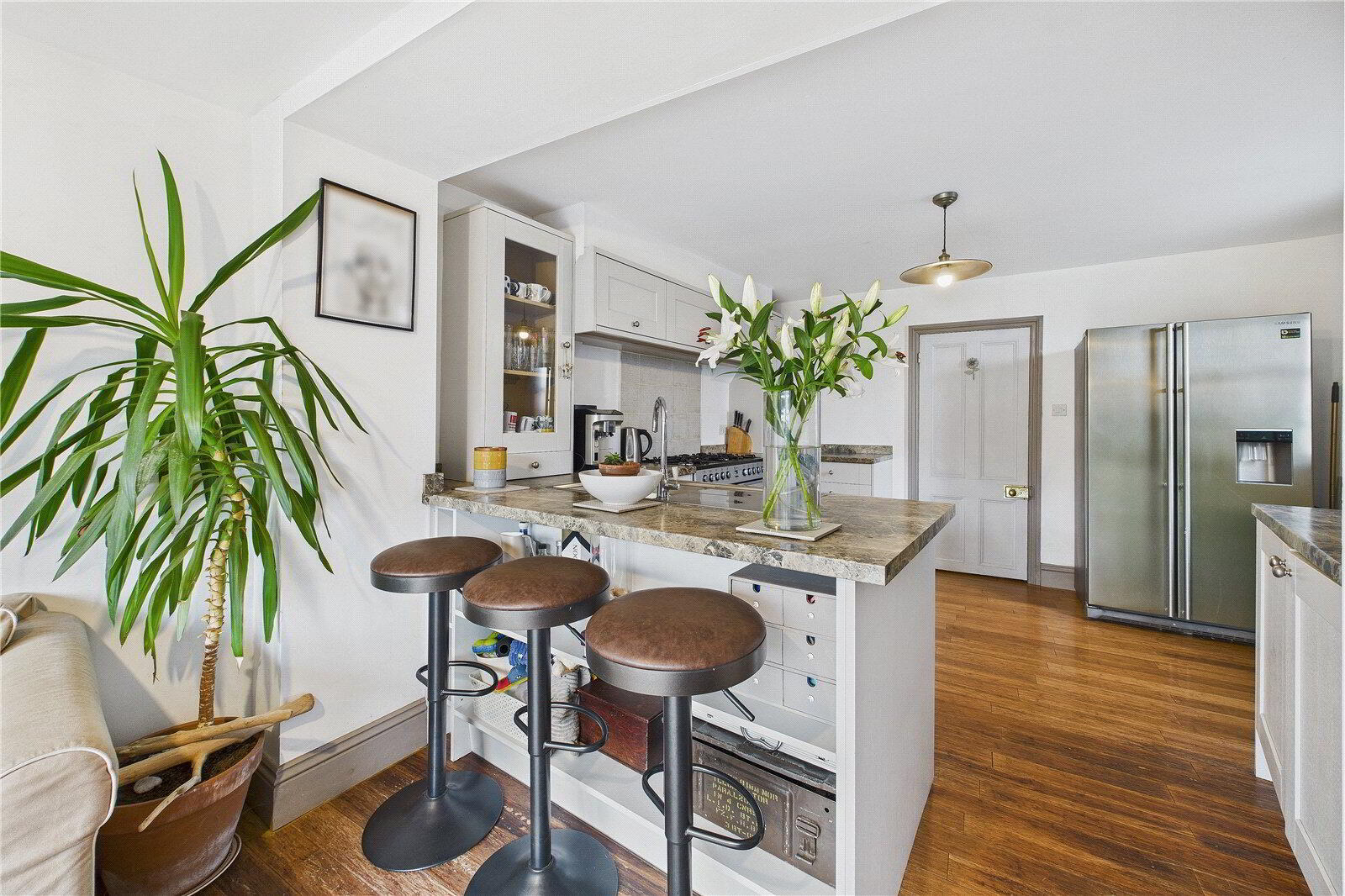 To the lower ground floor is a superb entertaining space, comprising a separate dining room and a stylish open-plan kitchen and sitting room. The kitchen is fitted with marble-effect worktops, benefits from excellent natural light and incorporates a breakfast bar, ideal for everyday use. Sliding double-glazed doors open directly onto a level patio and lawned garden, fully enclosed by wooden fencing and offering a private outdoor setting.