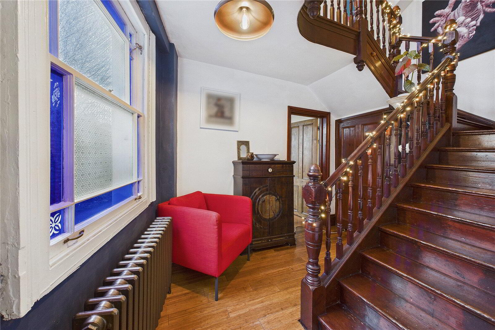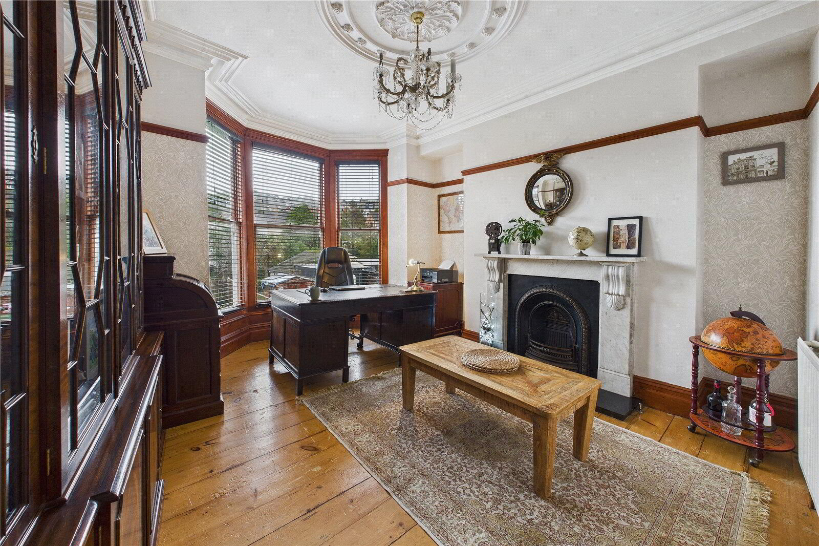 The ground floor opens into a welcoming entrance hallway, enhanced by stained-glass detailing and exposed wooden floorboards that immediately reflect the home’s Victorian heritage. This level includes the main living room with a character fireplace and a versatile fifth bedroom, currently utilised as a study or home office.