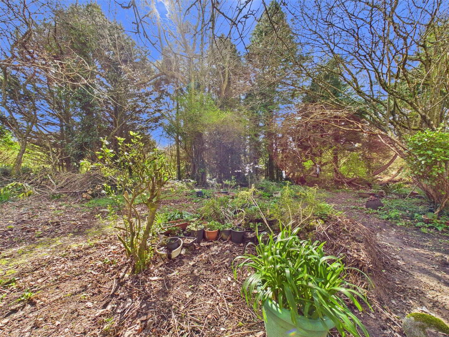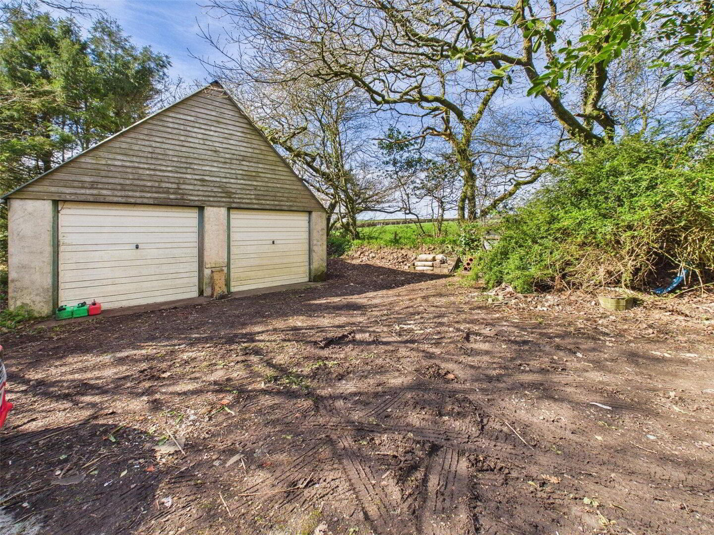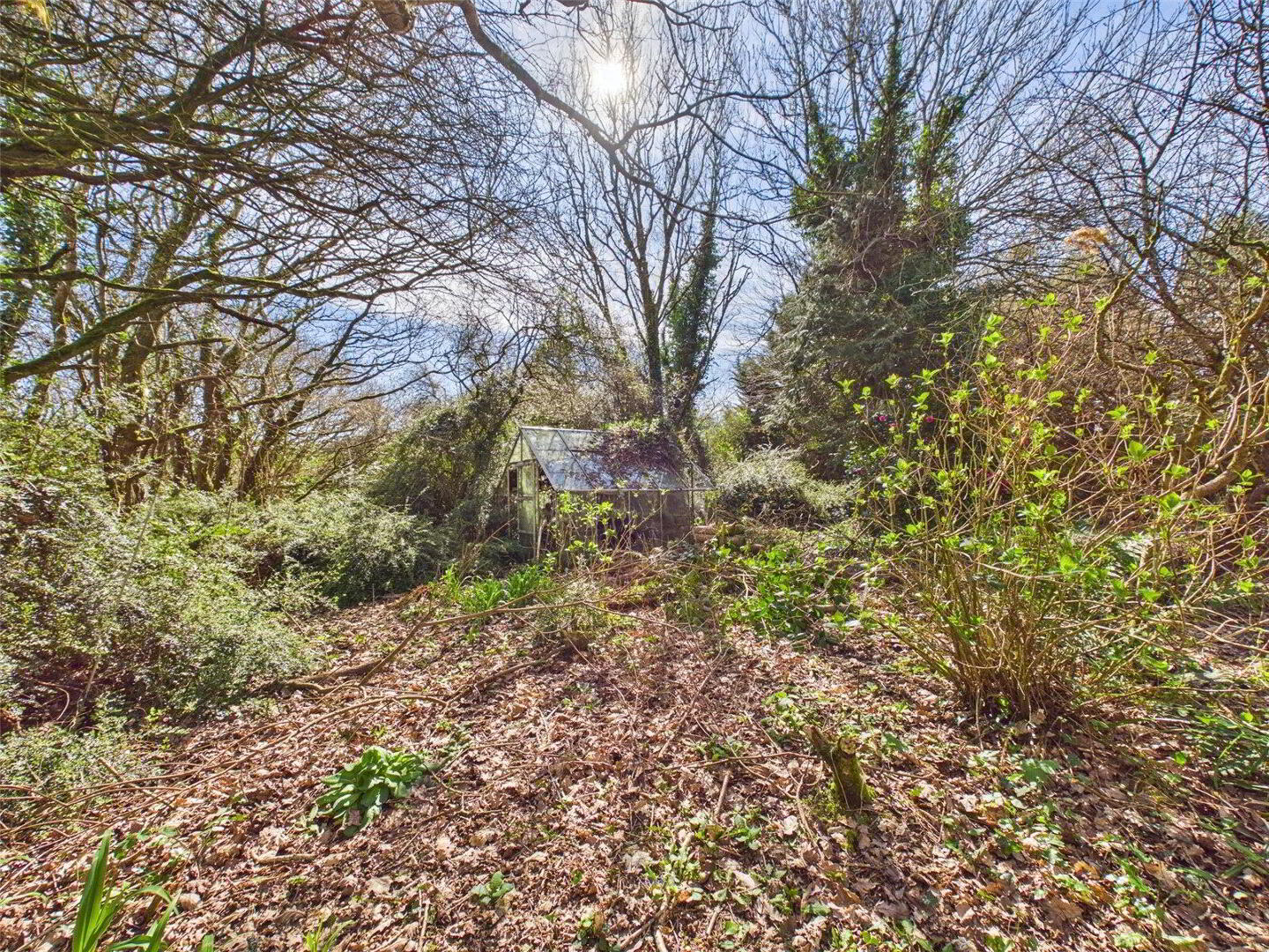 The property is approached via a private driveway providing ample off-road parking and access to a detached double garage with twin up-and-over doors. Set within generous, mature grounds, the gardens offer a high degree of privacy with a mix of lawn, established planting and natural woodland. The plot enjoys a pleasant outlook over surrounding countryside and includes a greenhouse along with various areas ideal for gardening or further landscaping. A paved patio adjoins the property, providing an ideal space for outdoor dining.