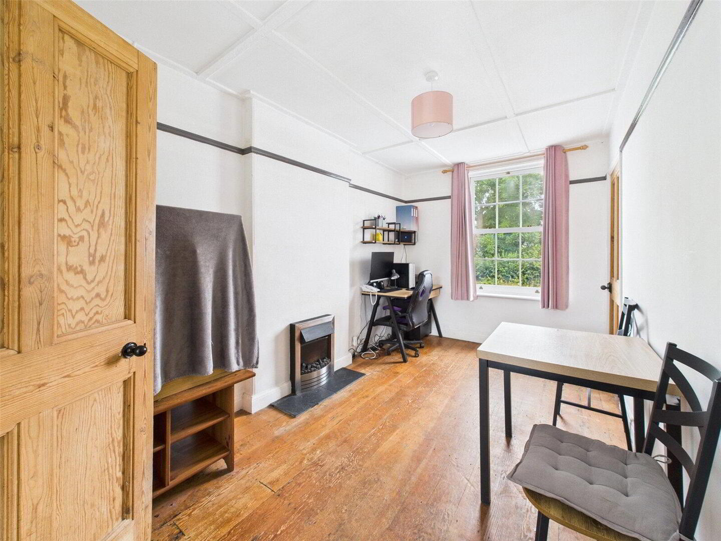 Step inside, and you’re greeted by an inviting entrance hall with warm tiled flooring and underfloor heating, guiding you to two elegant reception rooms, both rich with character and featuring original fireplaces. Light pours in through sash windows, framing picturesque views and adding to the welcoming feel.