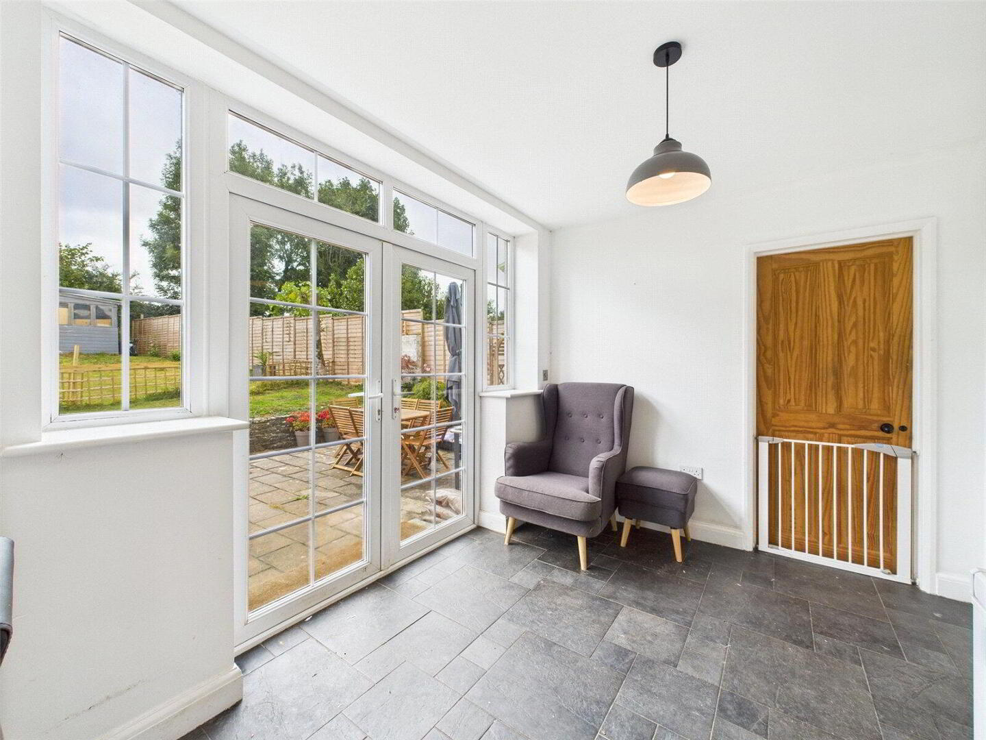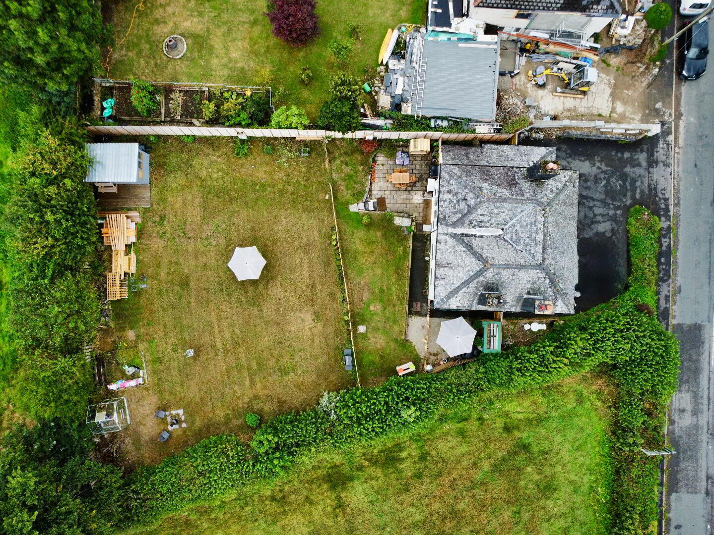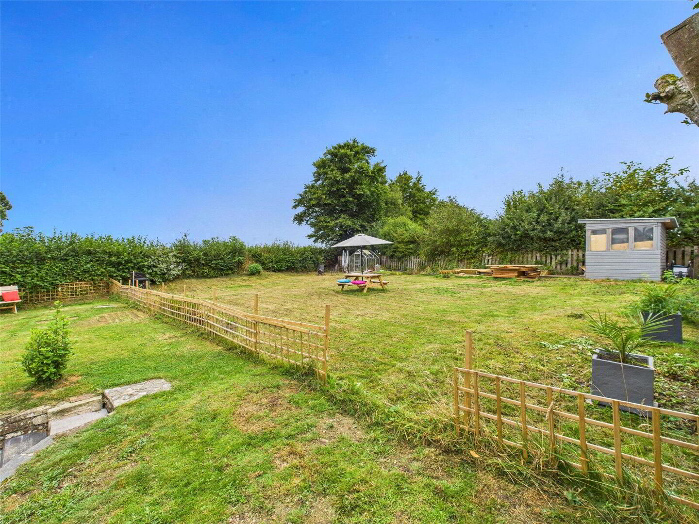 The rear garden is a real sanctuary, perfect for both relaxation and recreation. A large patio provides an ideal spot for summer dining, while the extensive lawn is framed by mature planting, and established borders. For those who enjoy gardening, there is a dedicated vegetable patch, greenhouse, and composting area, plus a summer house offering a hobby space or ready to go storage.