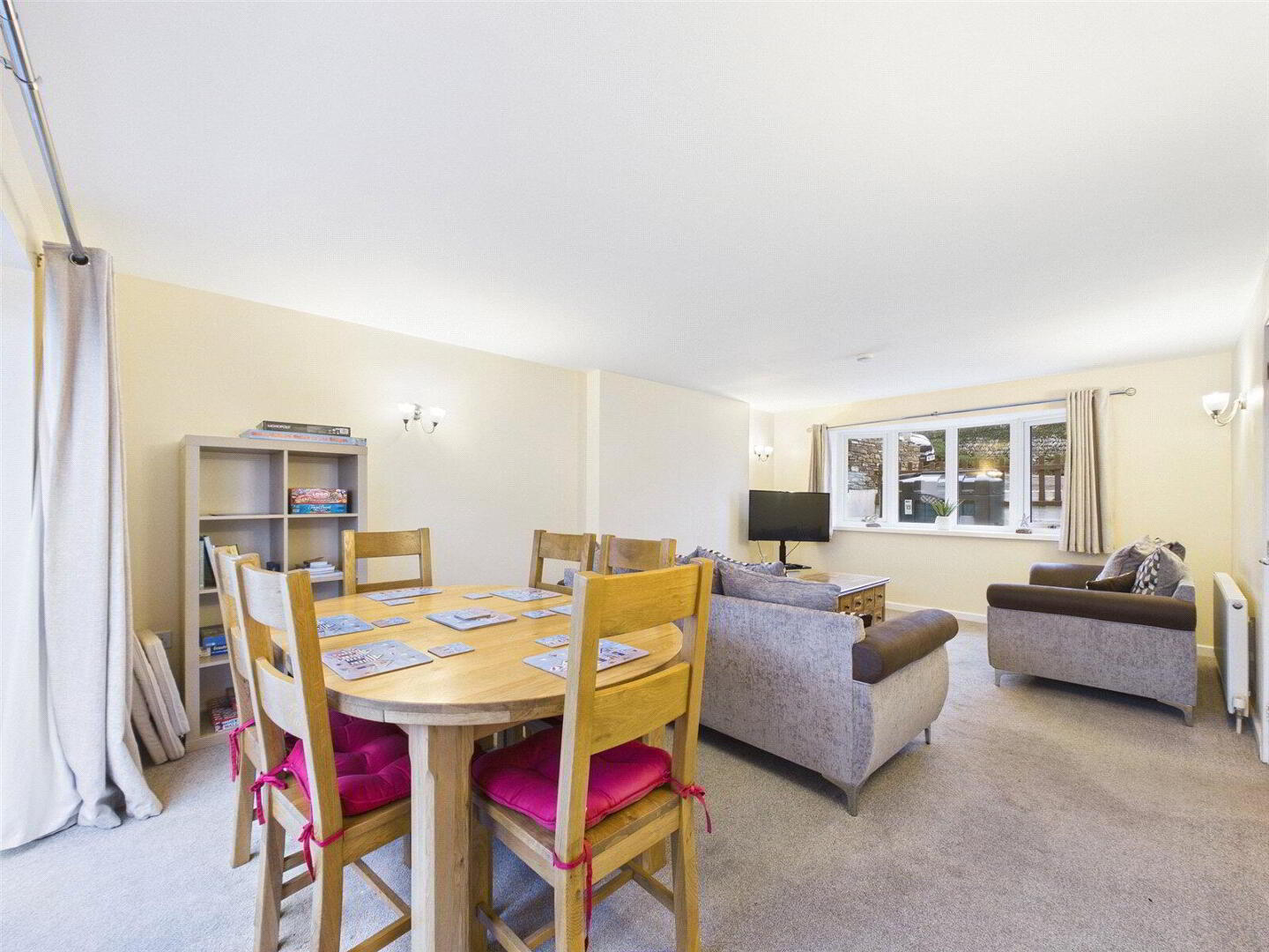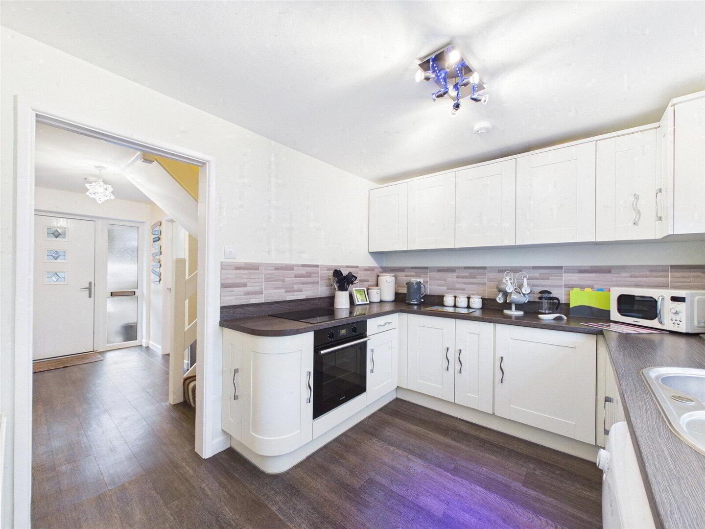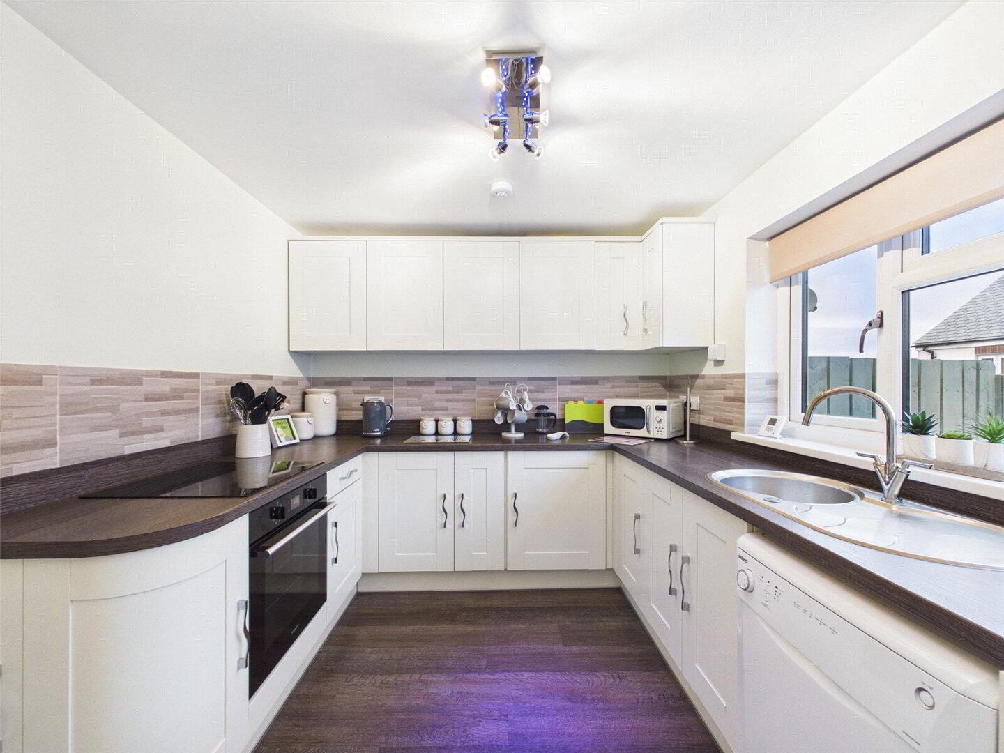 Completing the ground floor is the modern separate kitchen, featuring contemporary appliances, ample worktop space, and generous cupboard storage. The kitchen currently houses a dishwasher, however this can be replaced with a washing machine if required, as the property is presently utilised as a holiday let.