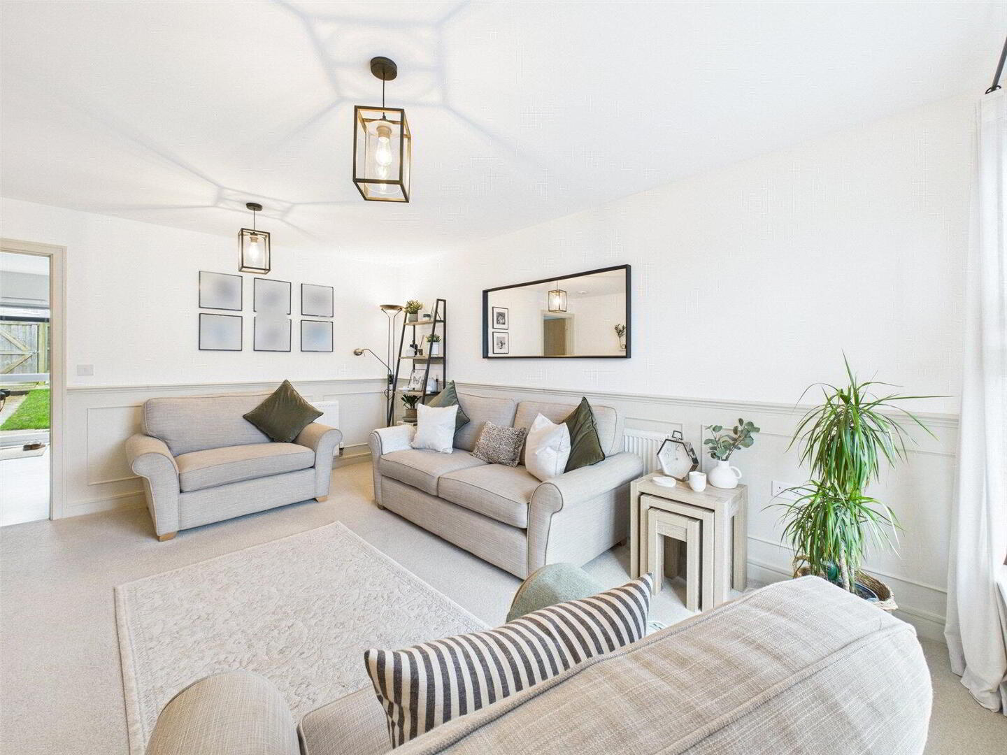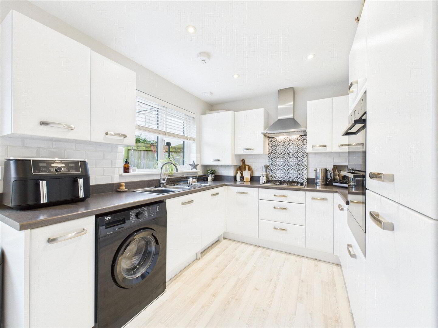 Beyond the living room, the open-plan kitchen and dining area features integrated appliances and a thoughtfully designed layout. The dining area is ideal for a family table and chairs, with double doors opening onto the rear