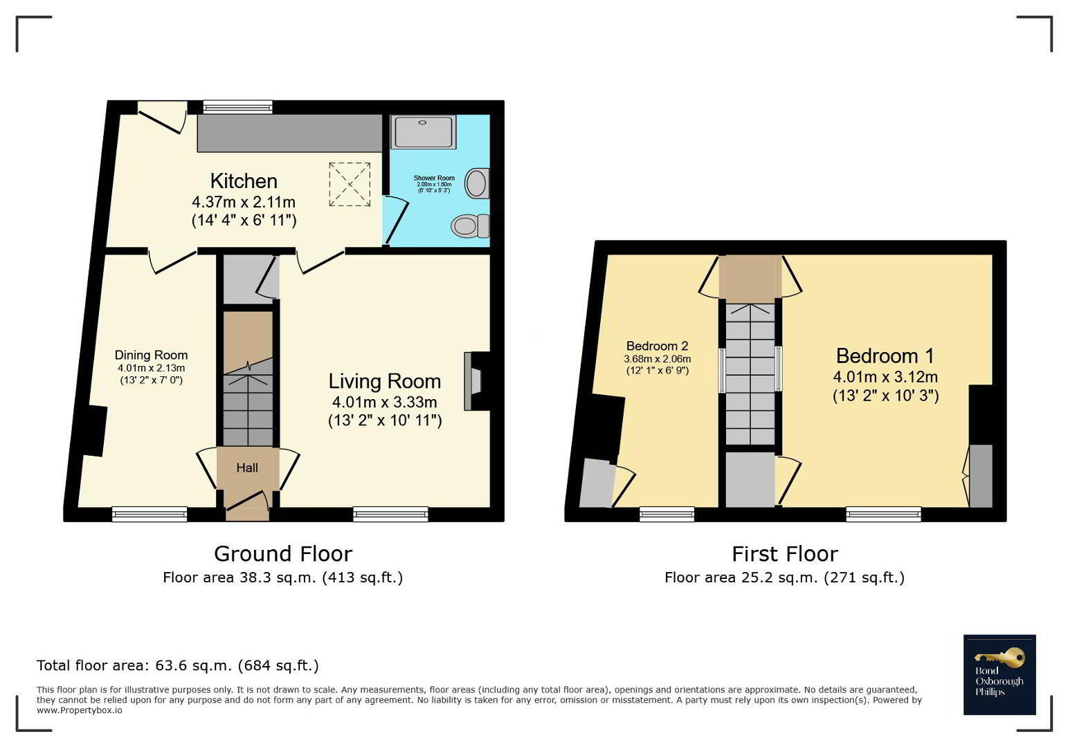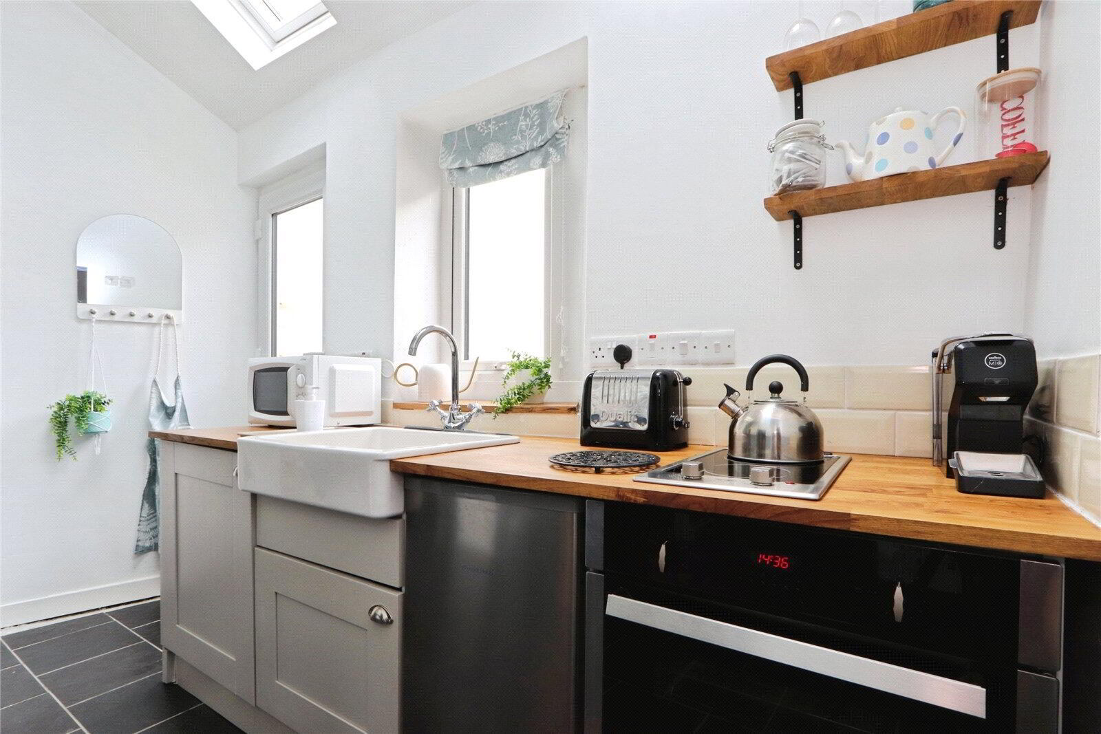 Inside, the house offers stylish and versatile accommodation, beginning with a welcoming Living Room centred around a charming wood burning stove set into the chimney breast. Across the Hallway, a second Reception Room provides flexible space that could serve as a dining area, home office or hobby room to suit a variety of lifestyles. To the rear lies the impressive Kitchen, where a high ceiling and twin Velux roof lights create a bright and airy feel. The Kitchen is fitted with a selection of base units and includes a 2-ring gas hob and built-in oven together with space and provision for a washing machine. Adjoining the kitchen is a contemporary ground floor Shower Room, finished to a high standard and featuring a walk-in double shower, a low level WC and a cabinet-mounted sink. Upstairs, the main Bedroom is generously sized and benefits from 2 built-in wardrobes and a front-facing double glazed window, while the second Bedroom, also a good size, has its own built-in cupboard and matching front aspect window.