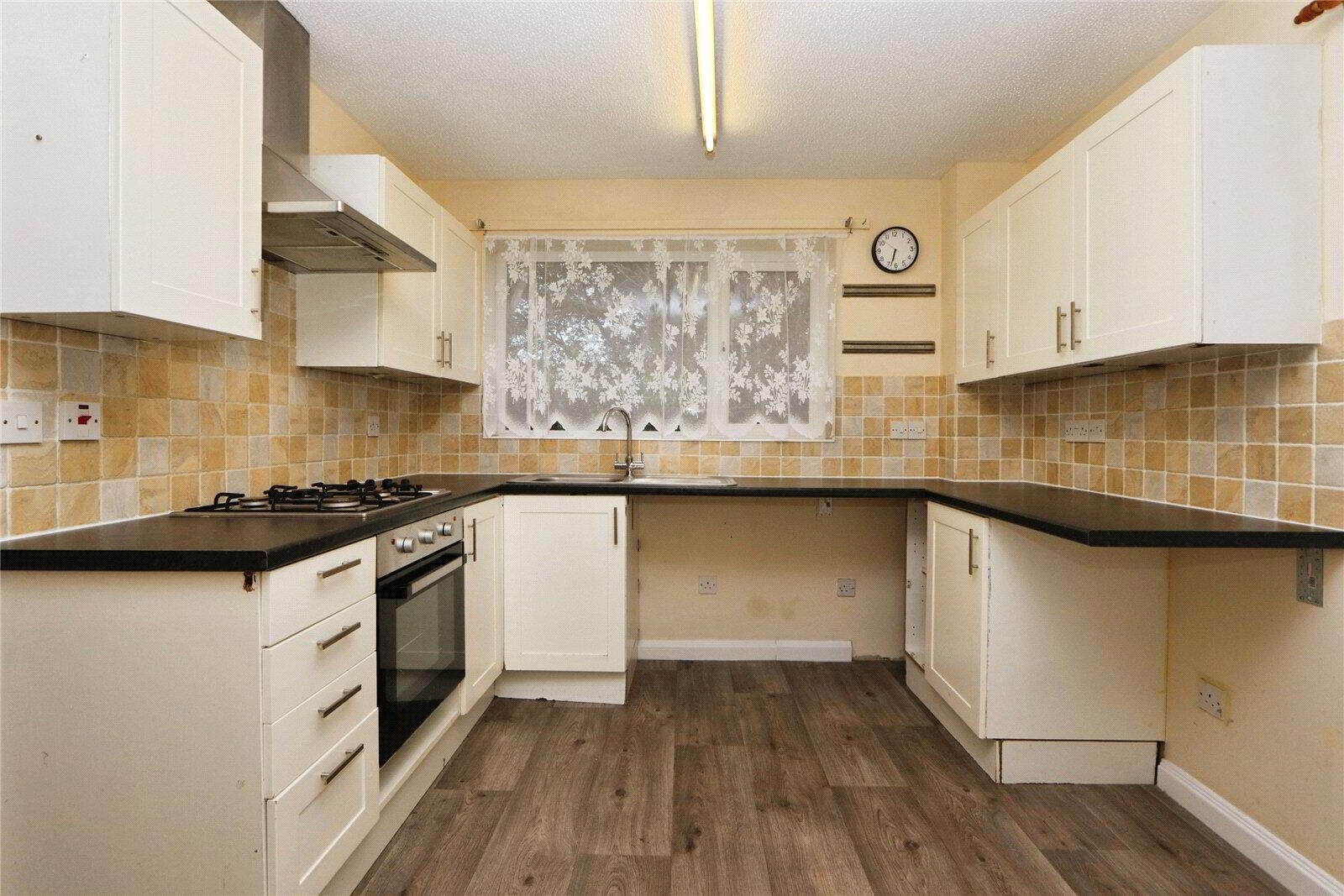 UPVC double glazed window overlooking the rear garden. UPVC double glazed door to the driveway. A range of eye and base units with matching drawers, work surface and inset sink and drainer with mixer tap over. Built-in oven and 4-ring gas hob with extractor over. Space and plumbing for washing machine, dishwasher and fridge / freezer. Tiled splashbacking, radiator, extractor fan, wood effect flooring. Built-in understairs storage cupboard.