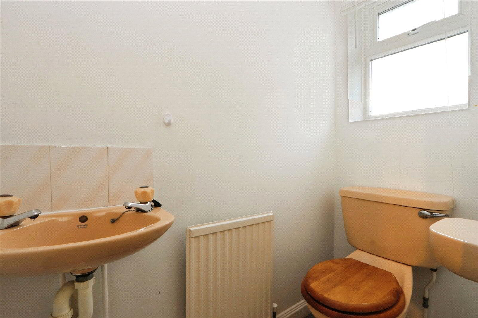 Close couple WC and wash hand basin with tiled splashbacking. Radiator, tile effect flooring. UPVC obscure double glazed window to property front.