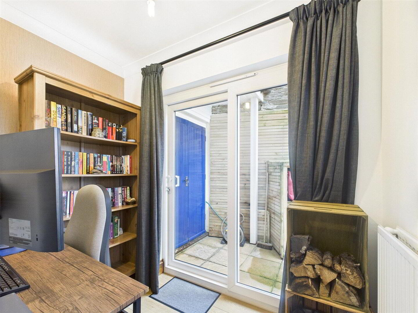 Downstairs, the entrance hall features understairs storage, leading into an open-plan kitchen and breakfast room with two striking arched windows to the front. The cosy living room centres around a feature fireplace with a log burner and enjoys views into the rear courtyard, while a separate study at the rear provides a flexible space for work or reading with double doors to the garden.