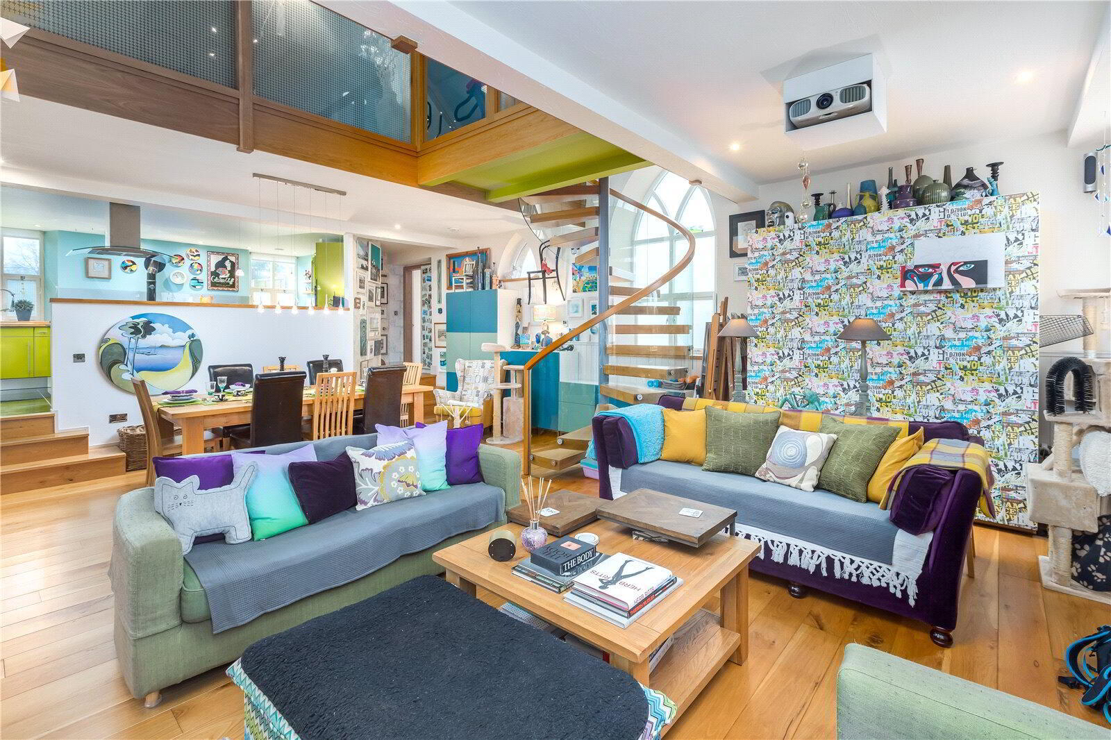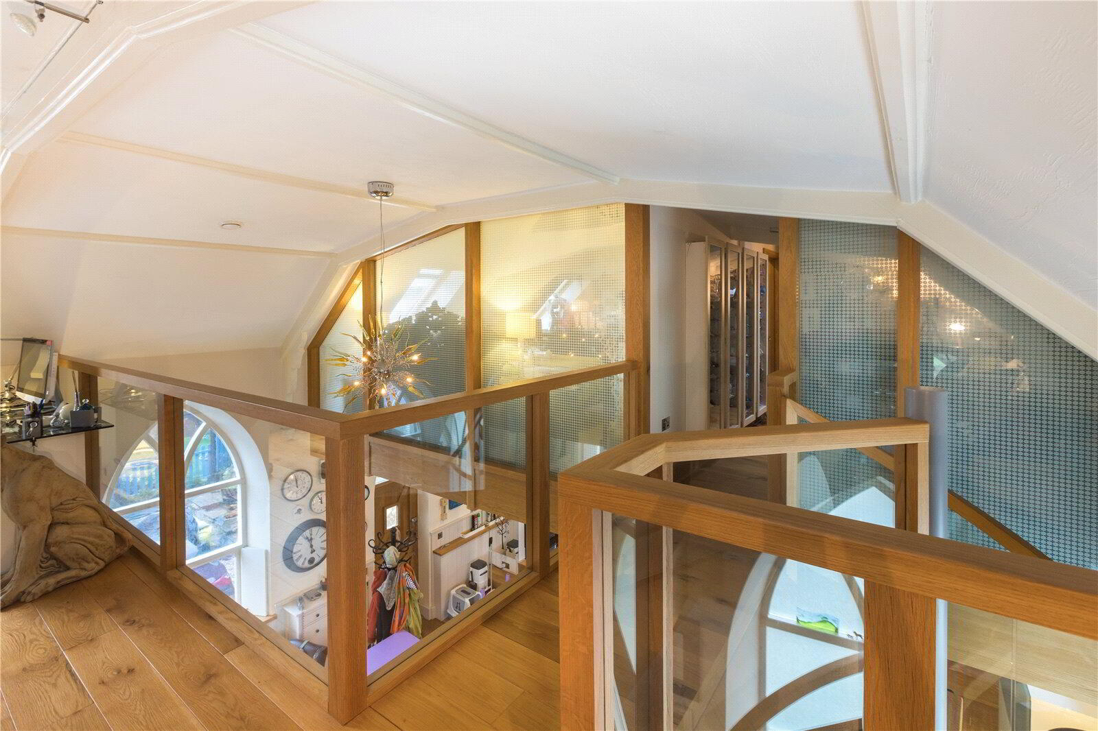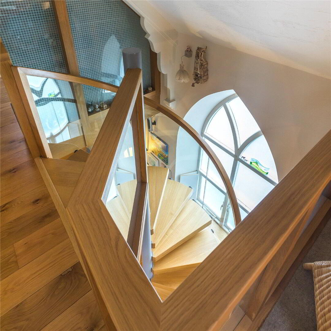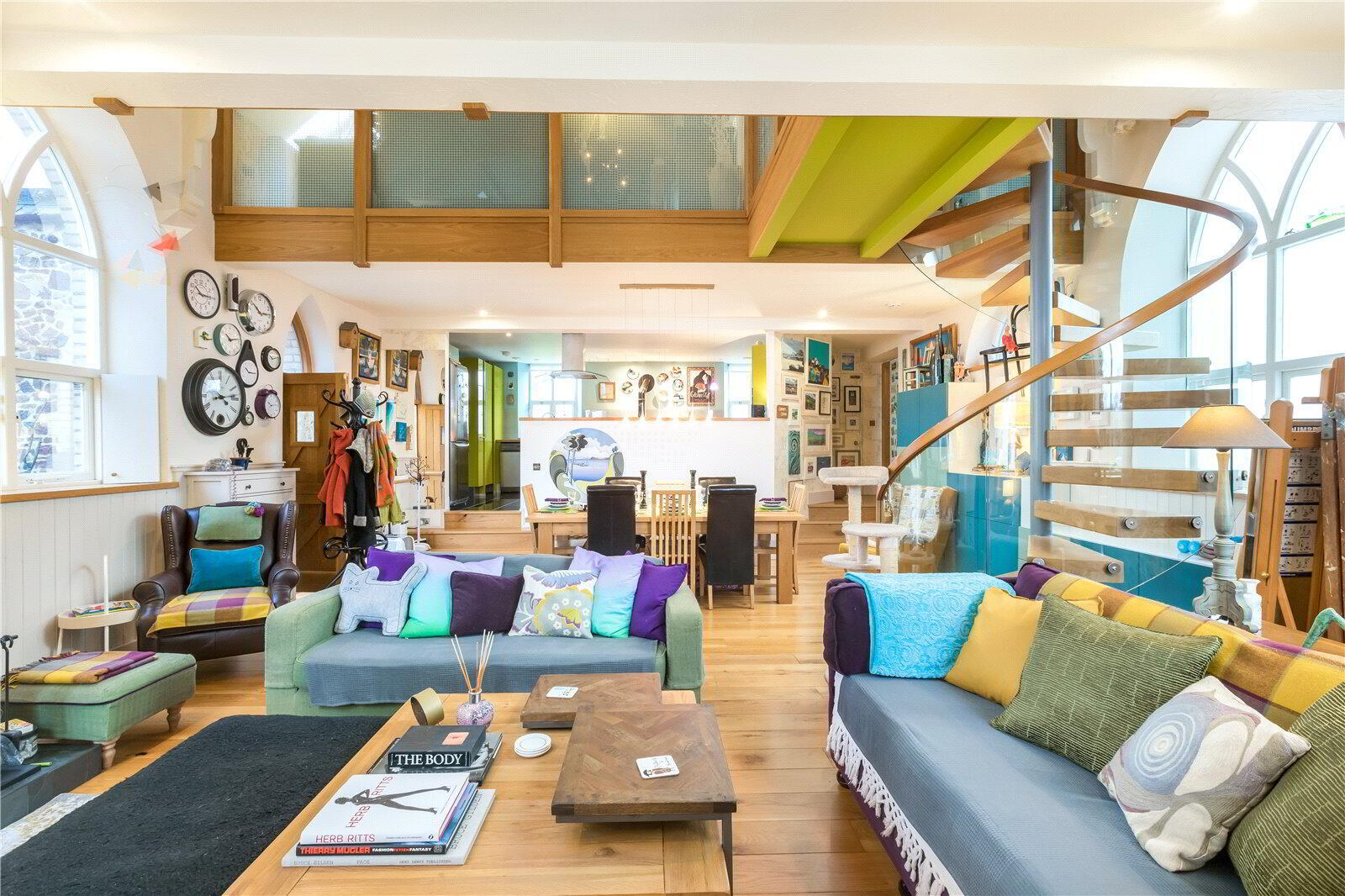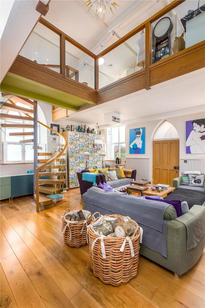 The architecturally designed conversion offers a generous open plan living/dining area, with steps to an open plan raised kitchen, allowing the host/hostess to cook and converse with friends and family when entertaining. Steps then lead up to a further reception room, or potential fourth bedroom. From the dining area, steps lead to a ground floor cloakroom and bedroom three with it’s own en suite shower room. A beautifully crafted oak and glass staircase then leads to the first floor landing and mezzanine, connected by a bridge which provides a large open area that currently utilised as a study area/ library. On the other side of the bridge there are two further bedrooms, both with en suite bathrooms.