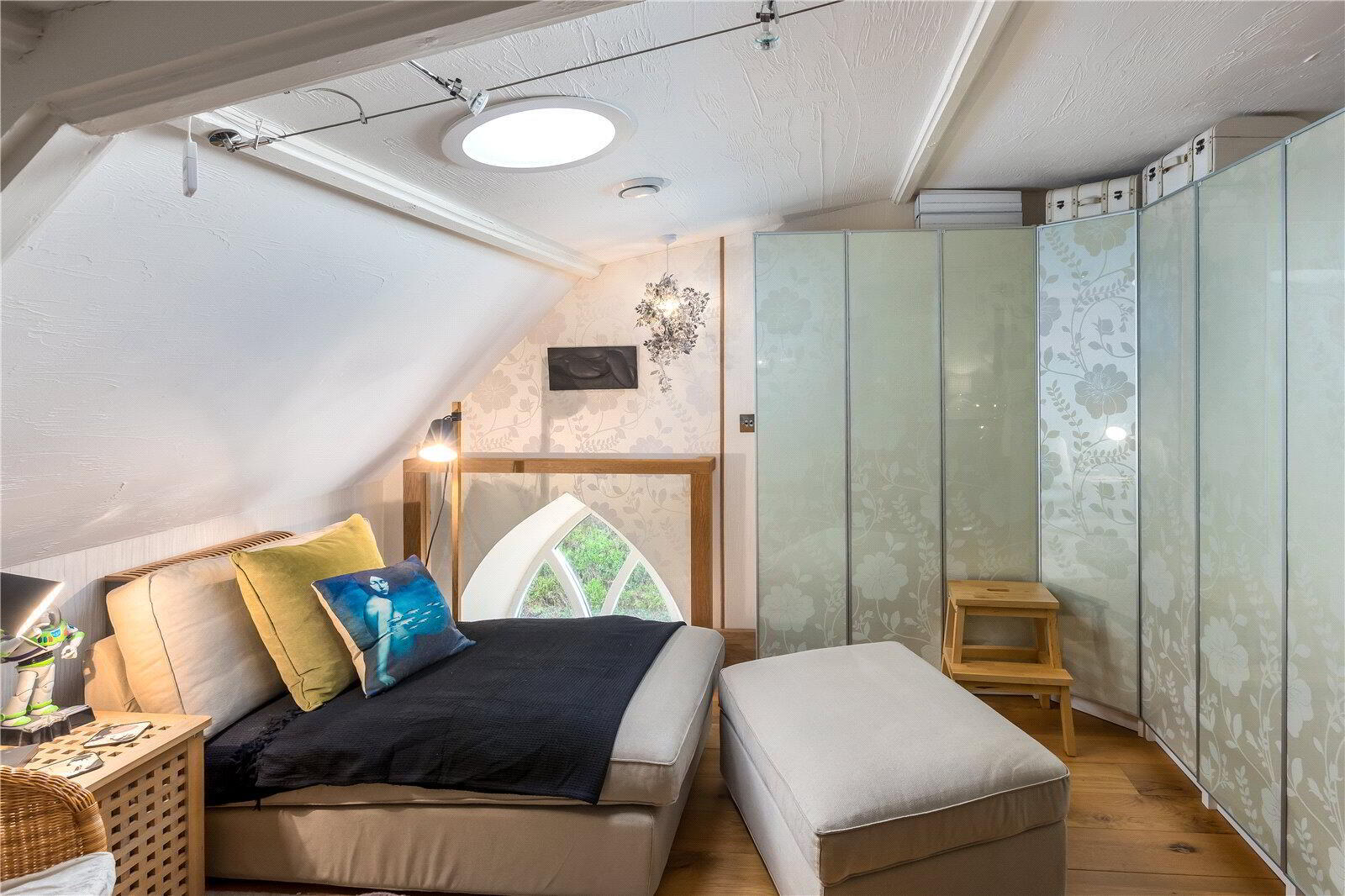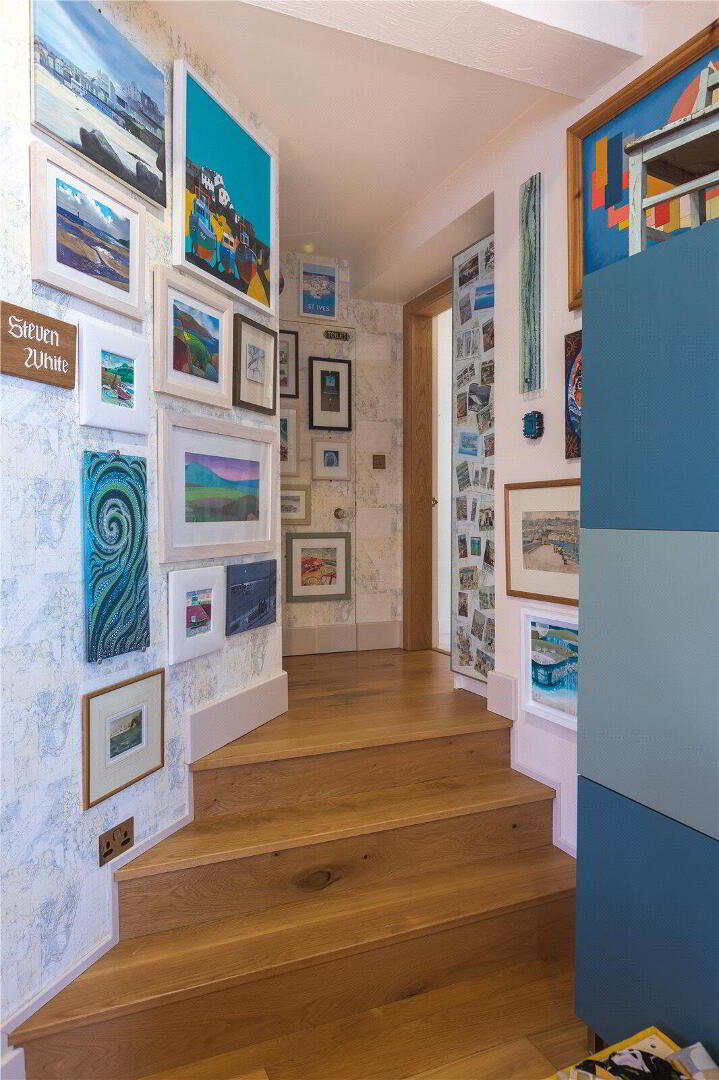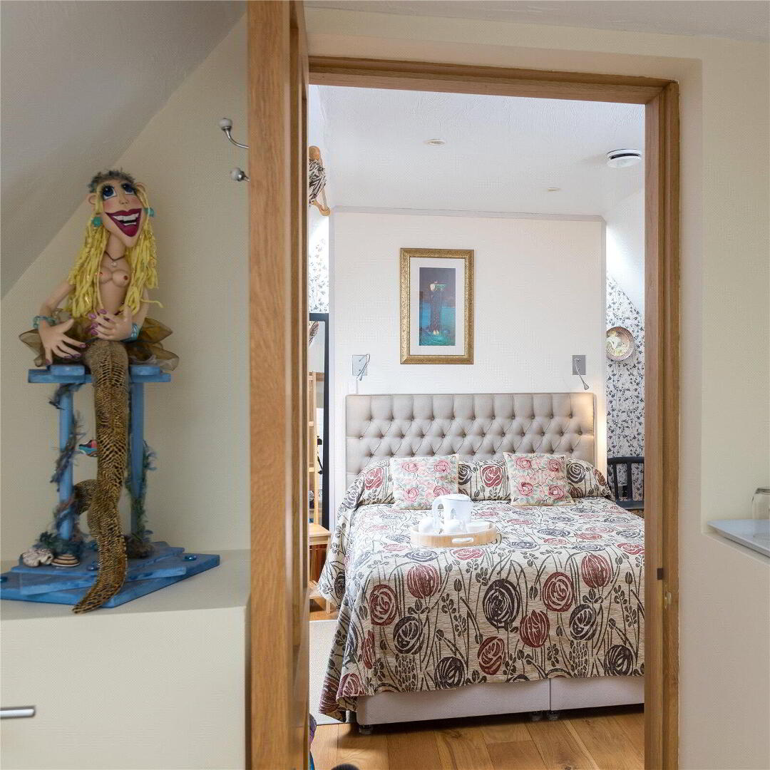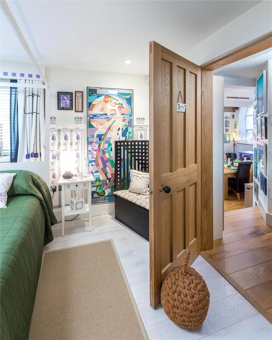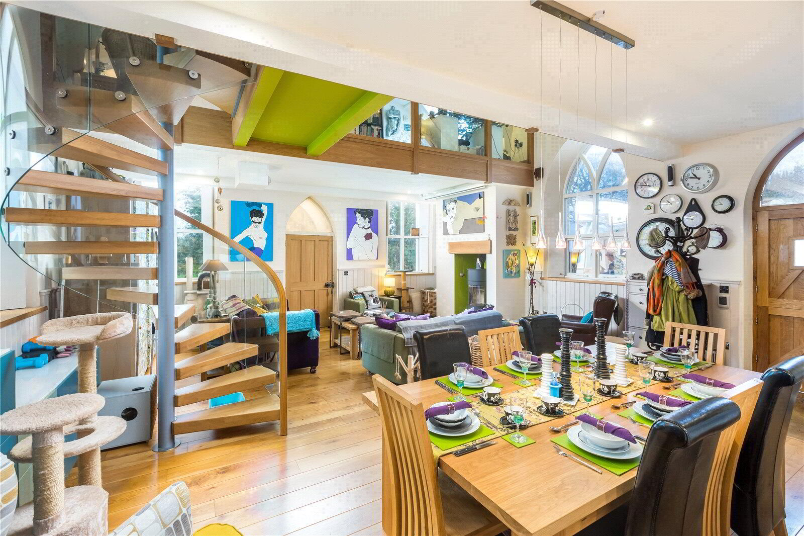 The architecturally designed conversion offers a generous open plan living/dining area, with steps to an open plan raised kitchen, allowing the host/hostess to cook and converse with friends and family when entertaining. Steps then lead up to a further reception room, or potential fourth bedroom. From the dining area, steps lead to a ground floor cloakroom and bedroom three with it’s own en suite shower room. A beautifully crafted oak and glass staircase then leads to the first floor landing and mezzanine, connected by a bridge which provides a large open area that currently utilised as a study area/ library. On the other side of the bridge there are two further bedrooms, both with en suite bathrooms.