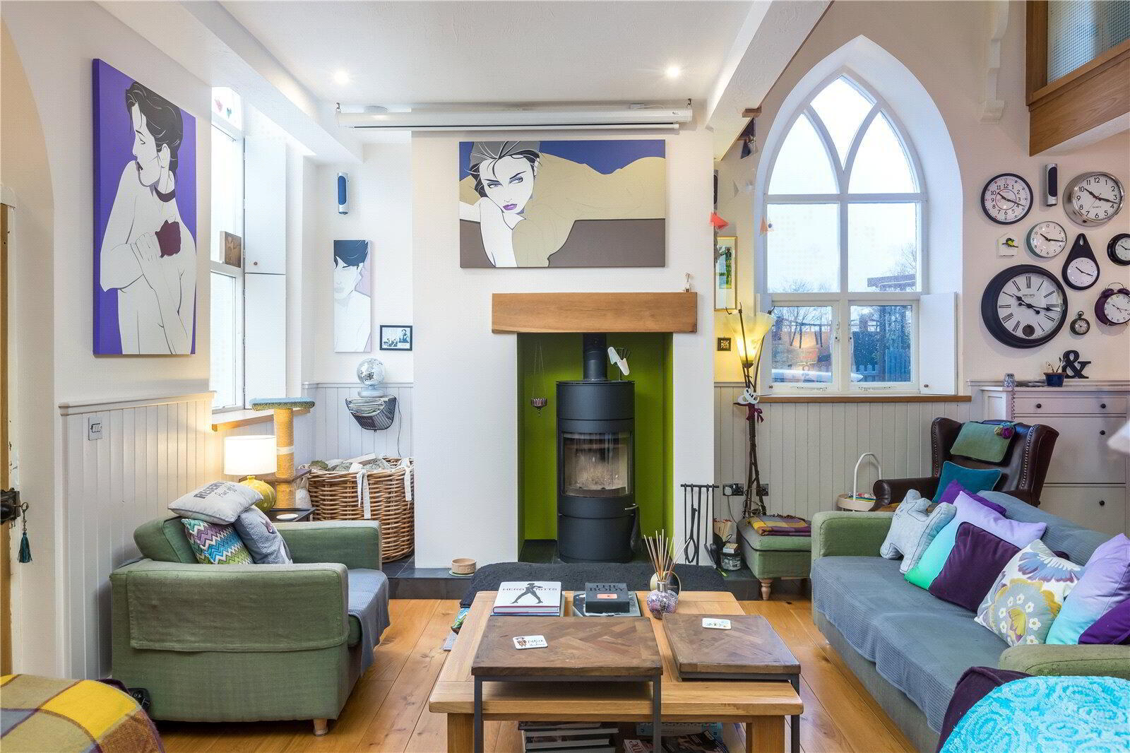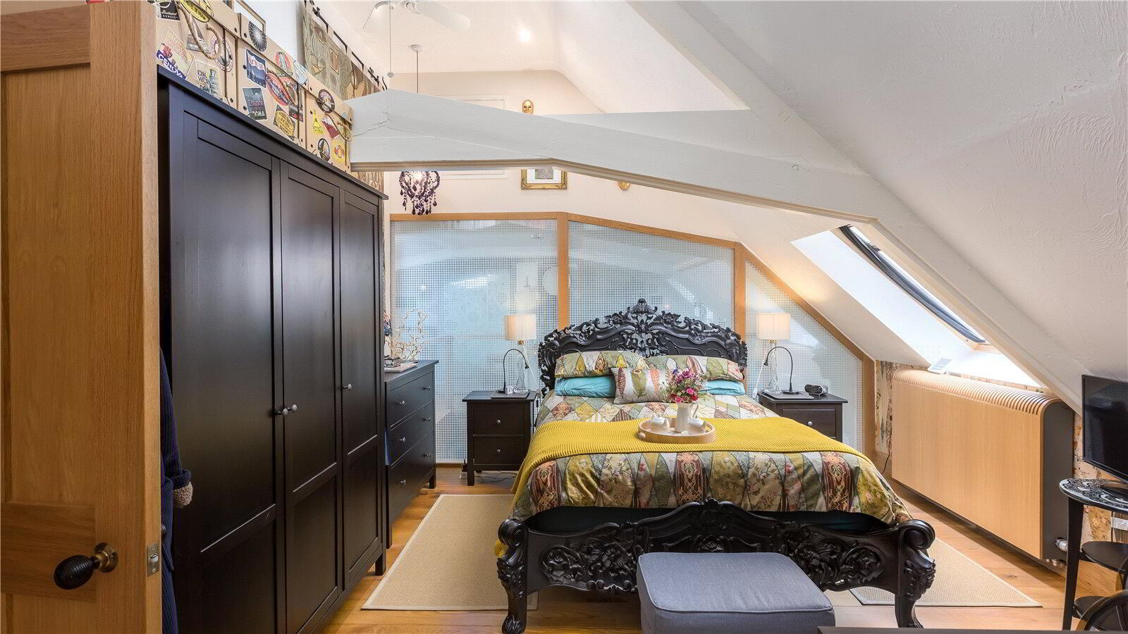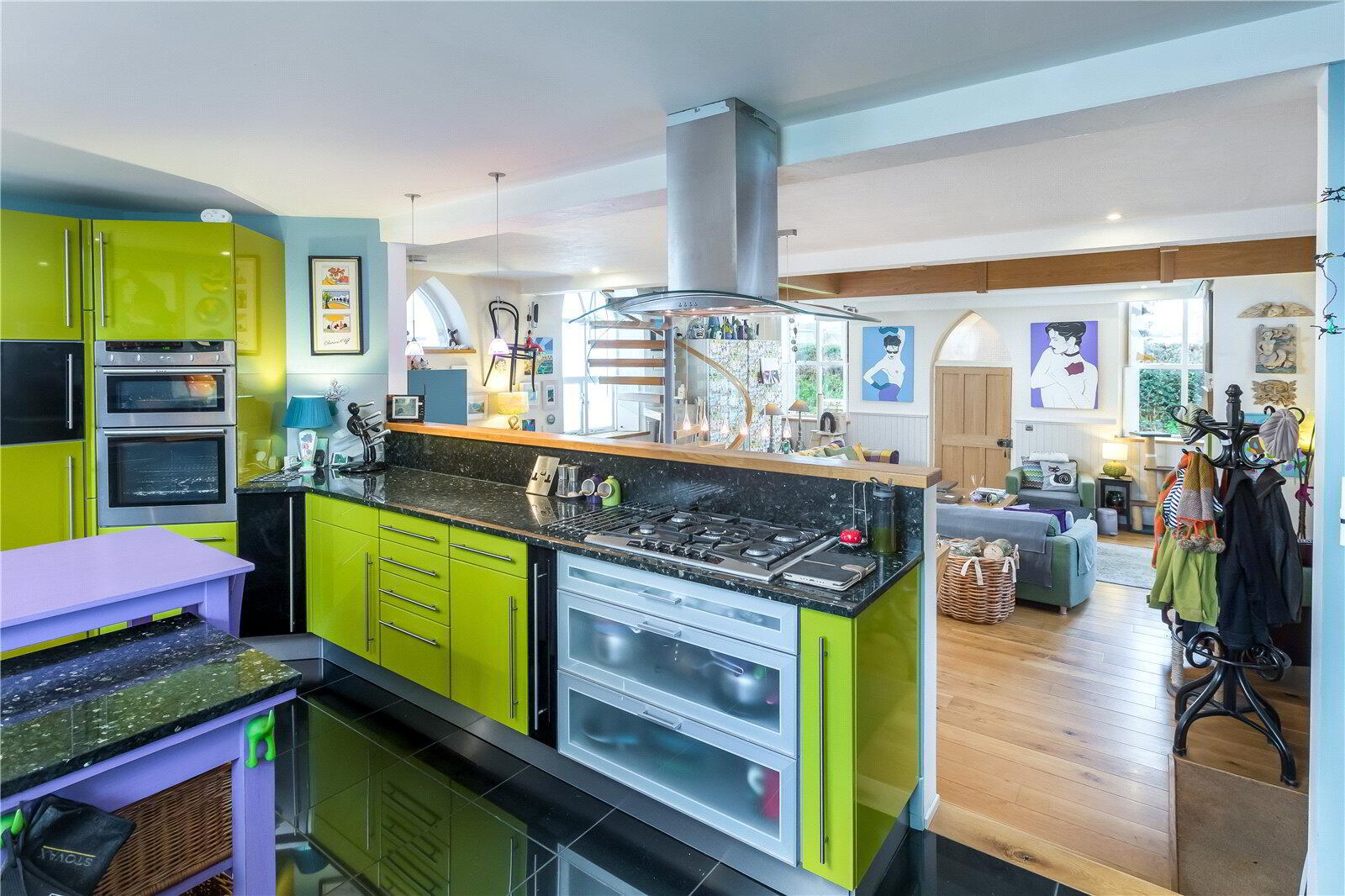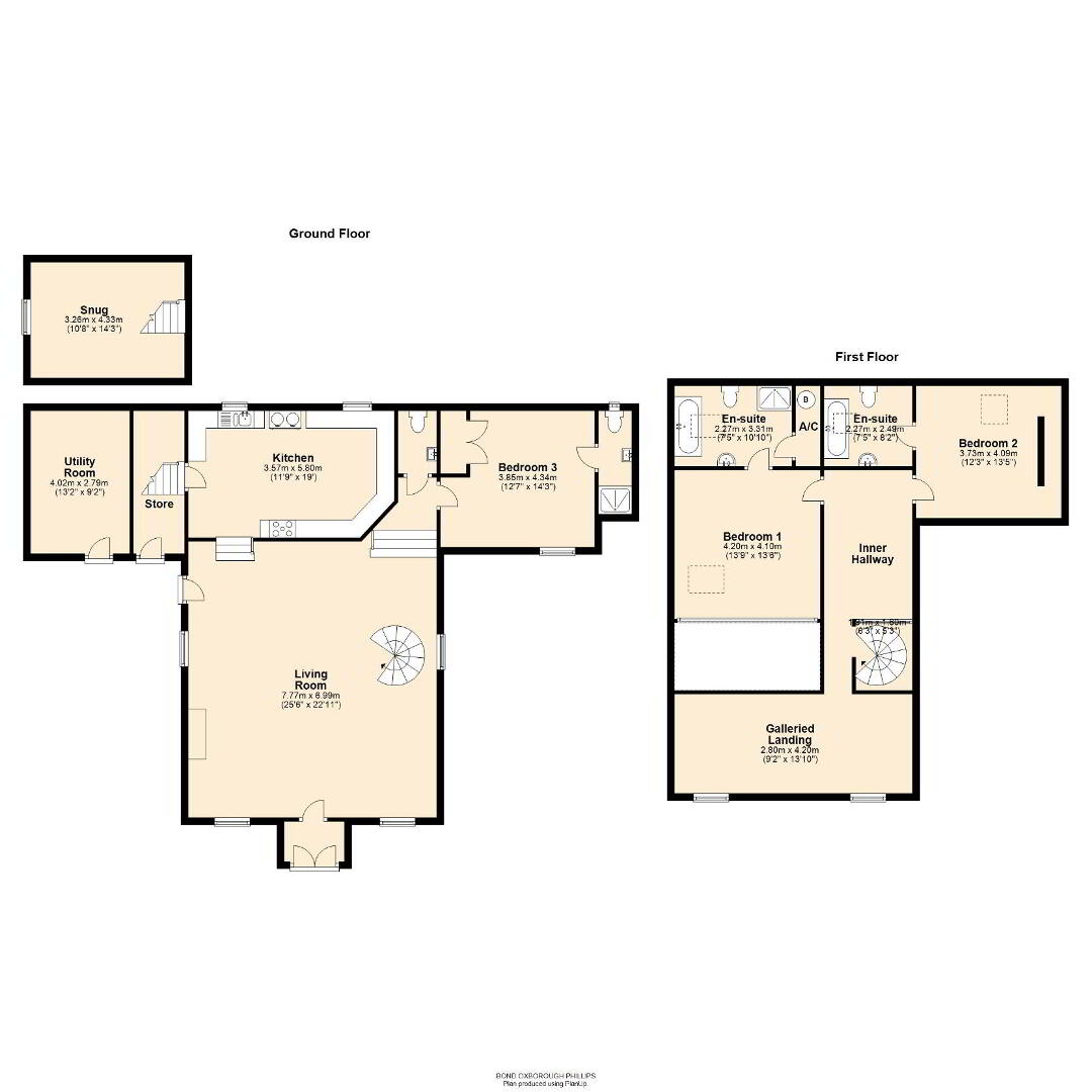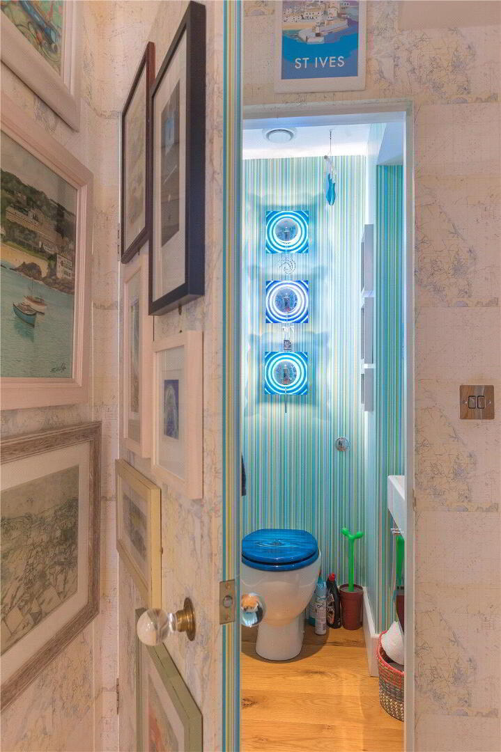 The architecturally designed conversion offers a generous open plan living/dining area, with steps to an open plan raised kitchen, allowing the host/hostess to cook and converse with friends and family when entertaining. Steps then lead up to a further reception room, or potential fourth bedroom. From the dining area, steps lead to a ground floor cloakroom and bedroom three with it’s own en suite shower room. A beautifully crafted oak and glass staircase then leads to the first floor landing and mezzanine, connected by a bridge which provides a large open area that currently utilised as a study area/ library. On the other side of the bridge there are two further bedrooms, both with en suite bathrooms.