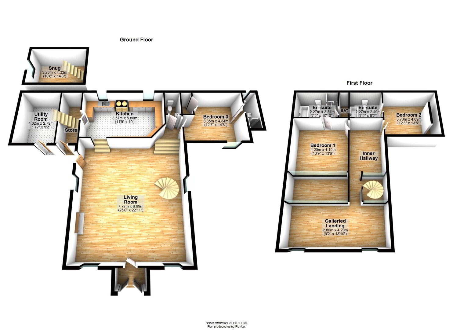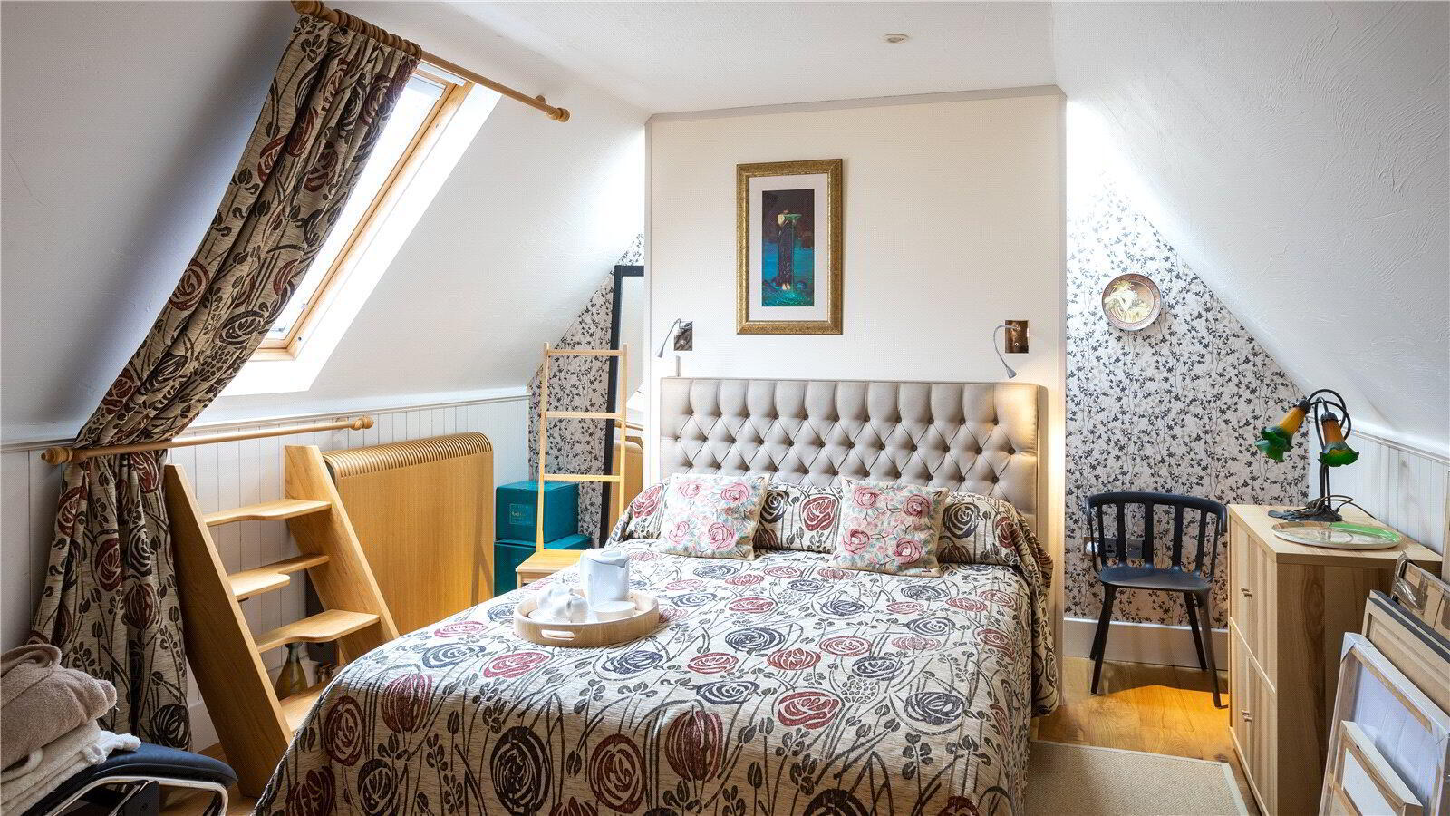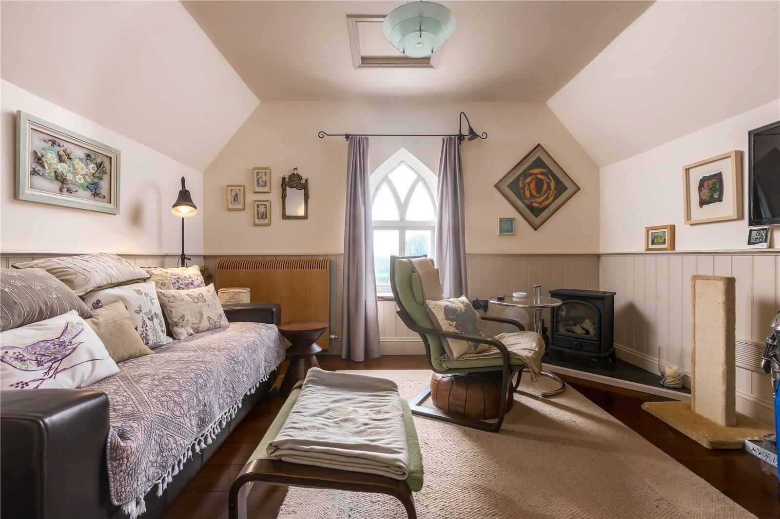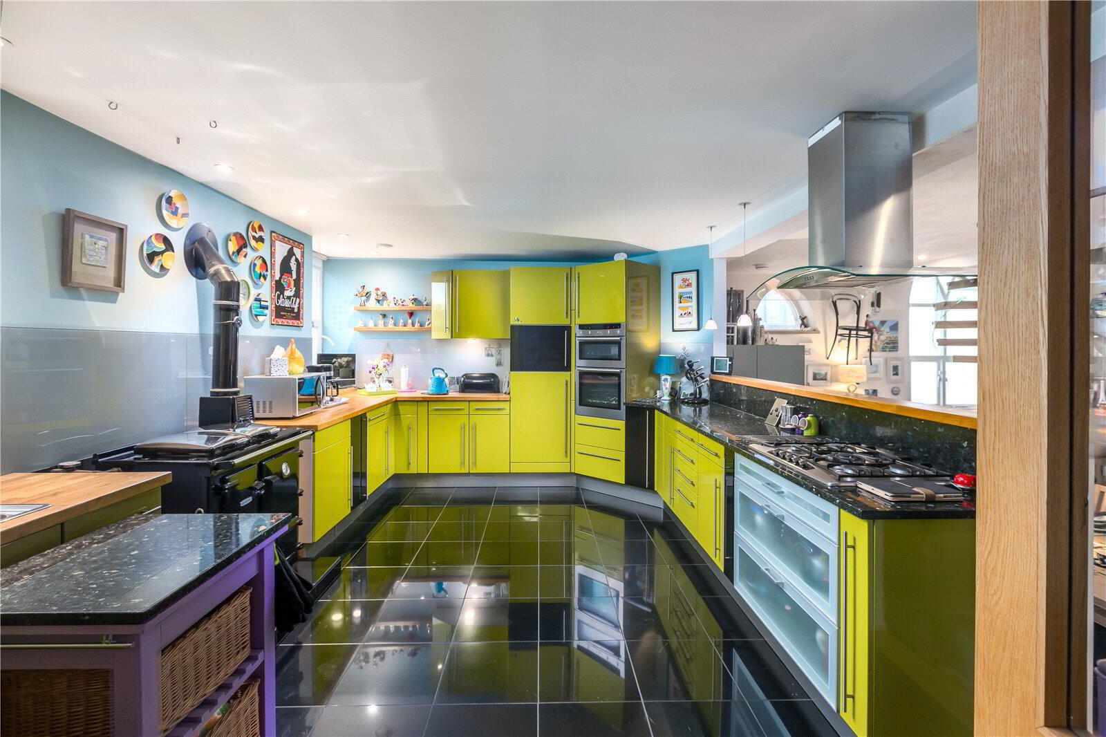 The architecturally designed conversion offers a generous open plan living/dining area, with steps to an open plan raised kitchen, allowing the host/hostess to cook and converse with friends and family when entertaining. Steps then lead up to a further reception room, or potential fourth bedroom. From the dining area, steps lead to a ground floor cloakroom and bedroom three with it’s own en suite shower room. A beautifully crafted oak and glass staircase then leads to the first floor landing and mezzanine, connected by a bridge which provides a large open area that currently utilised as a study area/ library. On the other side of the bridge there are two further bedrooms, both with en suite bathrooms.