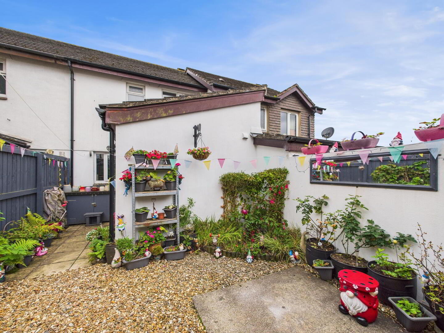 Externally, the rear garden is enclosed and designed for low-maintenance enjoyment. A tiled patio and gravelled seating area provide a perfect setting for outdoor dining, relaxing, or entertaining, while a gate at the rear allows access to the allocated parking space for added convenience.