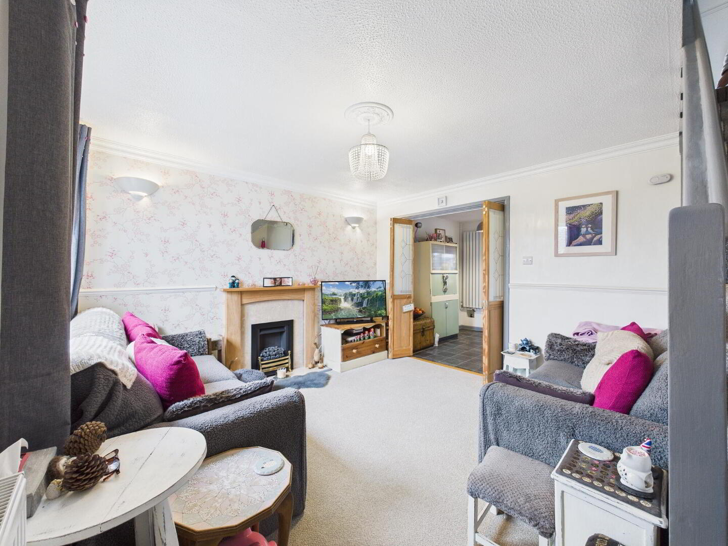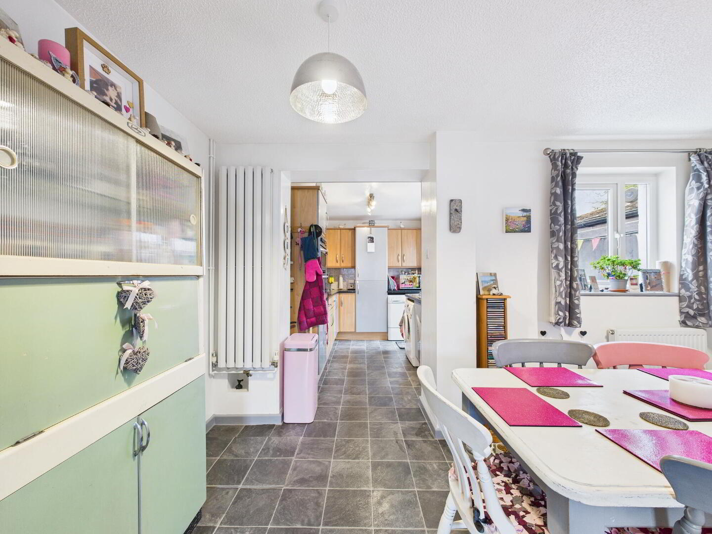 The ground floor provides a welcoming and comfortable layout, beginning with a bright sitting room that features a coal-effect gas fire set within an attractive decorative surround with a marble-style hearth. This room flows seamlessly into an open-plan dining area, perfect for everyday family use, entertaining guests, or even as a study or home office space if required. The arrangement ensures a versatile living environment that can adapt to your needs.