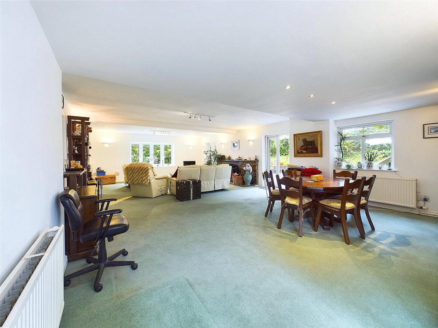 Ascend to the first floor, where the master suite serves as a tranquil sanctuary. This spacious bedroom features an elegant en-suite bathroom and opens onto a private balcony that overlooks the sprawling gardens, offering a serene escape. Four additional bedrooms, each with its own character and charm, provide flexibility to accommodate family, guests, or additional workspaces. Three luxurious bathrooms ensure every comfort is met, while the potential for a fifth bedroom or office enhances the home’s versatility.