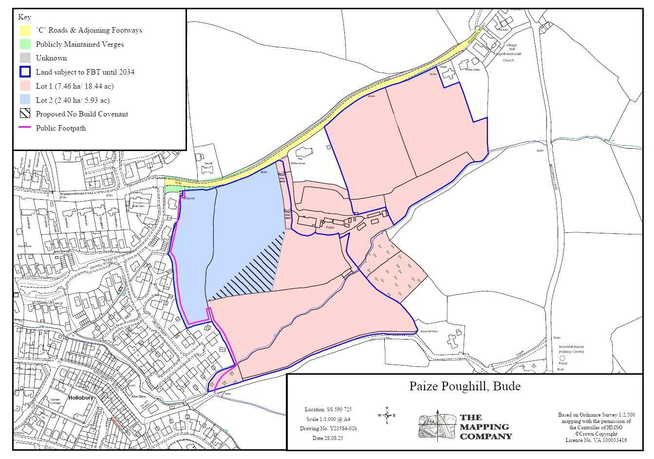 The Property is on the eastern edge of Bude, with a current agricultural access onto the main road, as well as a Public Right of Way on the western boundary running through it. There is significant road frontage and adjoins the built up form of Bude on the western boundary as the Plan indicates. It is located within the popular coastal town of Bude, which has an extensive range of shopping, schooling and recreational facilities The current population of Bude is 10,600 (2021 census). The Land slopes to the south, with a mature tree lined hedge bisecting the 2 fields, and has most recently been used for grazing. Lot 2 (and part of Lot 1 – Paize House) are subject to an existing Farm Business Tenancy, which expires 1st May 2034, at an verall annual rent of £1,000 pa.