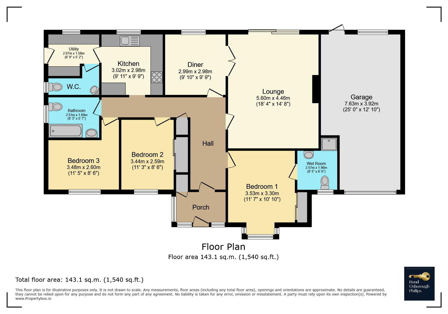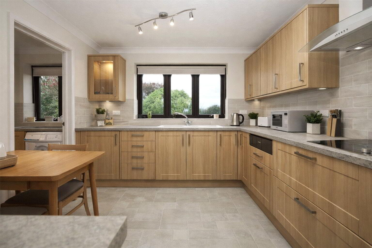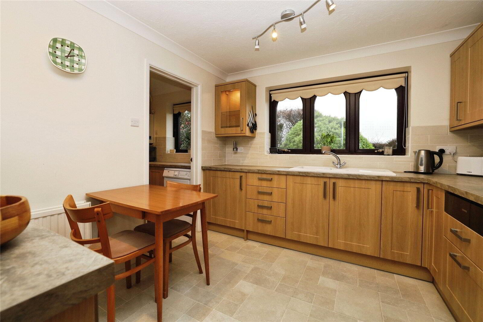 The Kitchen is fitted with a range of wood effect base units with matching drawers, a built-in oven and hob with extractor over, and a contemporary sink positioned beneath a window overlooking the garden. There is also space for a breakfast table, making this a sociable and practical room. A useful adjoining Utility Room provides space and plumbing for appliances, houses the LPG fired boiler, offers access to the rear garden and also includes a Cloakroom.